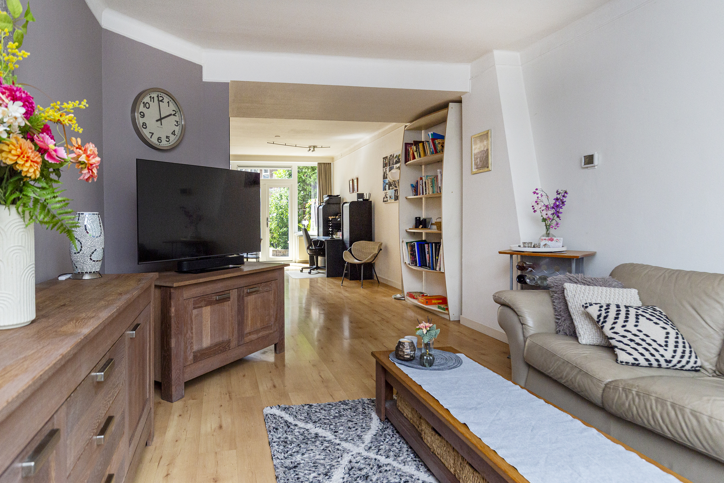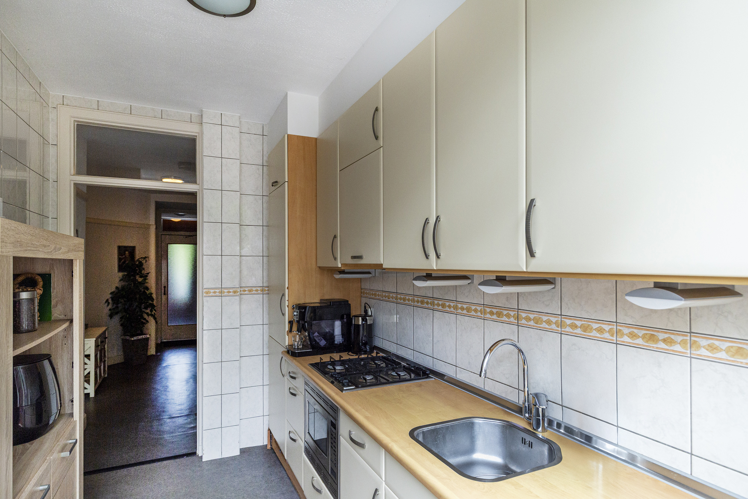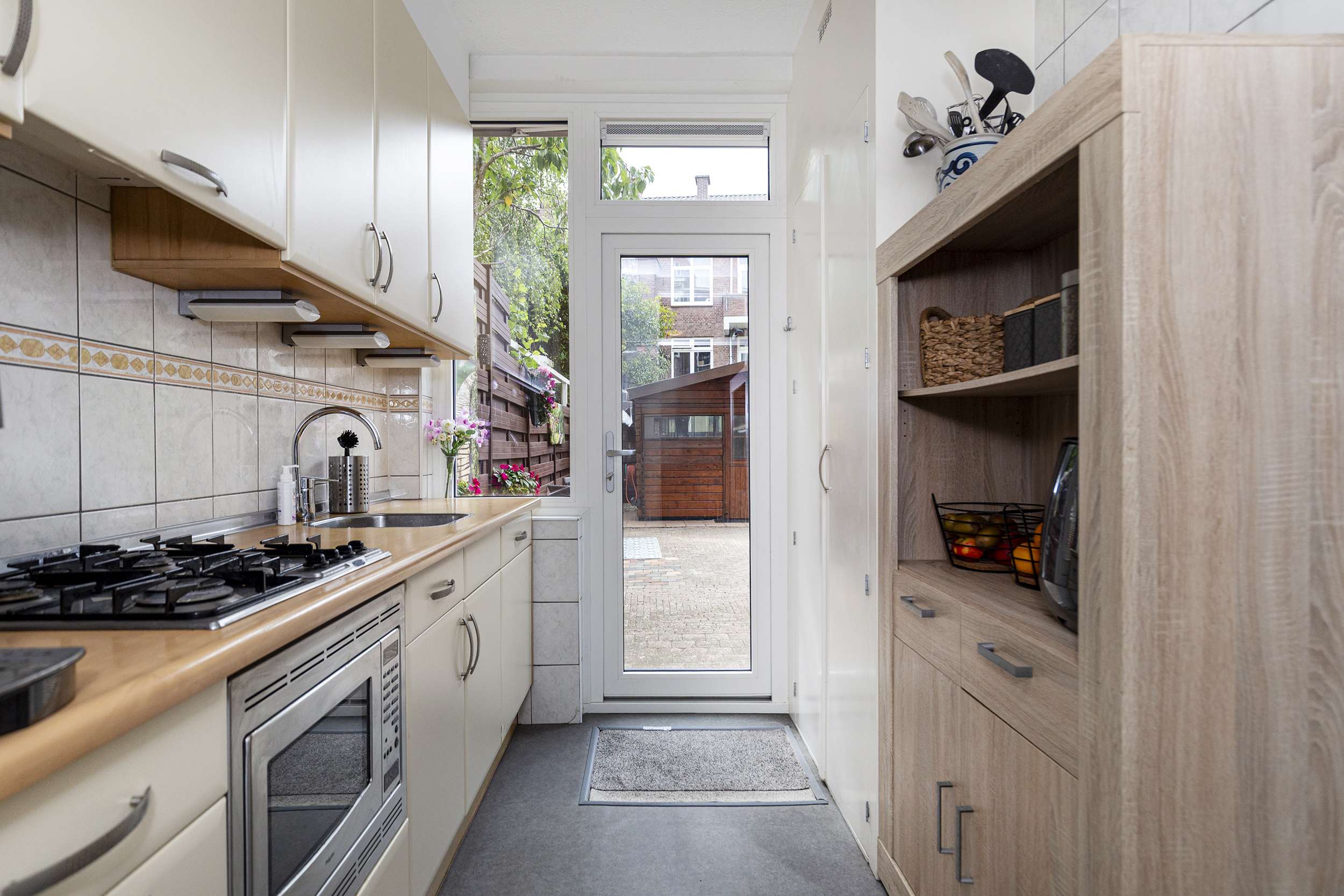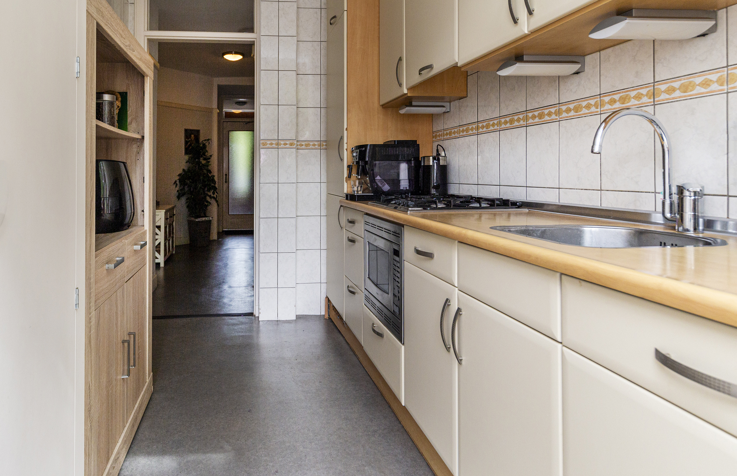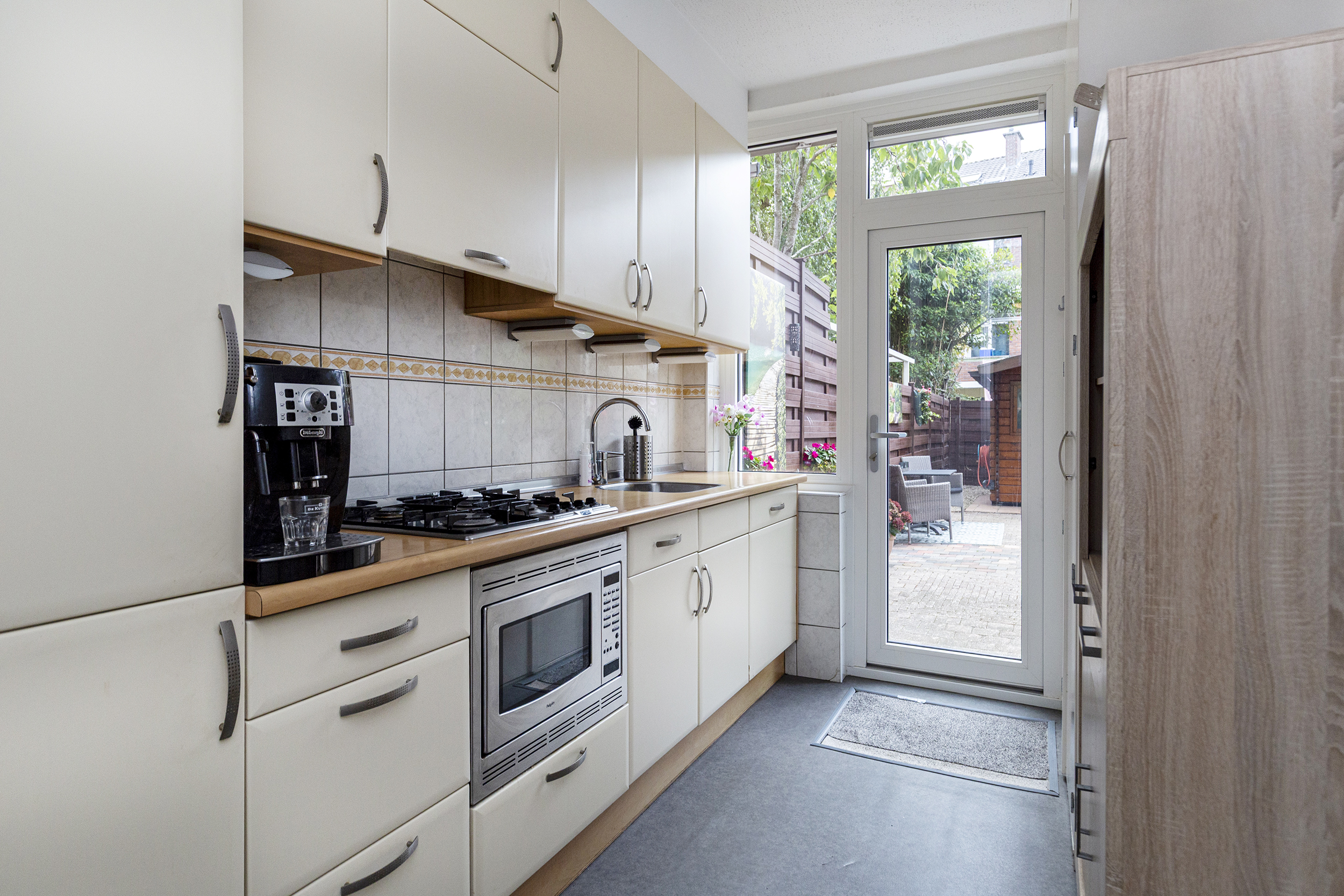 De doorlichtwoonkamer is een prettige leefruimte met veel licht en een charmante erker, een heerlijke plek om rustig te zitten met een boek of een kop koffie. Via twee openslaande deuren stap je zo de ruime, betegelde achtertuin in. Ook vanuit de keuken stap je de tuin in. De keuken is functioneel uitgerust met inbouwapparatuur: combioven magnetron, 4 pits gaskookplaat, afzuiger, koelkast en vriezer.