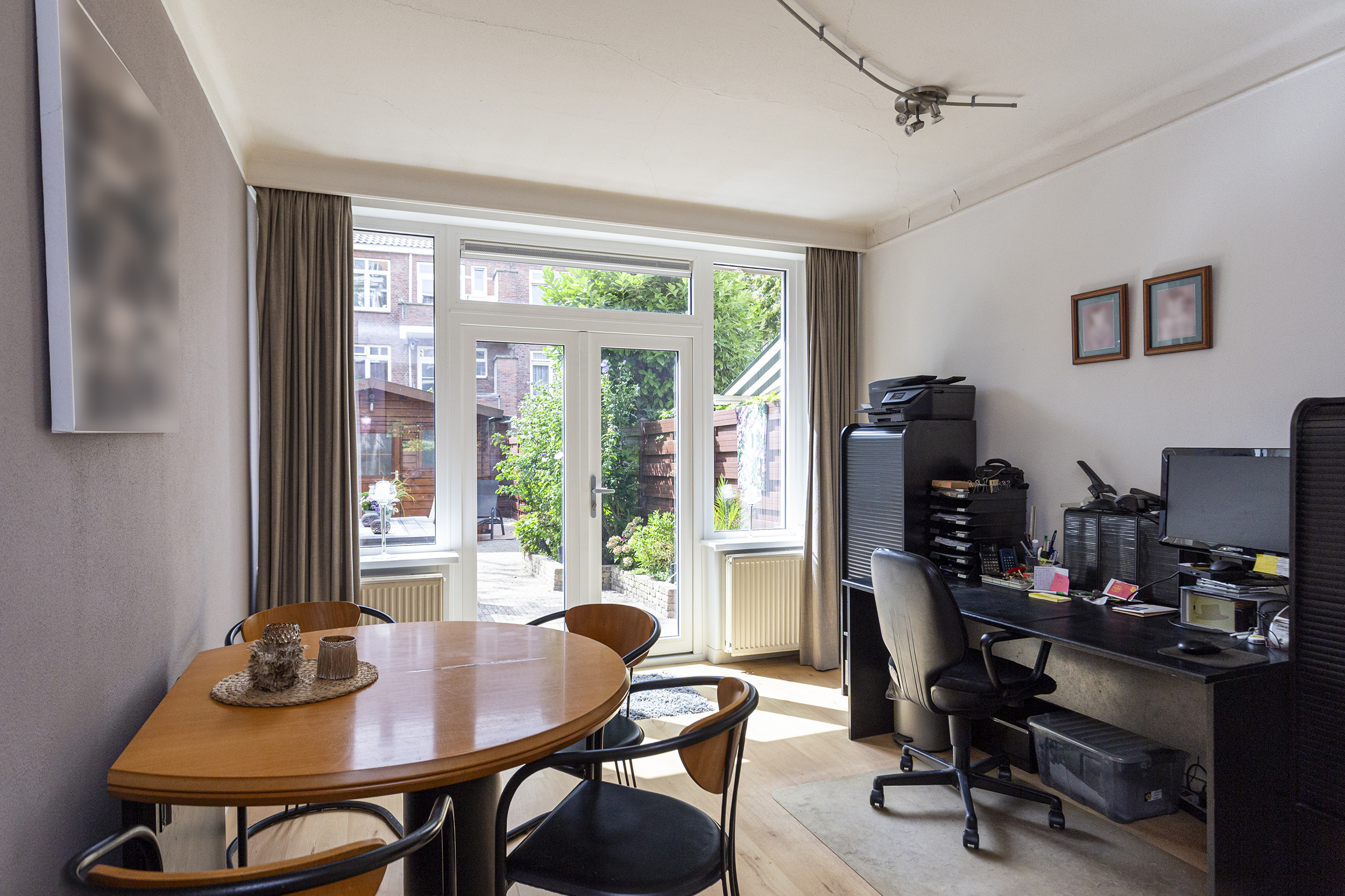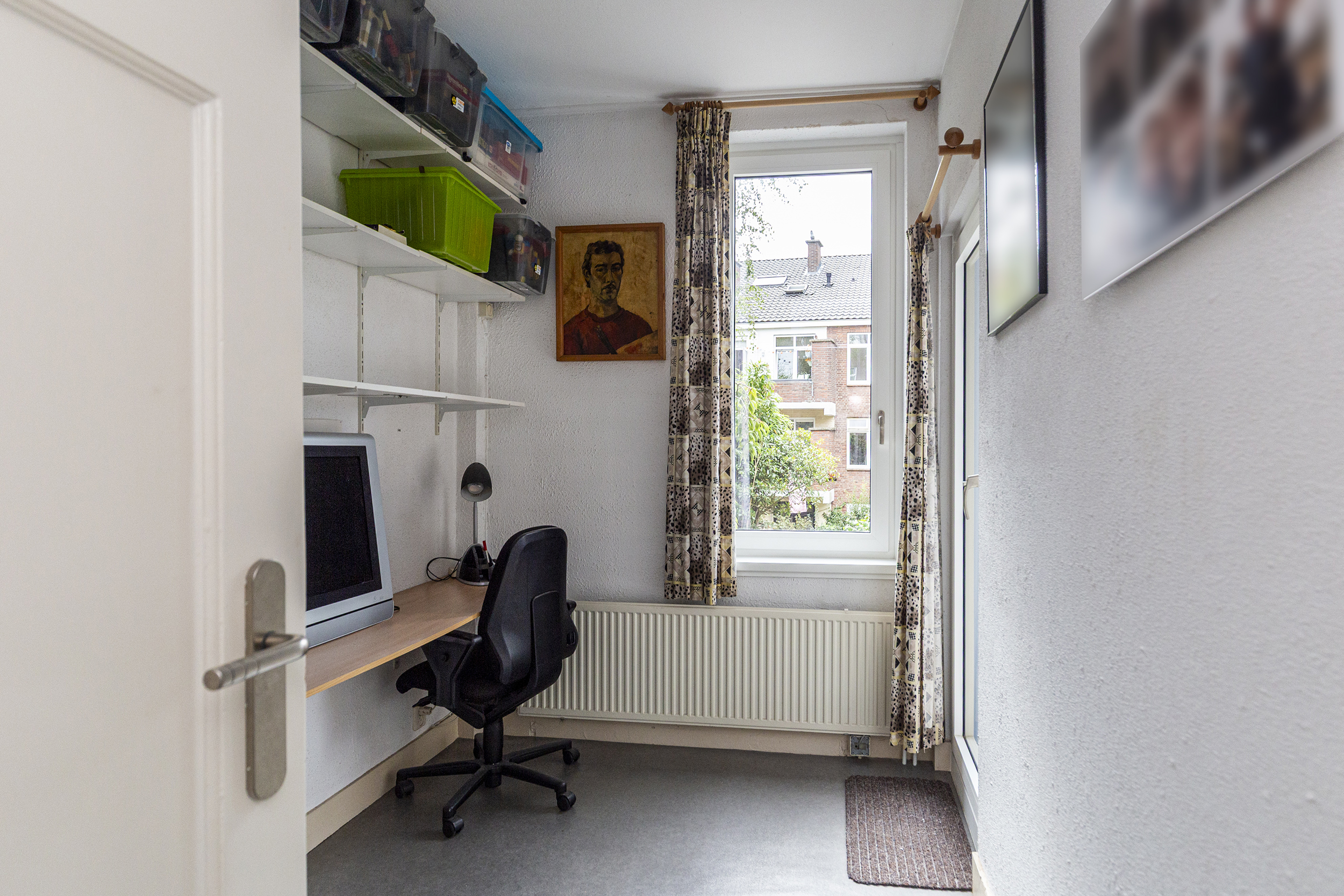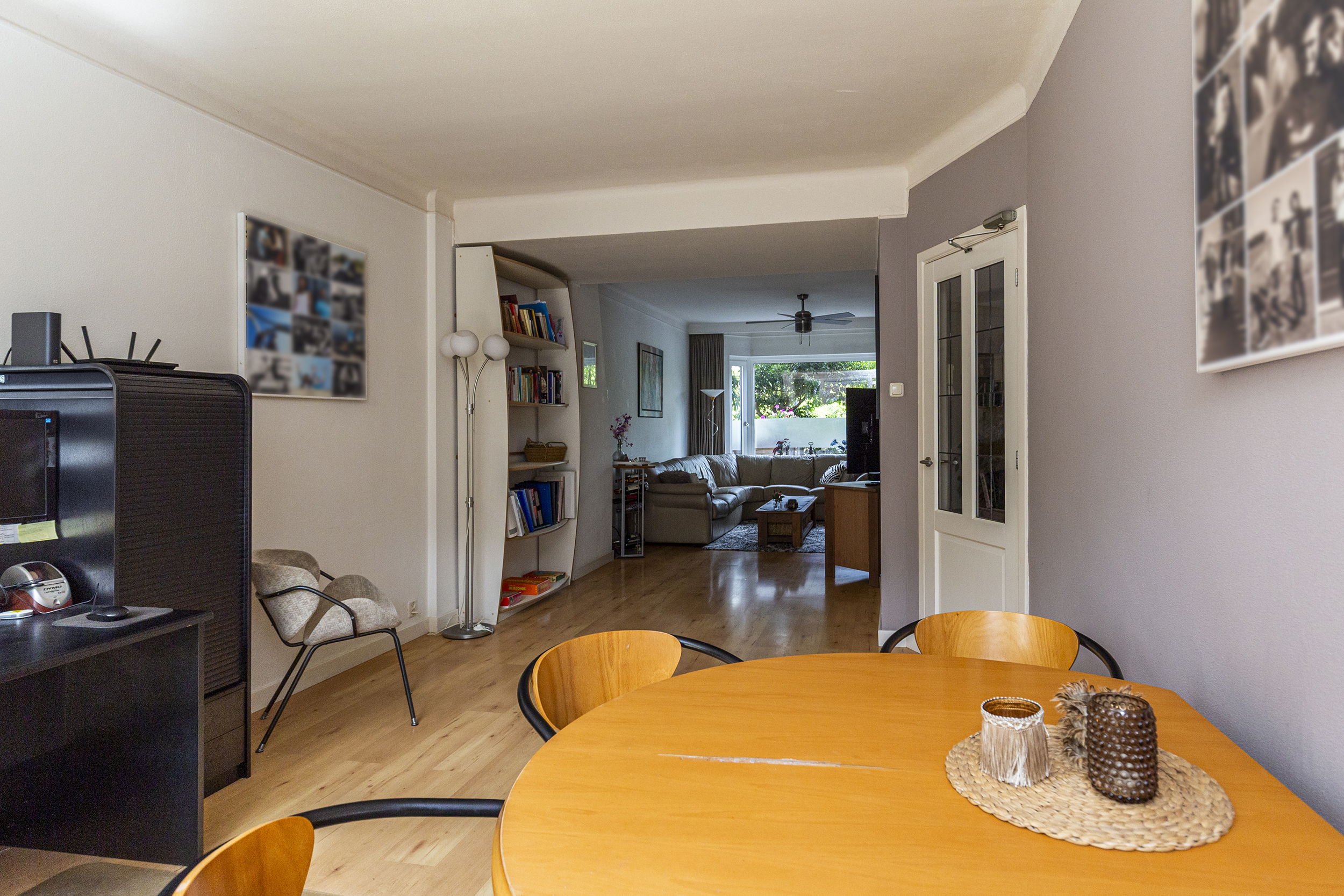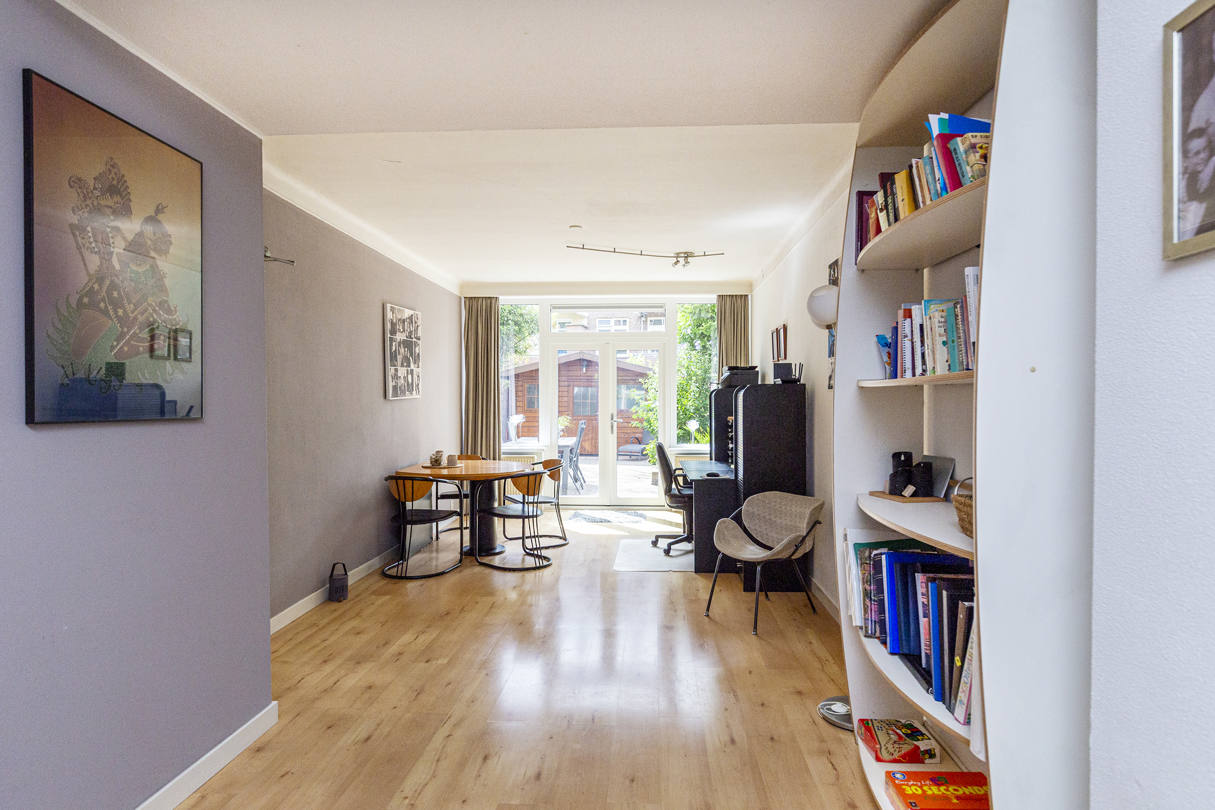 De doorlichtwoonkamer is een prettige leefruimte met veel licht en een charmante erker, een heerlijke plek om rustig te zitten met een boek of een kop koffie. Via twee openslaande deuren stap je zo de ruime, betegelde achtertuin in. Ook vanuit de keuken stap je de tuin in. De keuken is functioneel uitgerust met inbouwapparatuur: combioven magnetron, 4 pits gaskookplaat, afzuiger, koelkast en vriezer.