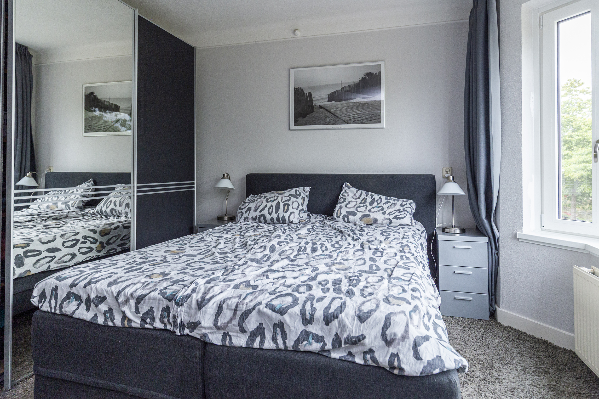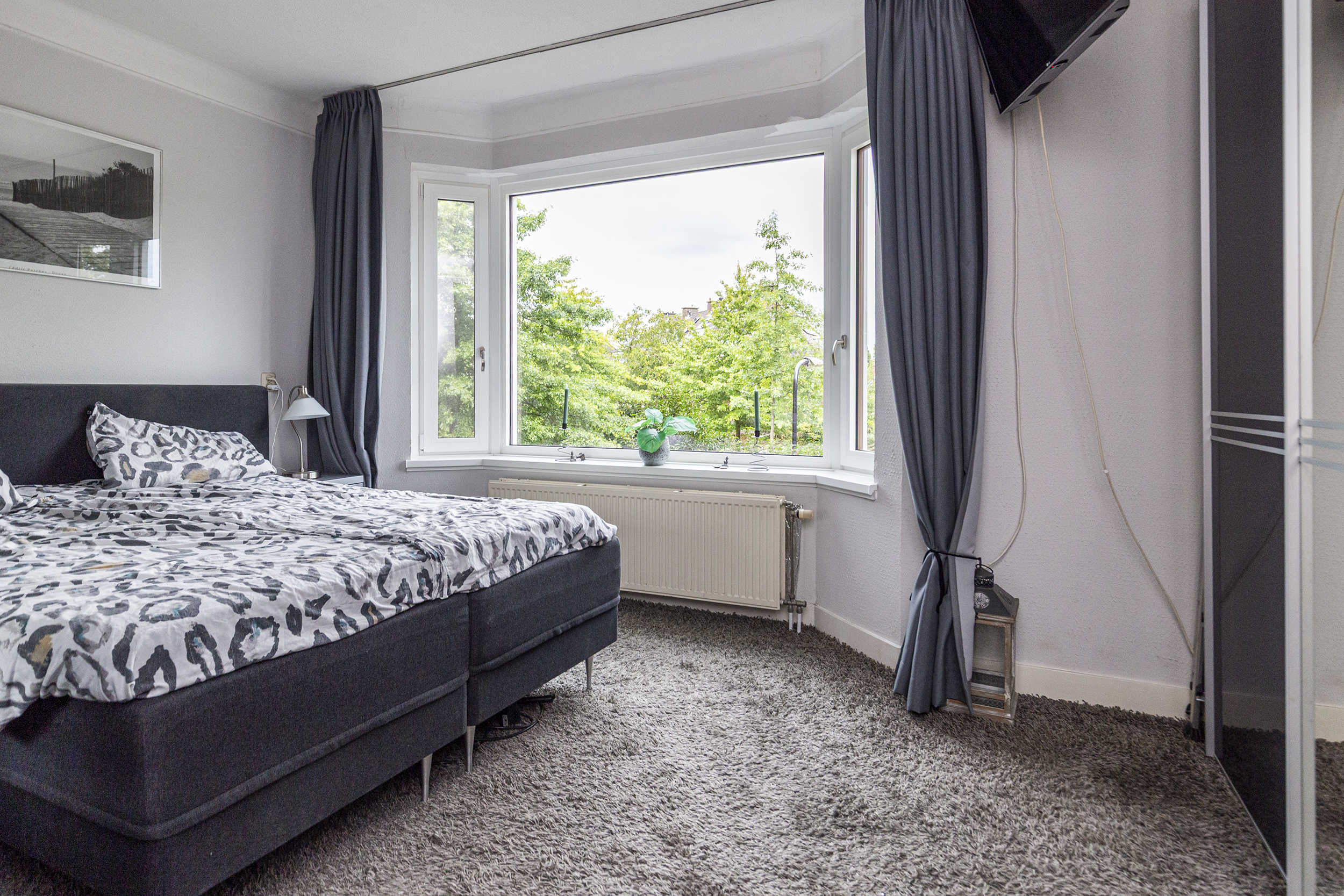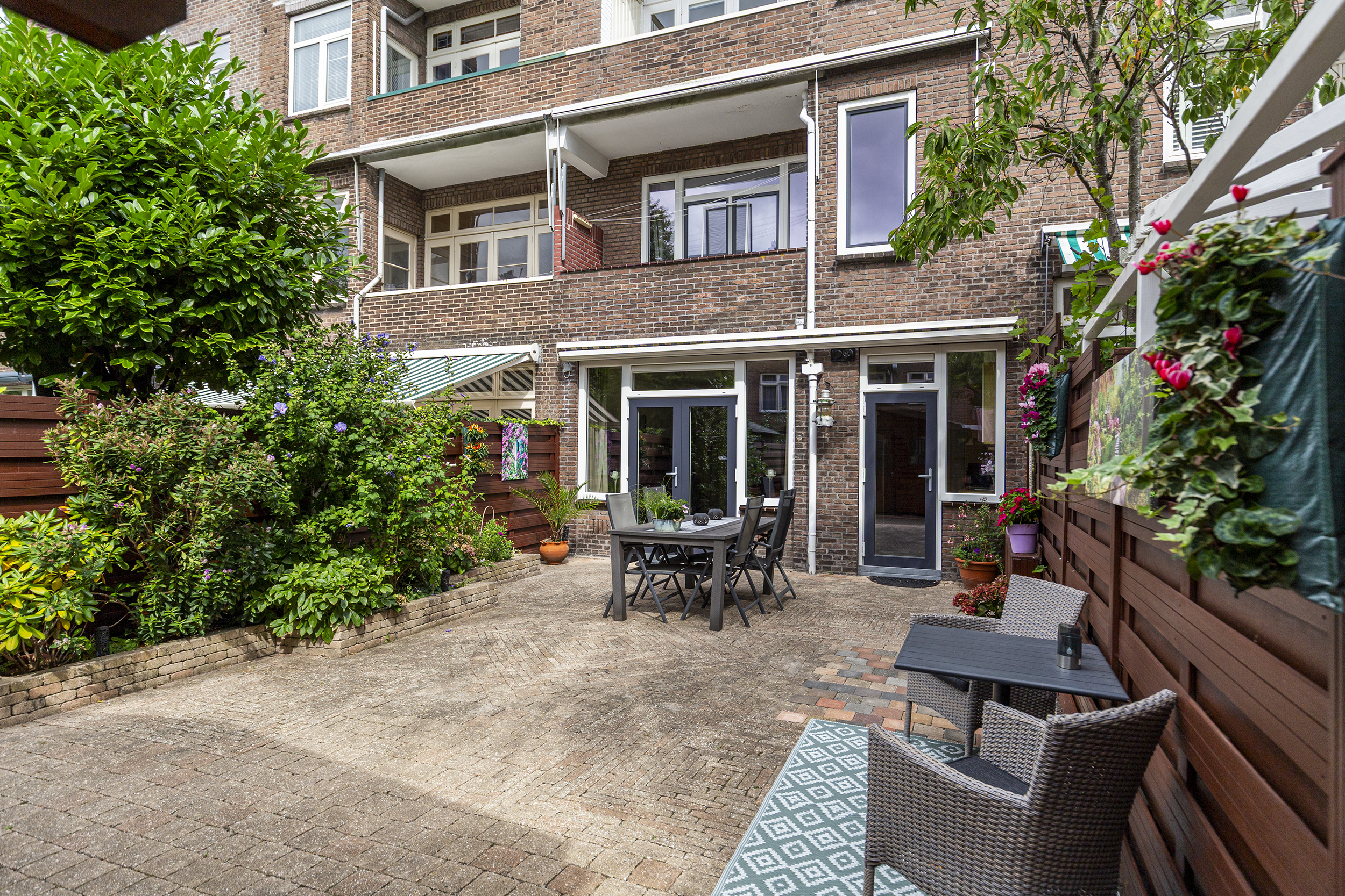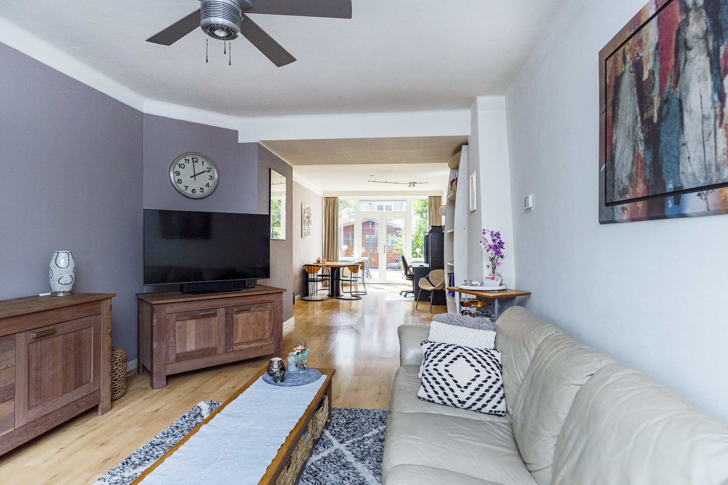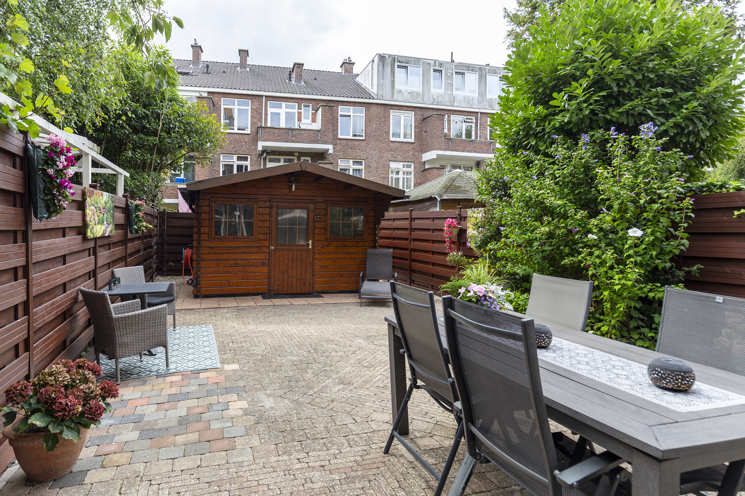 De doorlichtwoonkamer is een prettige leefruimte met veel licht en een charmante erker, een heerlijke plek om rustig te zitten met een boek of een kop koffie. Via twee openslaande deuren stap je zo de ruime, betegelde achtertuin in. Ook vanuit de keuken stap je de tuin in. De keuken is functioneel uitgerust met inbouwapparatuur: combioven magnetron, 4 pits gaskookplaat, afzuiger, koelkast en vriezer.