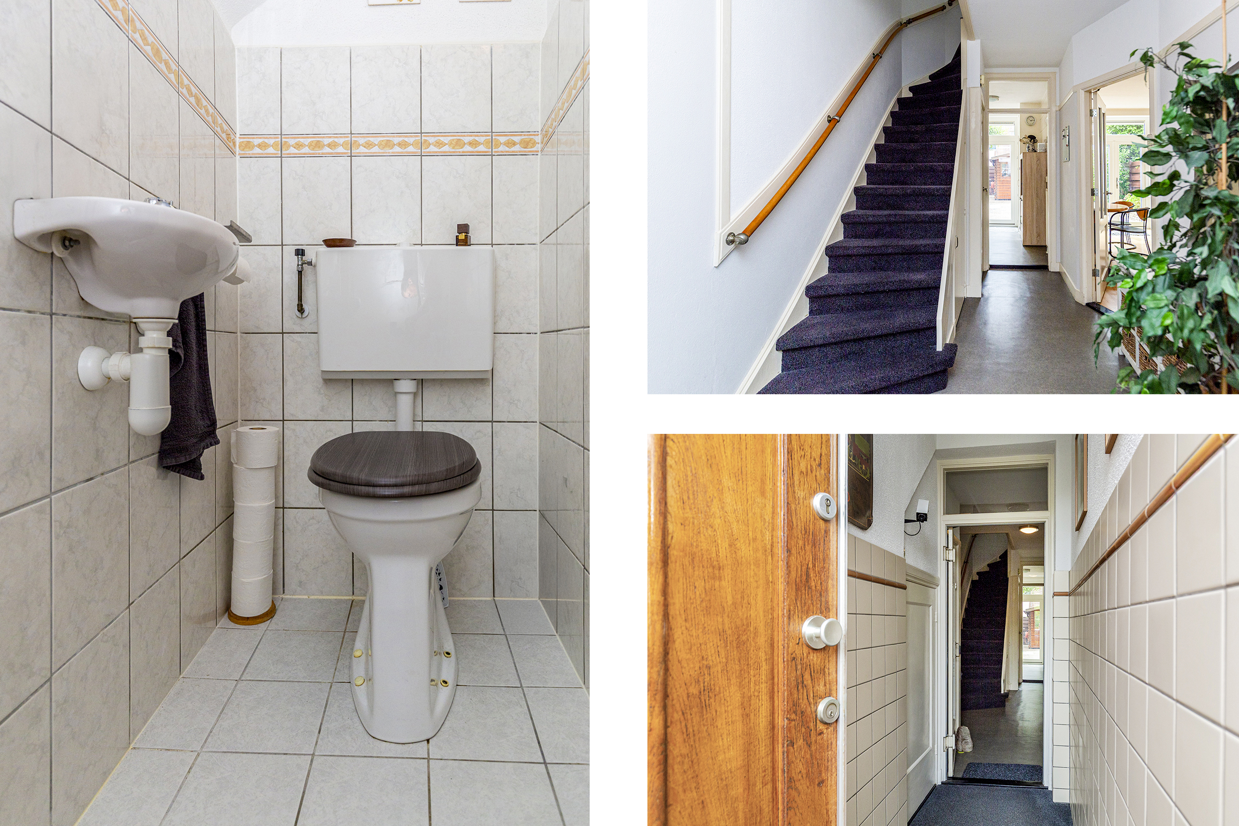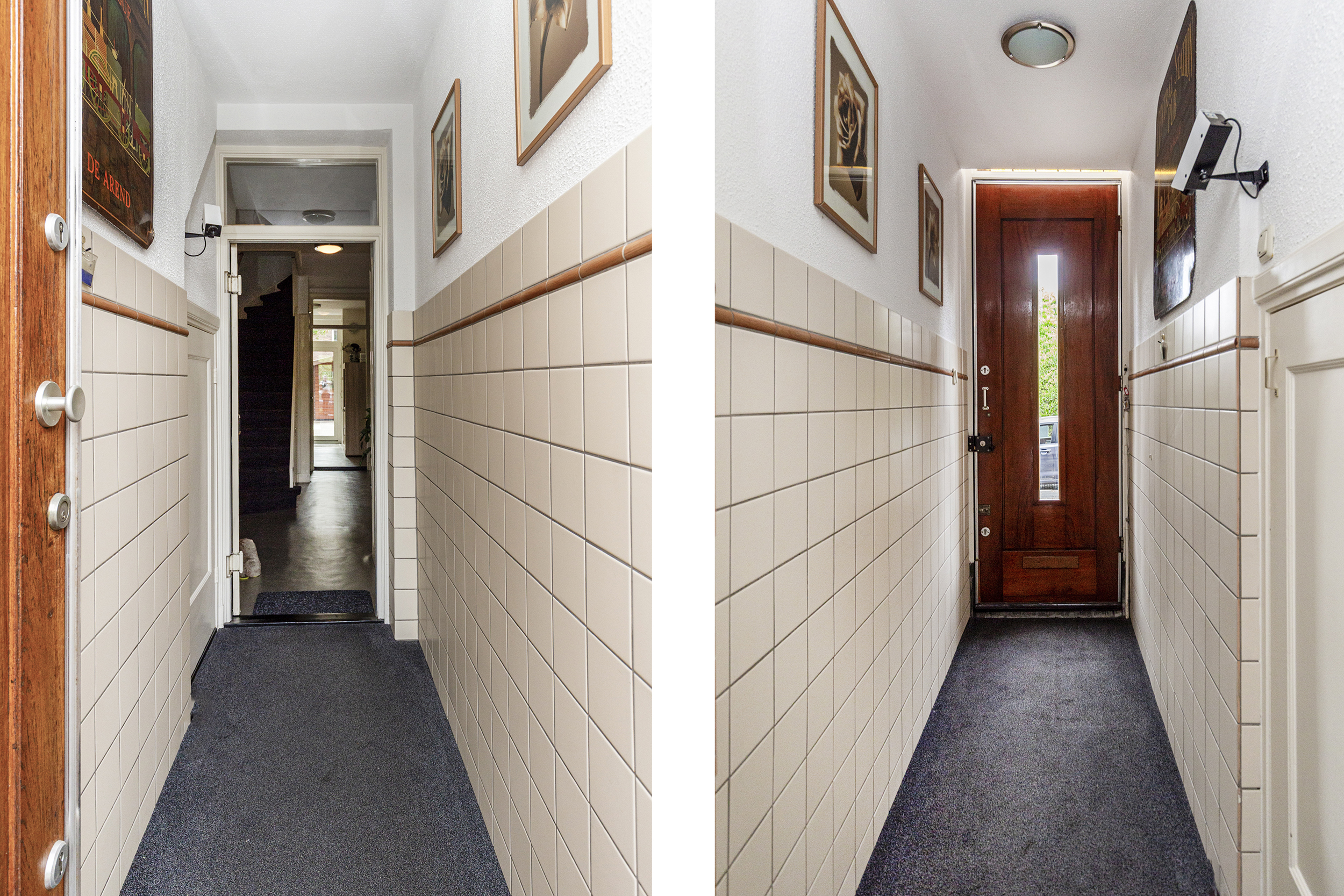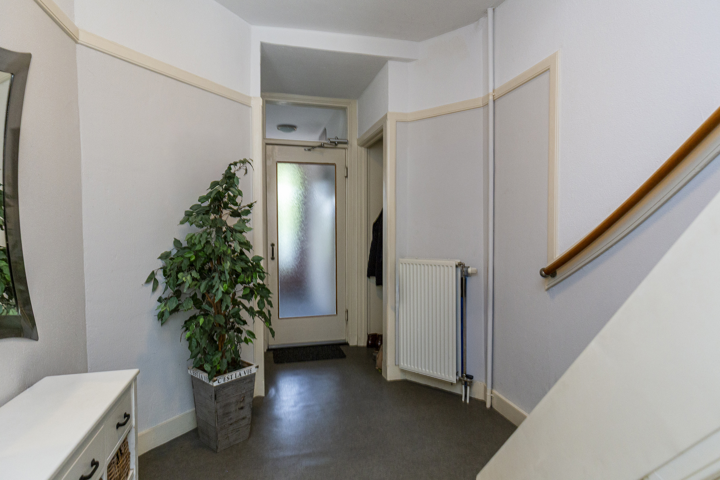 Je betreedt het huis via de verzorgde voortuin. In de hal vind je de meterkast, daarna volgt een tweede hal met trapkast en de trap naar boven. Vanuit deze centrale ruimte bereik je zowel de woonkamer als de keuken.