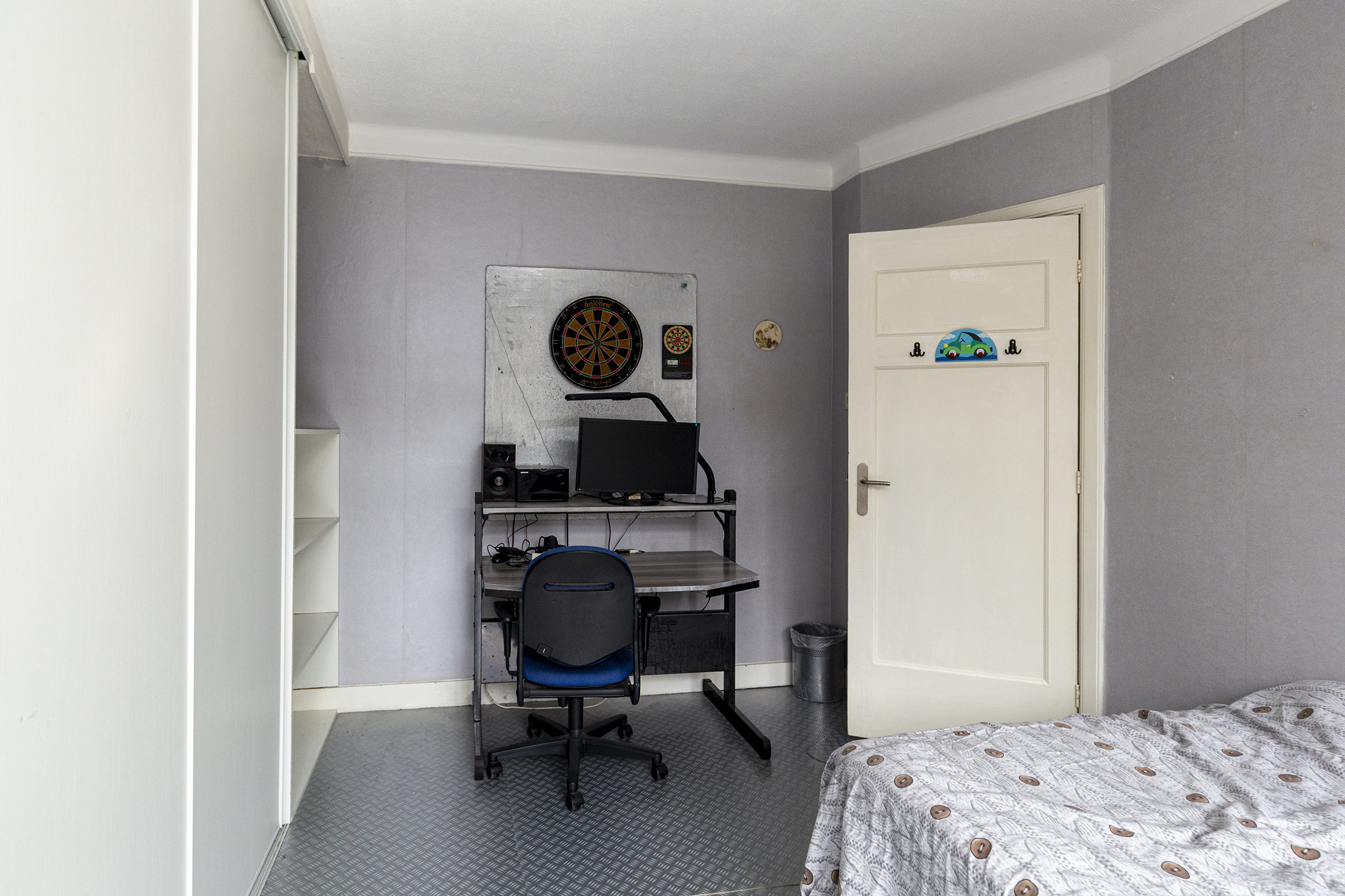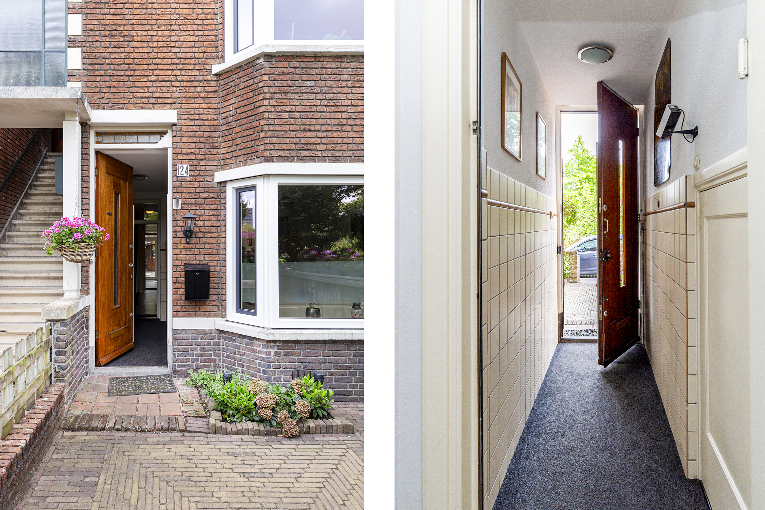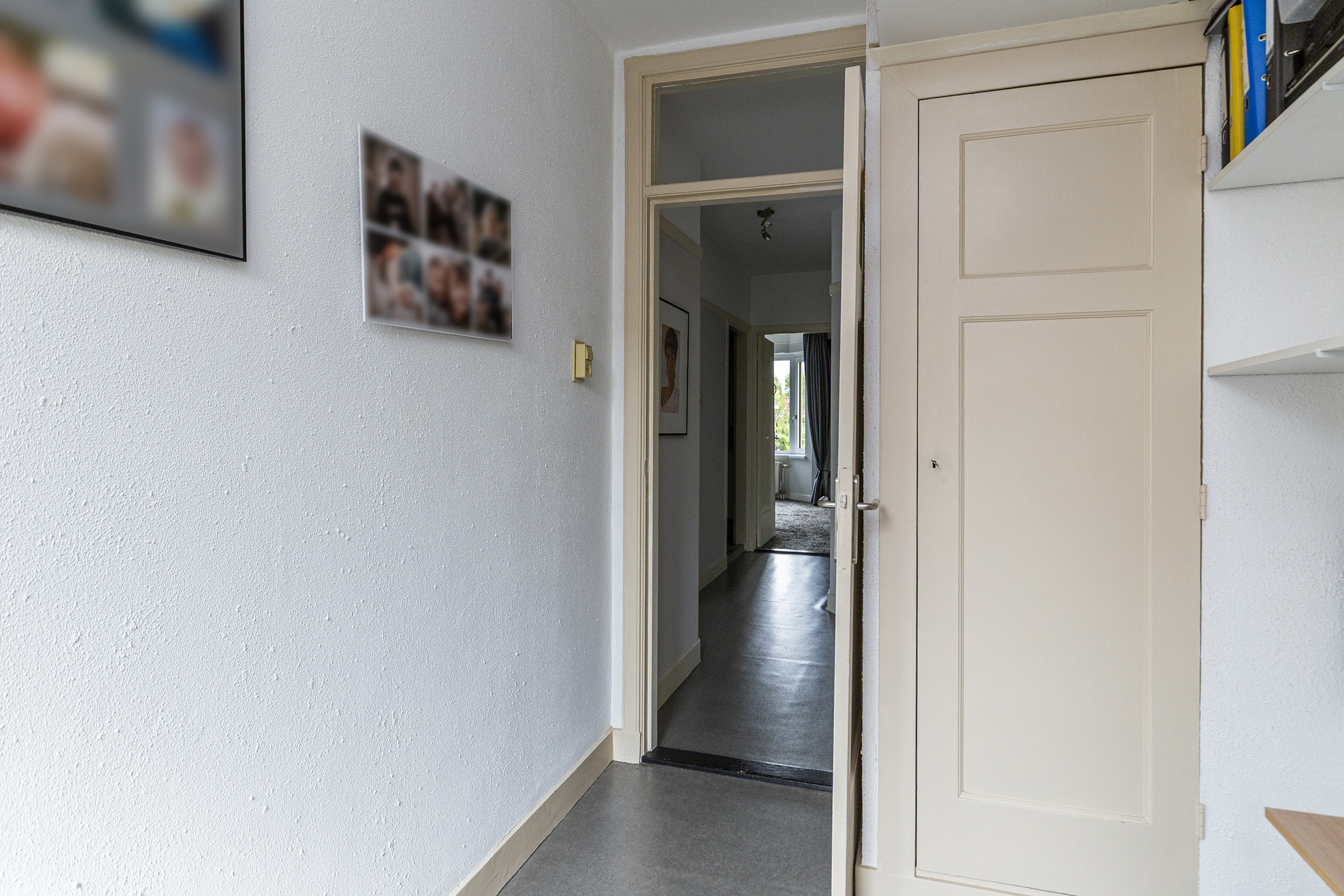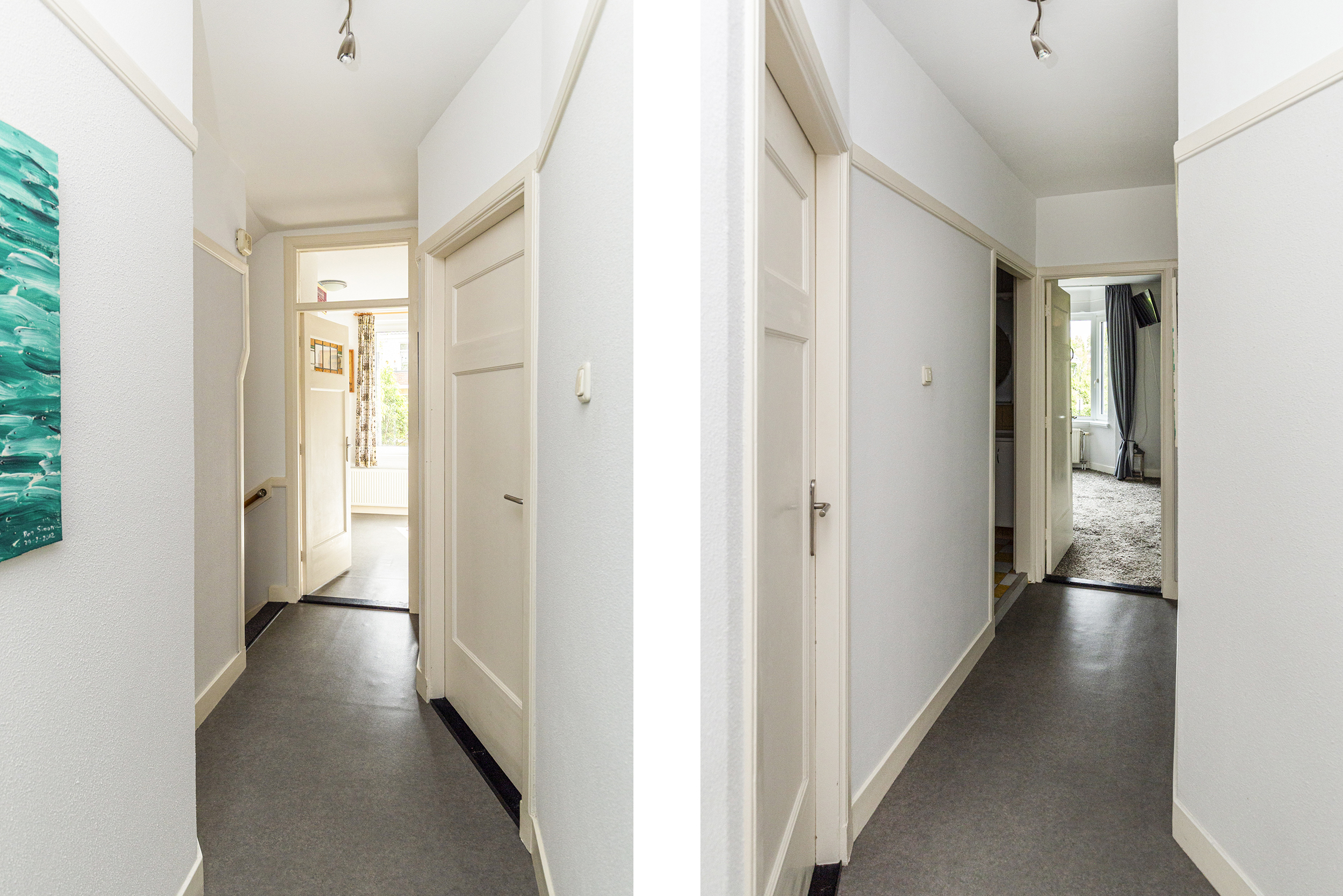 Je betreedt het huis via de verzorgde voortuin. In de hal vind je de meterkast, daarna volgt een tweede hal met trapkast en de trap naar boven. Vanuit deze centrale ruimte bereik je zowel de woonkamer als de keuken.