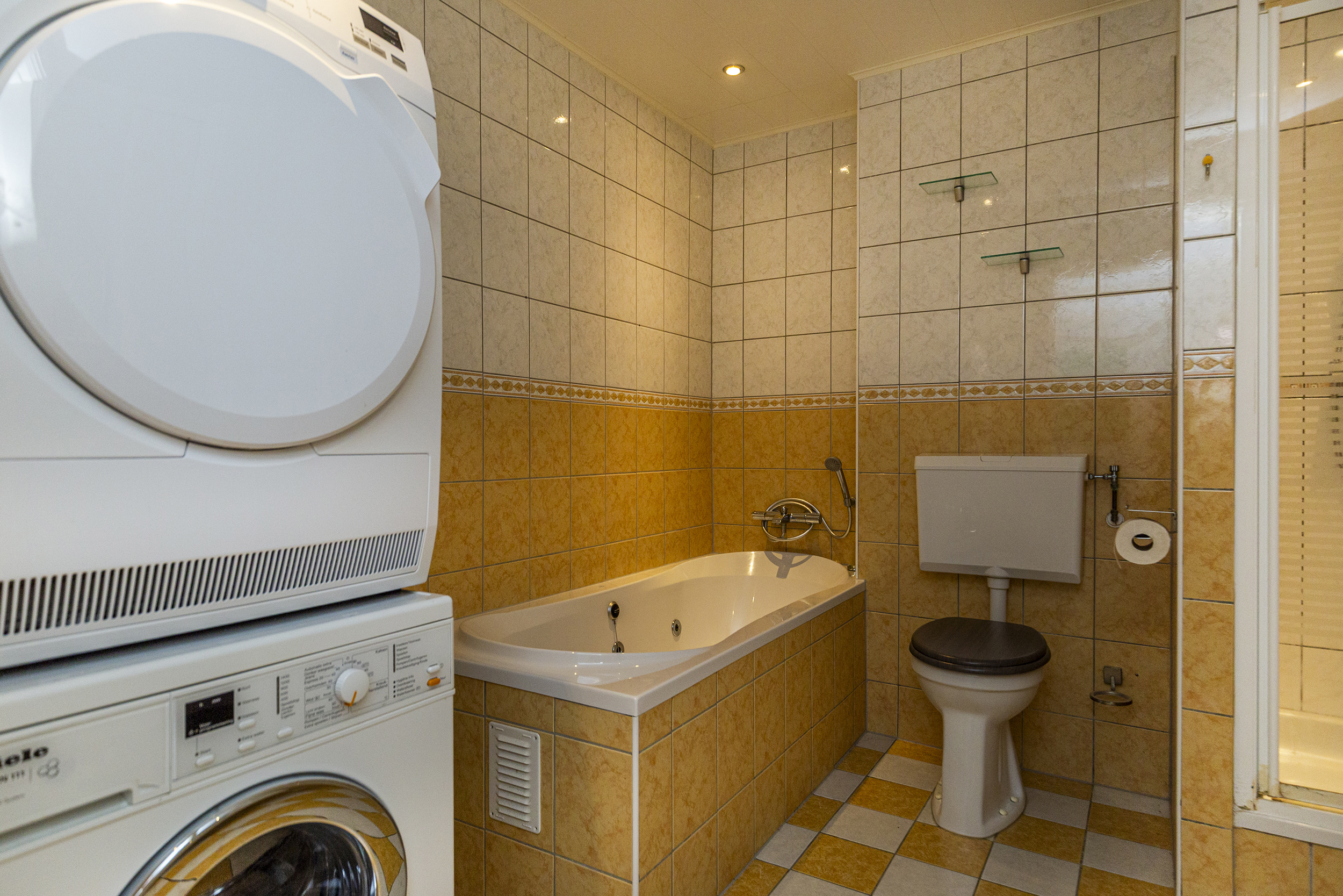 Op de eerste verdieping kom je uit op de overloop, die toegang verschaft tot drie slaapkamers en de badkamer. Aan de voorzijde ligt de royale masterbedroom met genoeg kastruimte met erker. Aan de achterzijde bevinden zich twee slaapkamers, waarvan één ruim en de ander meer compact. Beide kamers bieden toegang tot het balkon. De badkamer is compleet ingericht met een bubbelbad, een aparte douchecabine, een wastafelmeubel, een toilet en aansluitingen voor wasmachine en droger.