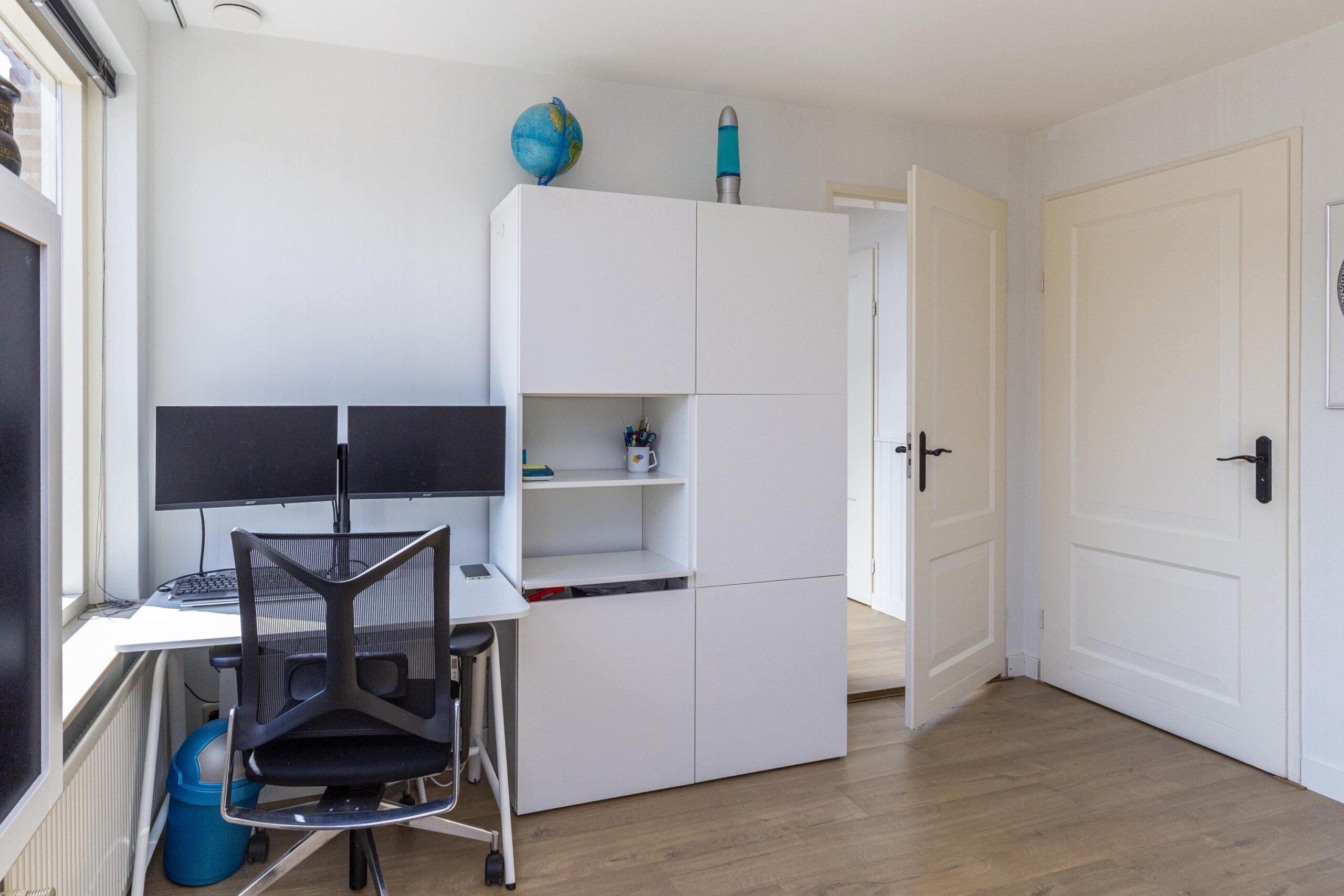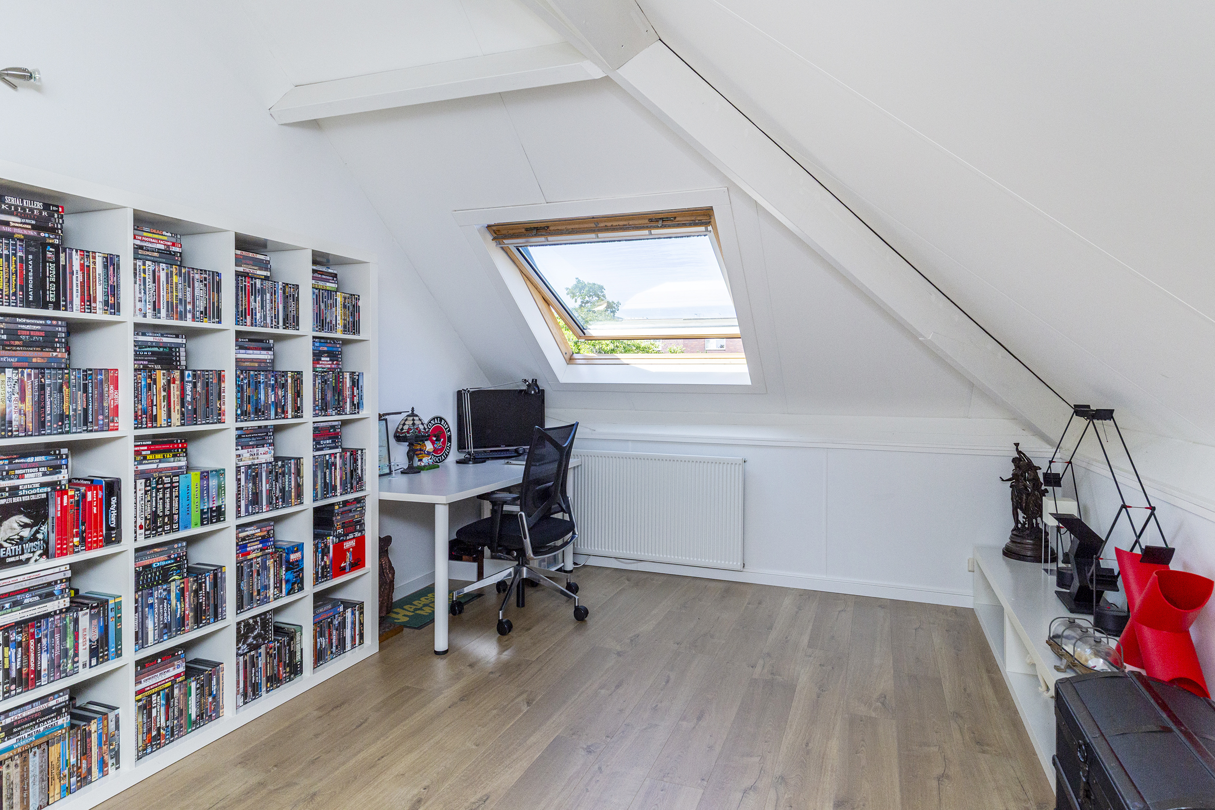 De ruime van vloerverwarming voorziene garage kan met geringe aanpassingen aangepast worden naar kantoor of extra leefruimte.