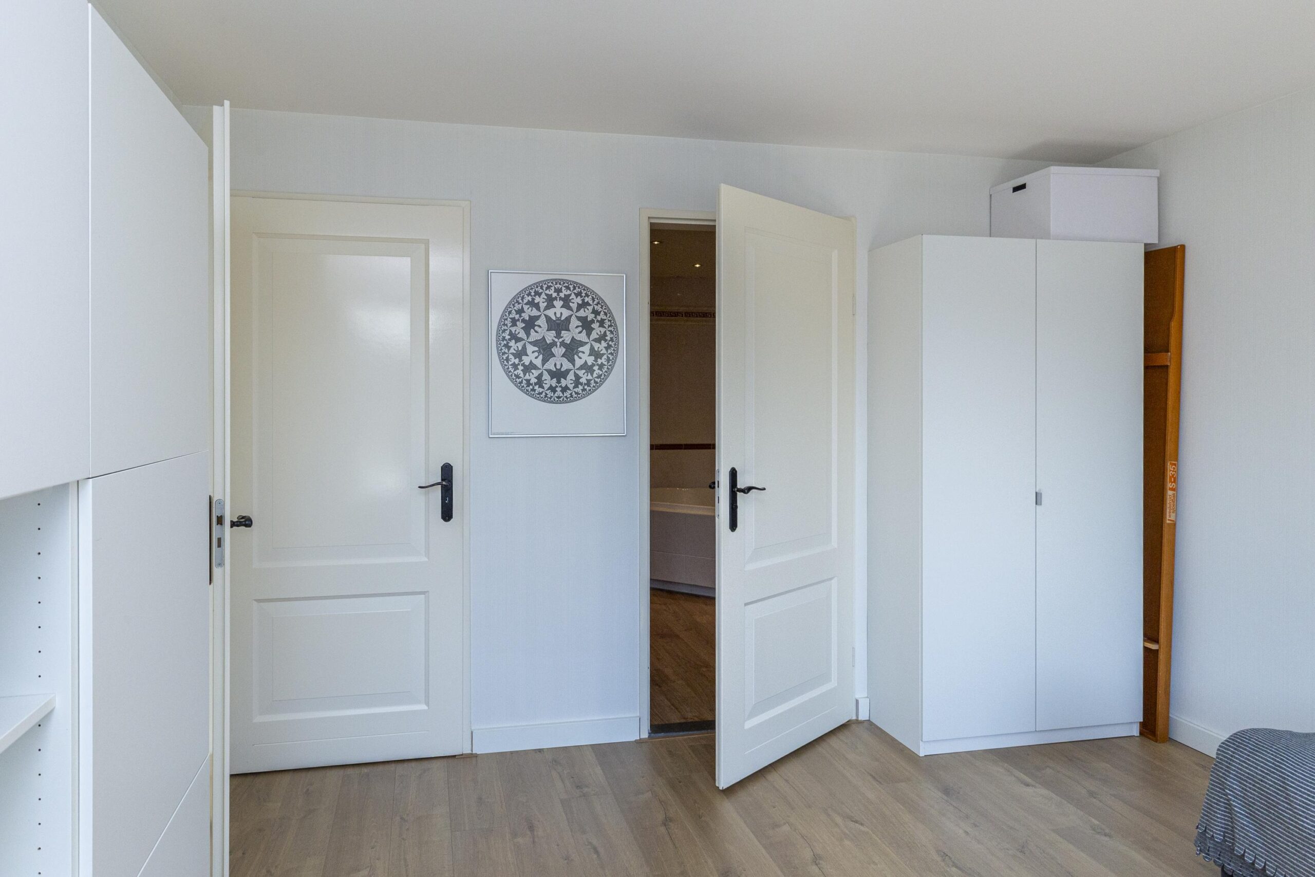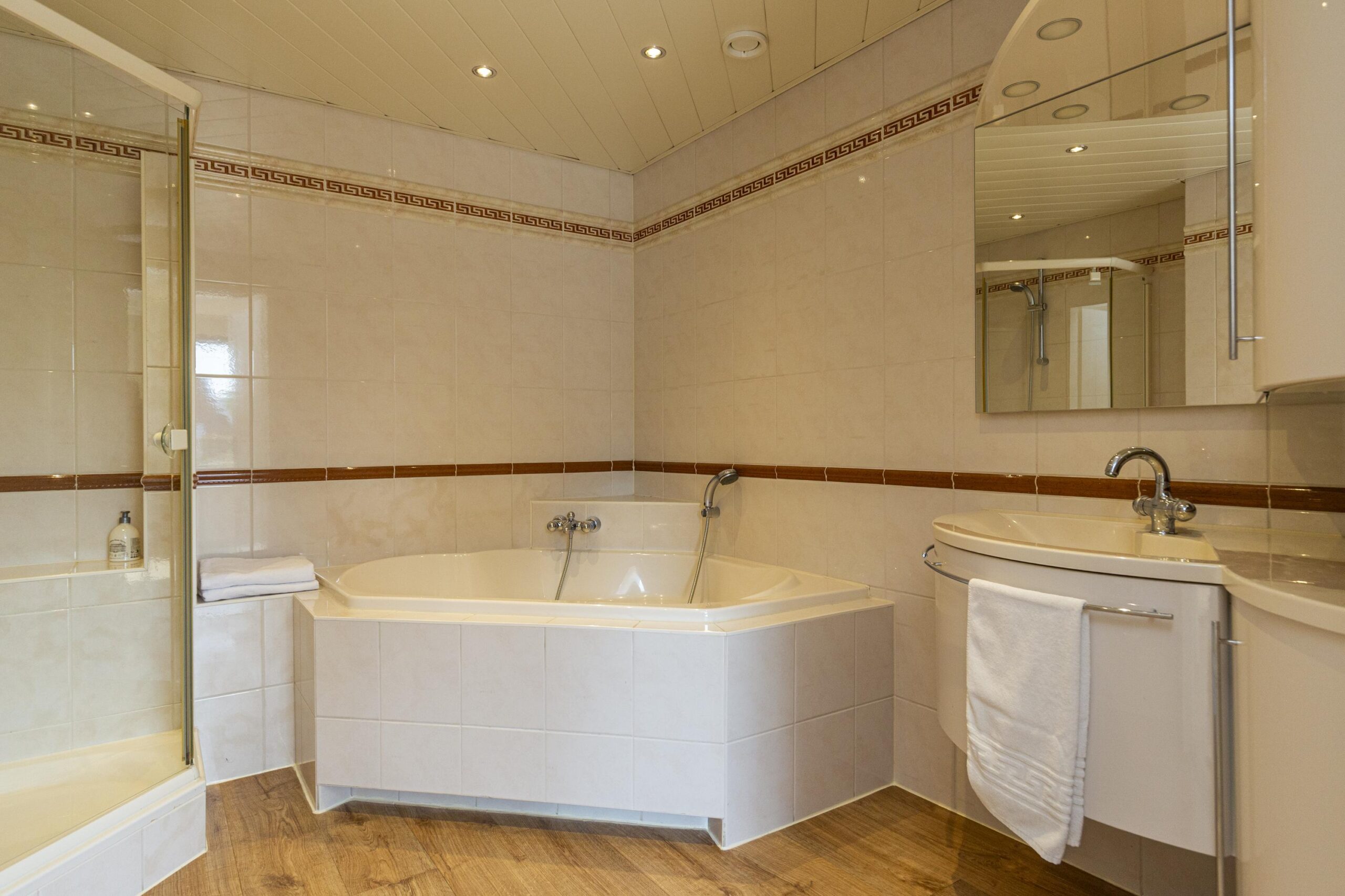 De hoofdslaapkamer bevindt zich op de begane grond en beschikt over een walk-in closet en directe toegang tot de badkamer met ligbad, douche en wastafelmeubel. De hele begane grond is voorzien van laminaat met vloerverwarming.