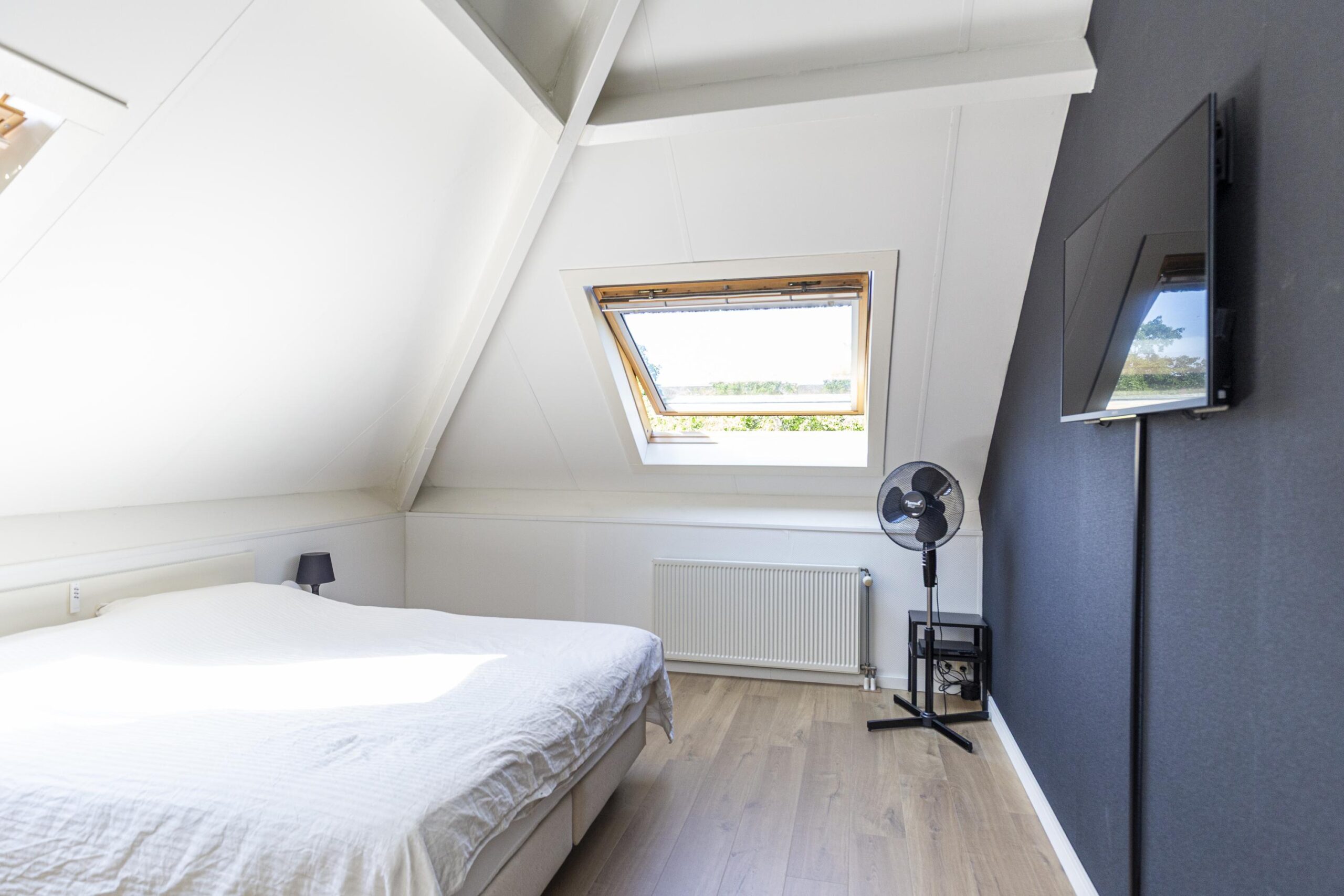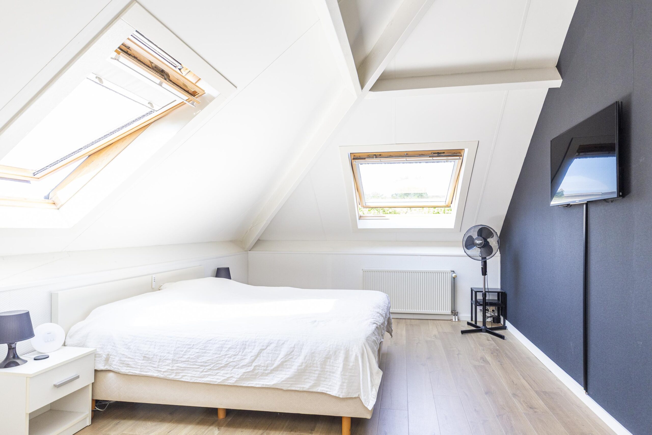 Hier bevinden zich twee ruime slaapkamers, elk met dakramen en een grote inloopkast. Vanuit één van de slaapkamers is de (berg)vliering bereikbaar waar zich ook de warmte-terugwininstallatie bevindt. De tweede badkamer is voorzien van een douche, wastafel en een tweede toilet. Ook vind je hier de technische ruimte met cv-opstelling en wasmachineaansluiting.