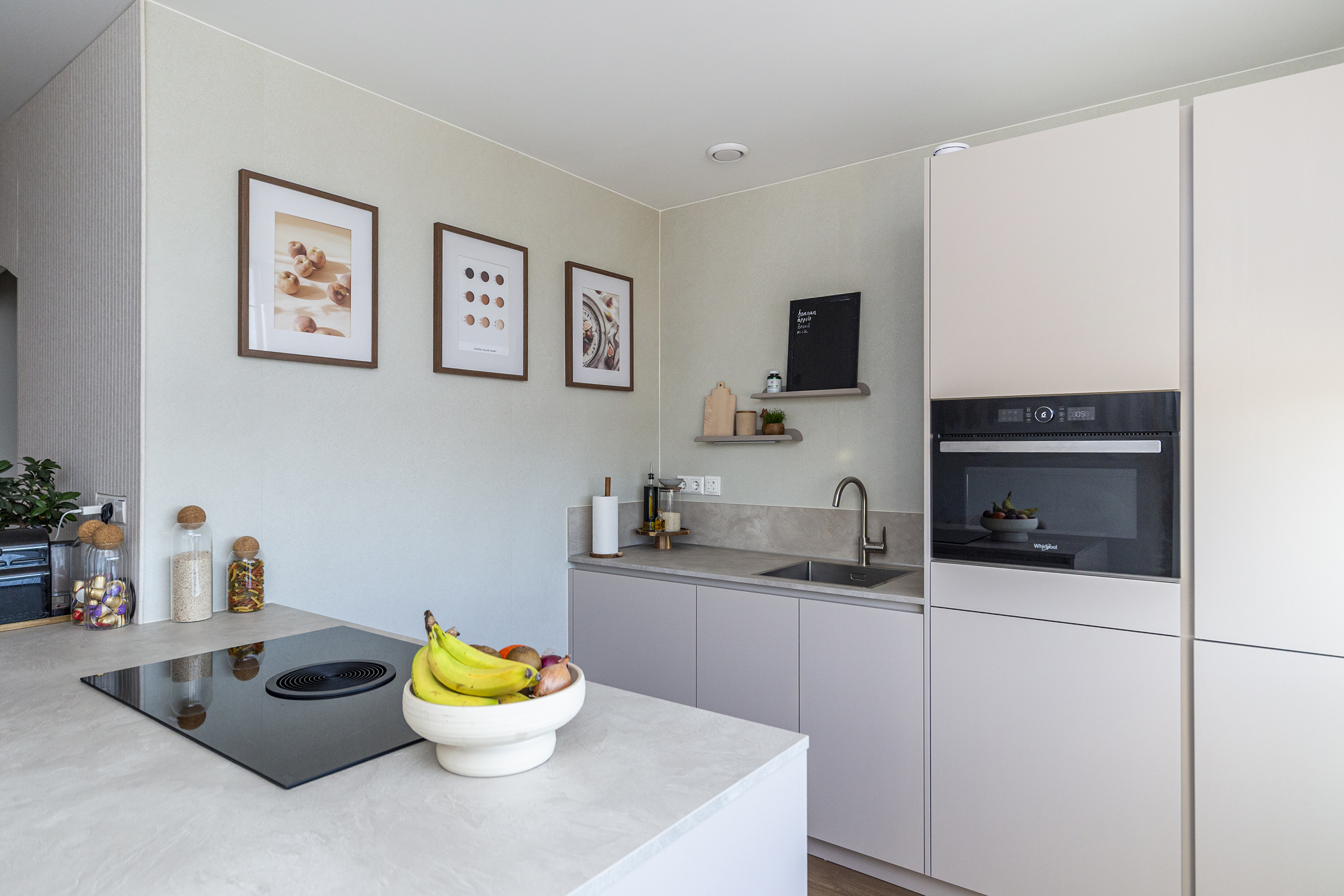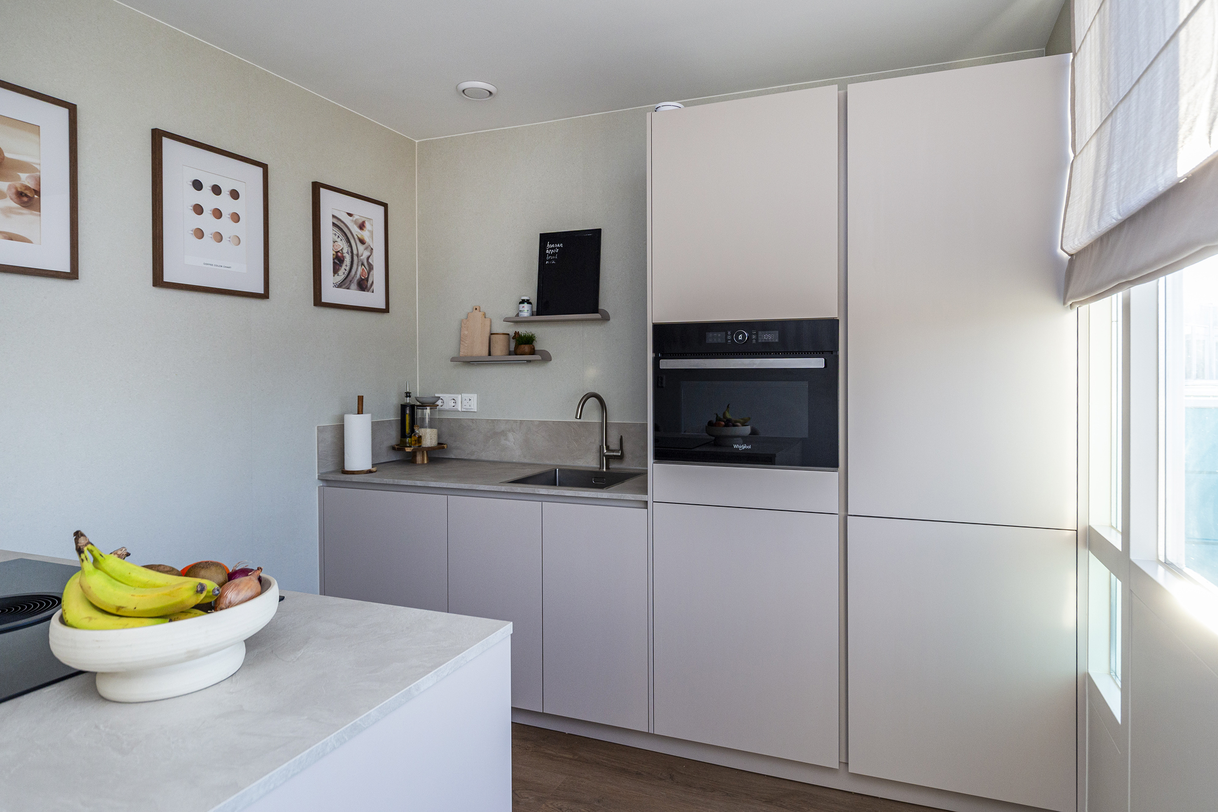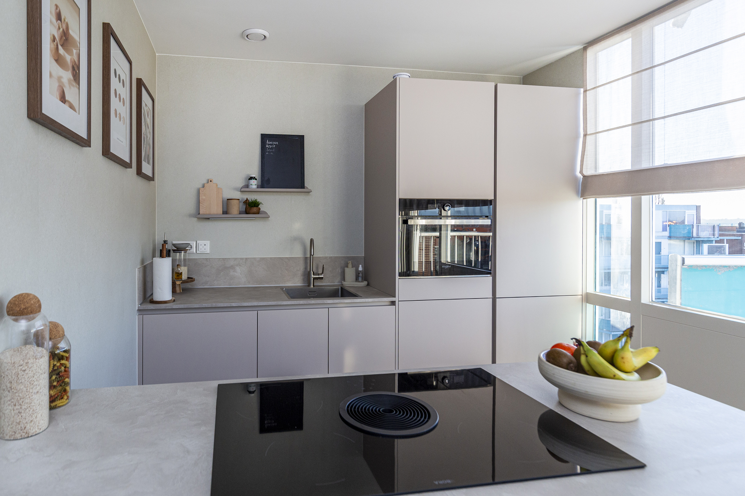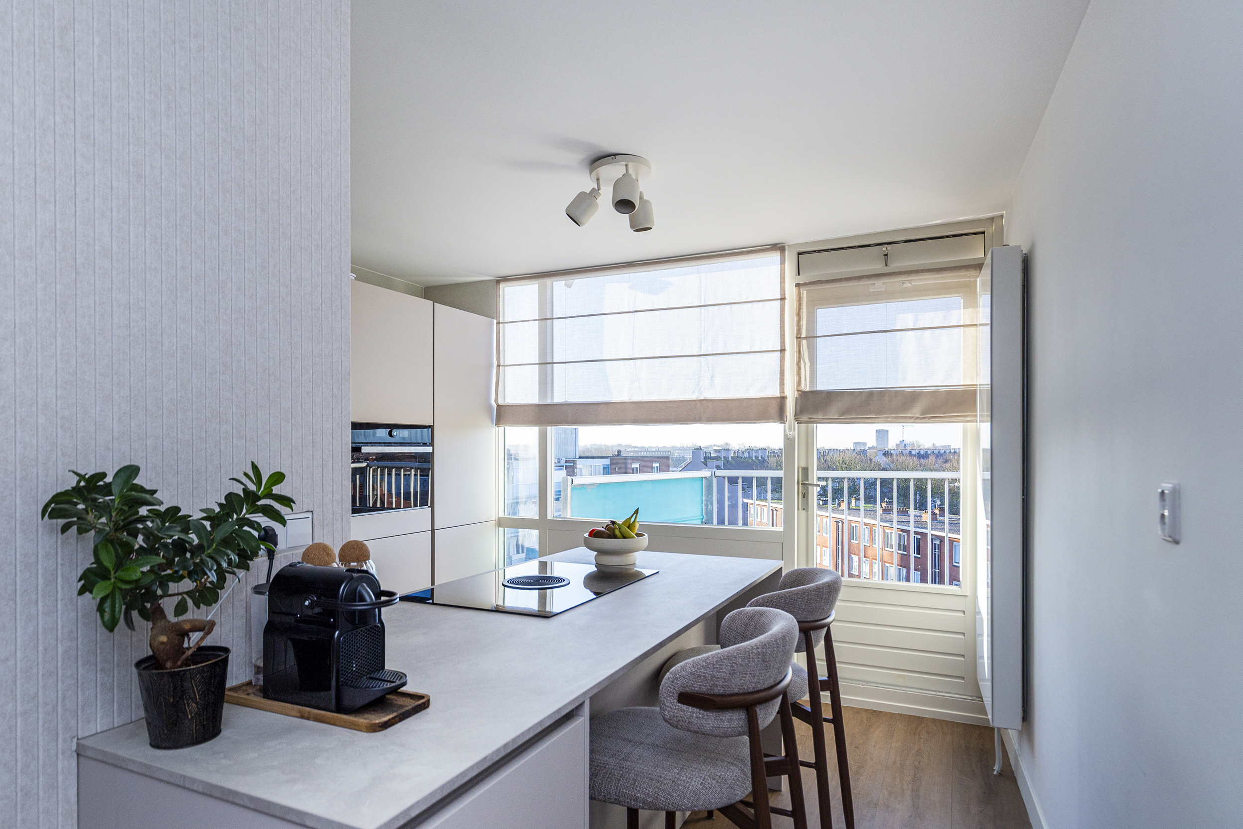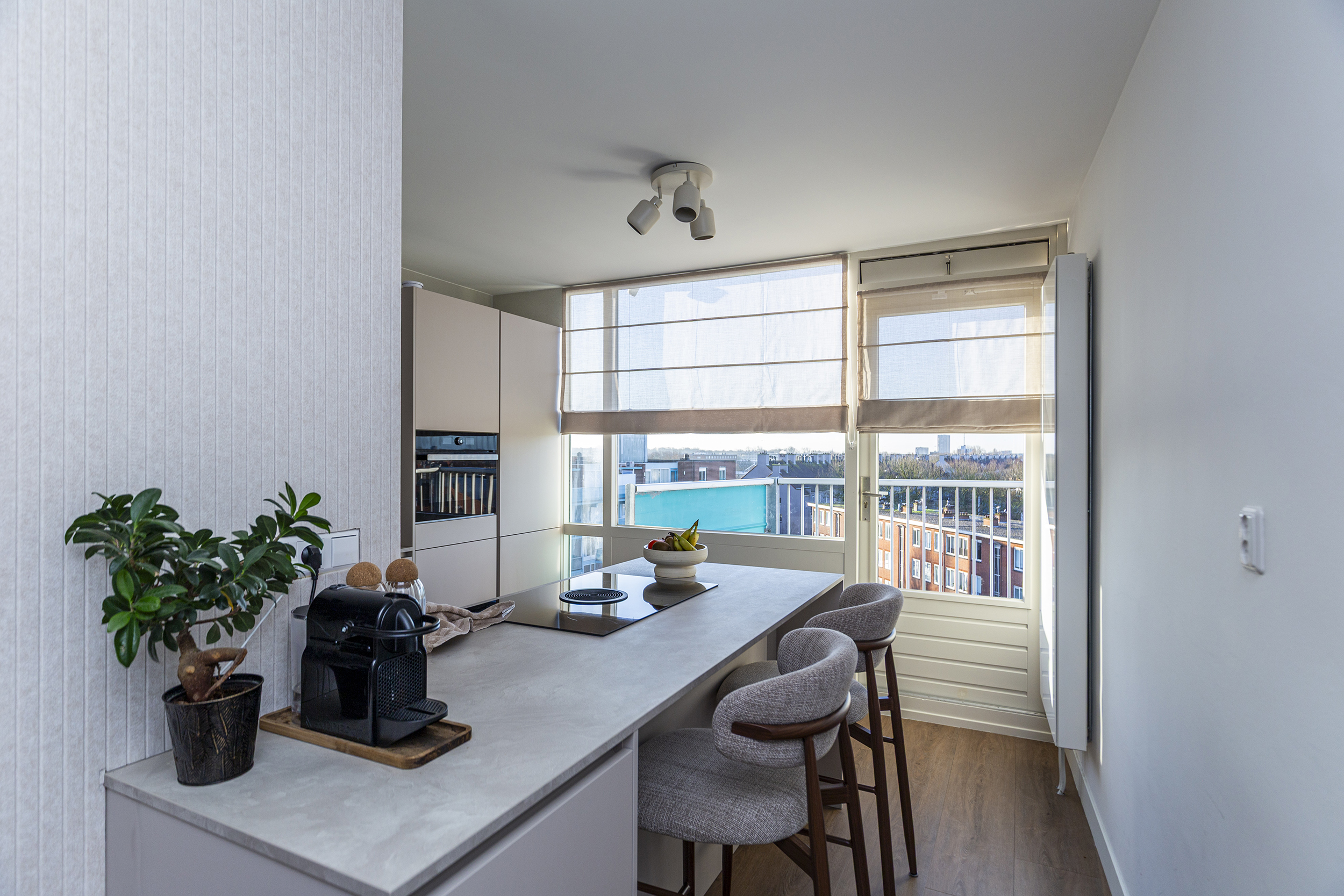 Overloop met opstelling cv-installatie (2022) en modern toilet. Woonkamer is georiënteerd richting de Erasmusweg en beschikt over een balkon met ochtendzon. Aansluitend de in 2025 vernieuwde keuken met kookeiland en voorzien van diverse inbouwapparatuur. Vanuit de keuken is er toegang tot het tweede balkon, georiënteerd op de middag- en avondzon.