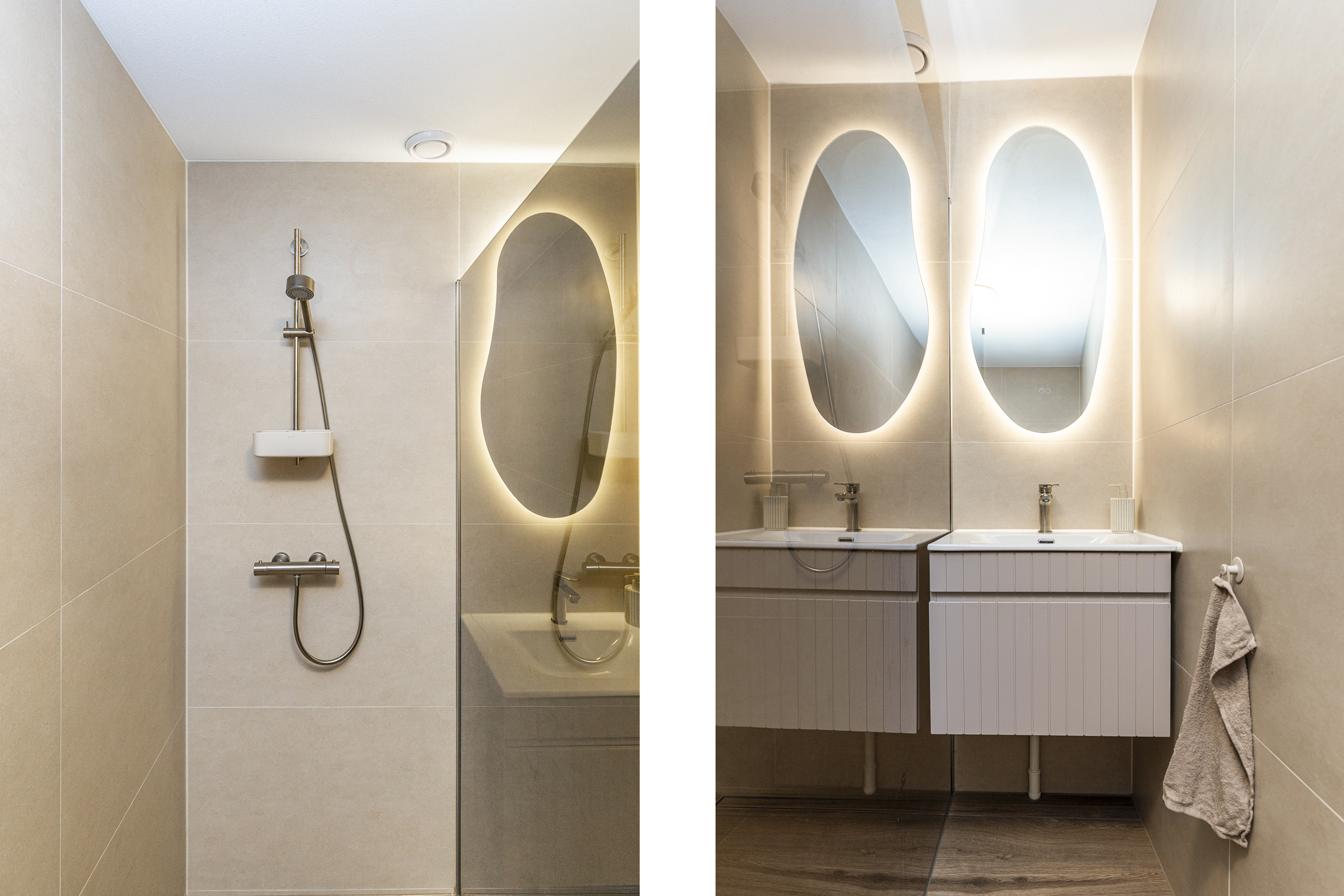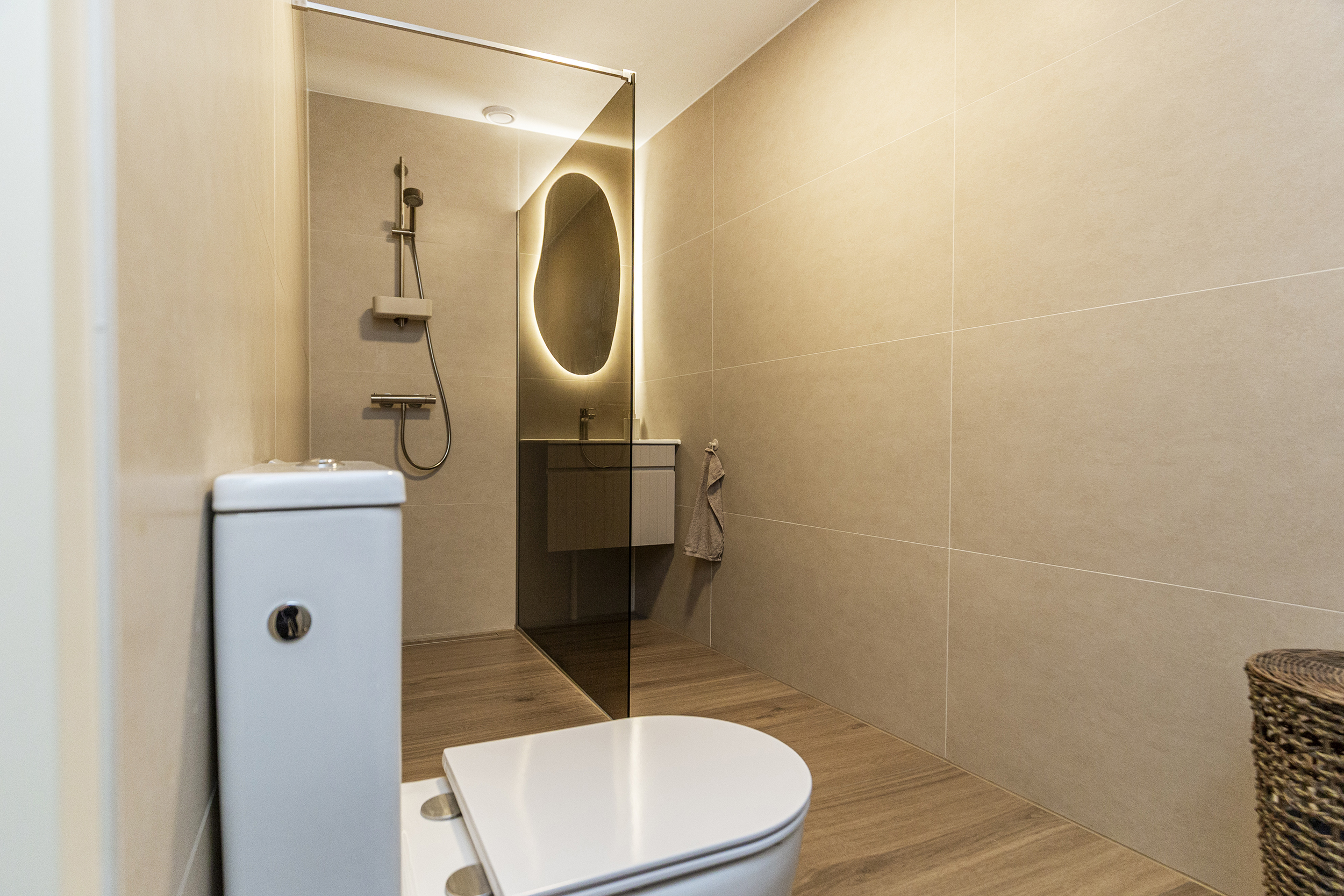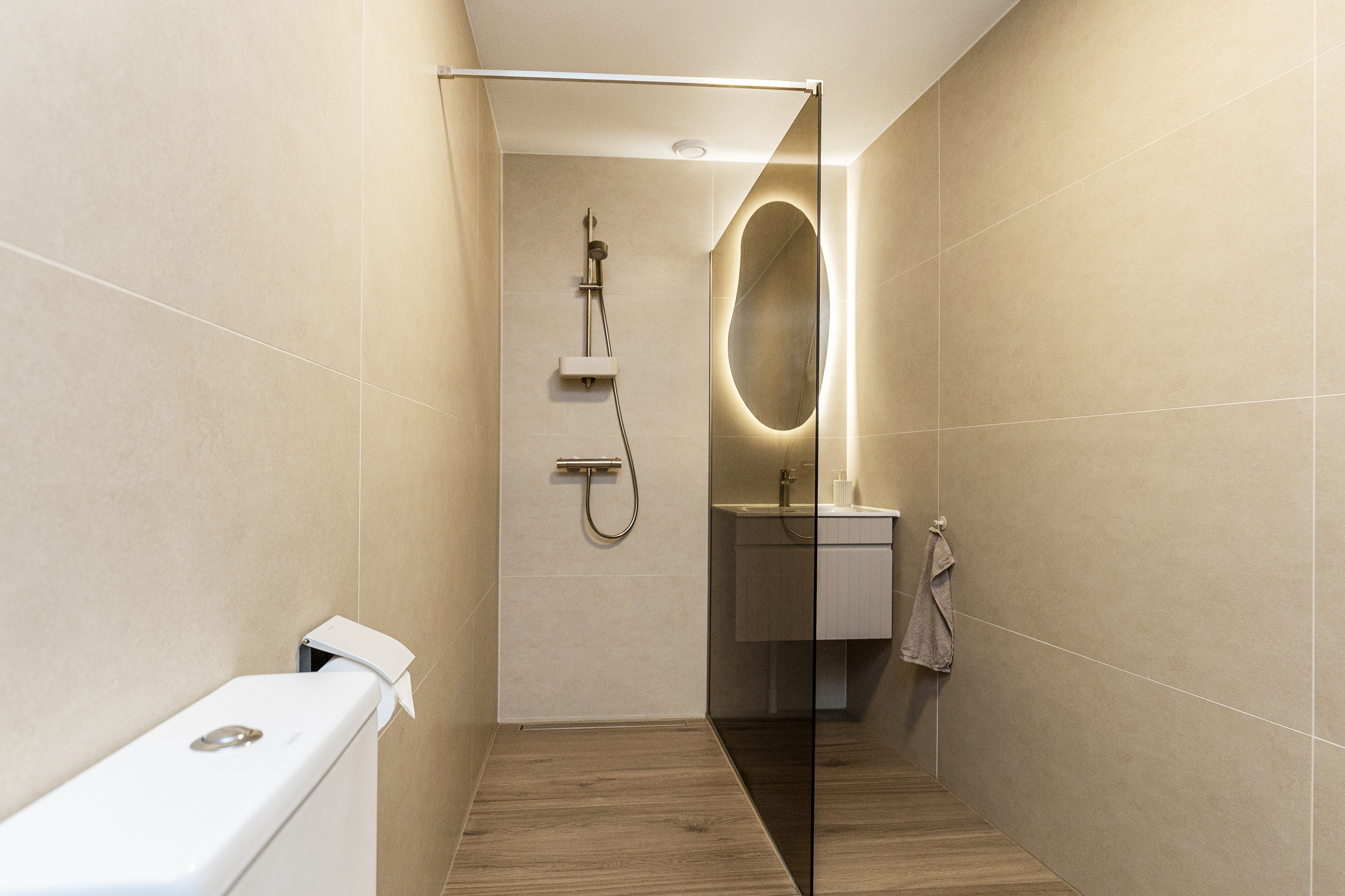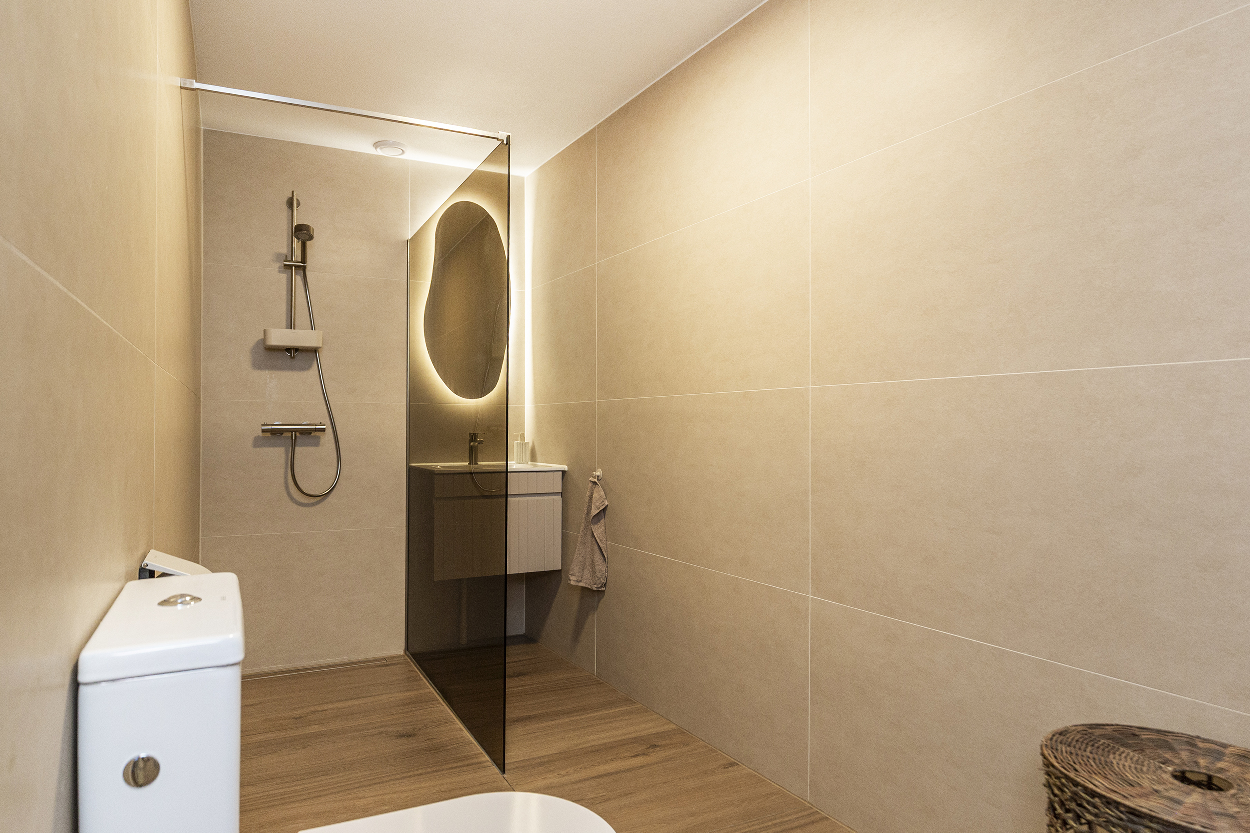 - Badkamervoorzieningen Toilet, wastafelmeubel, inloopdouche, wasmachineaansluiting