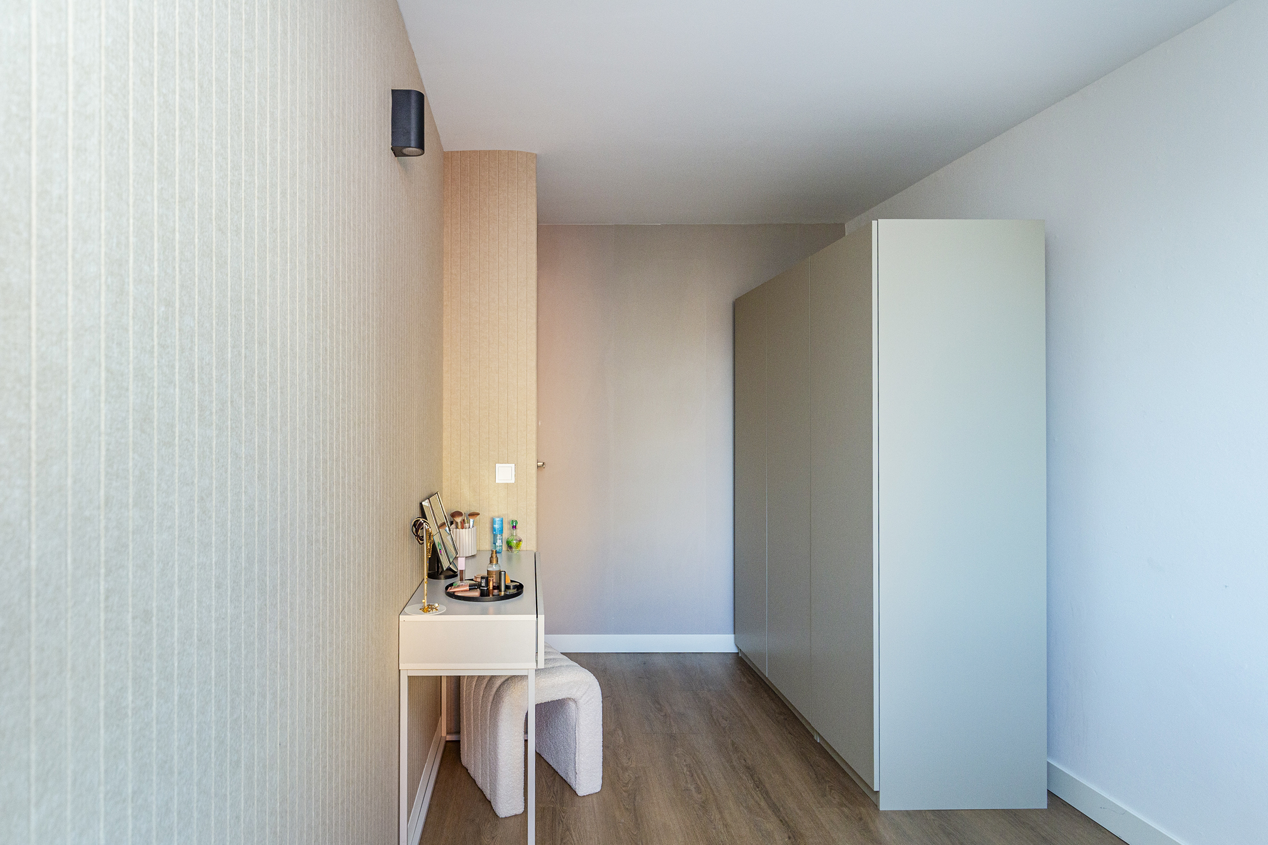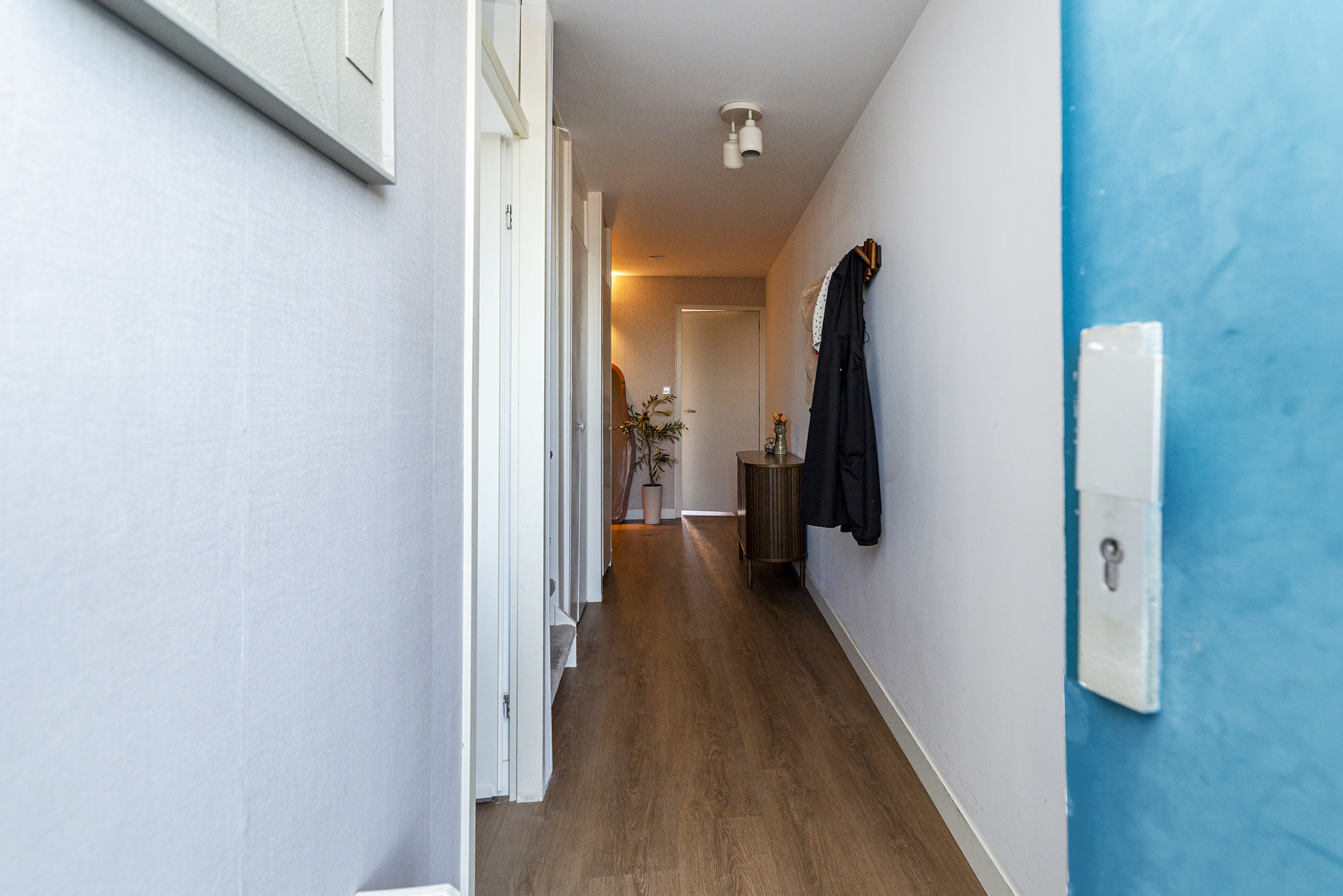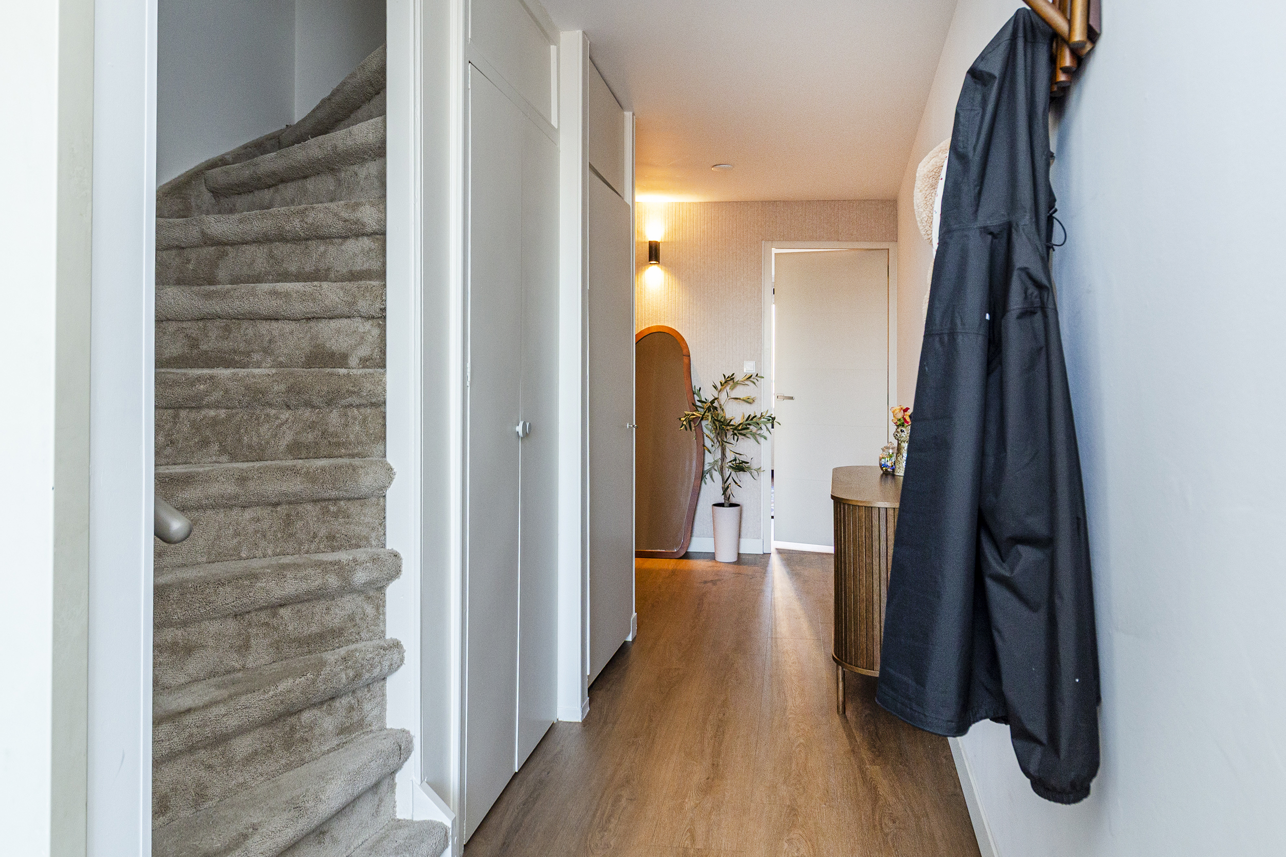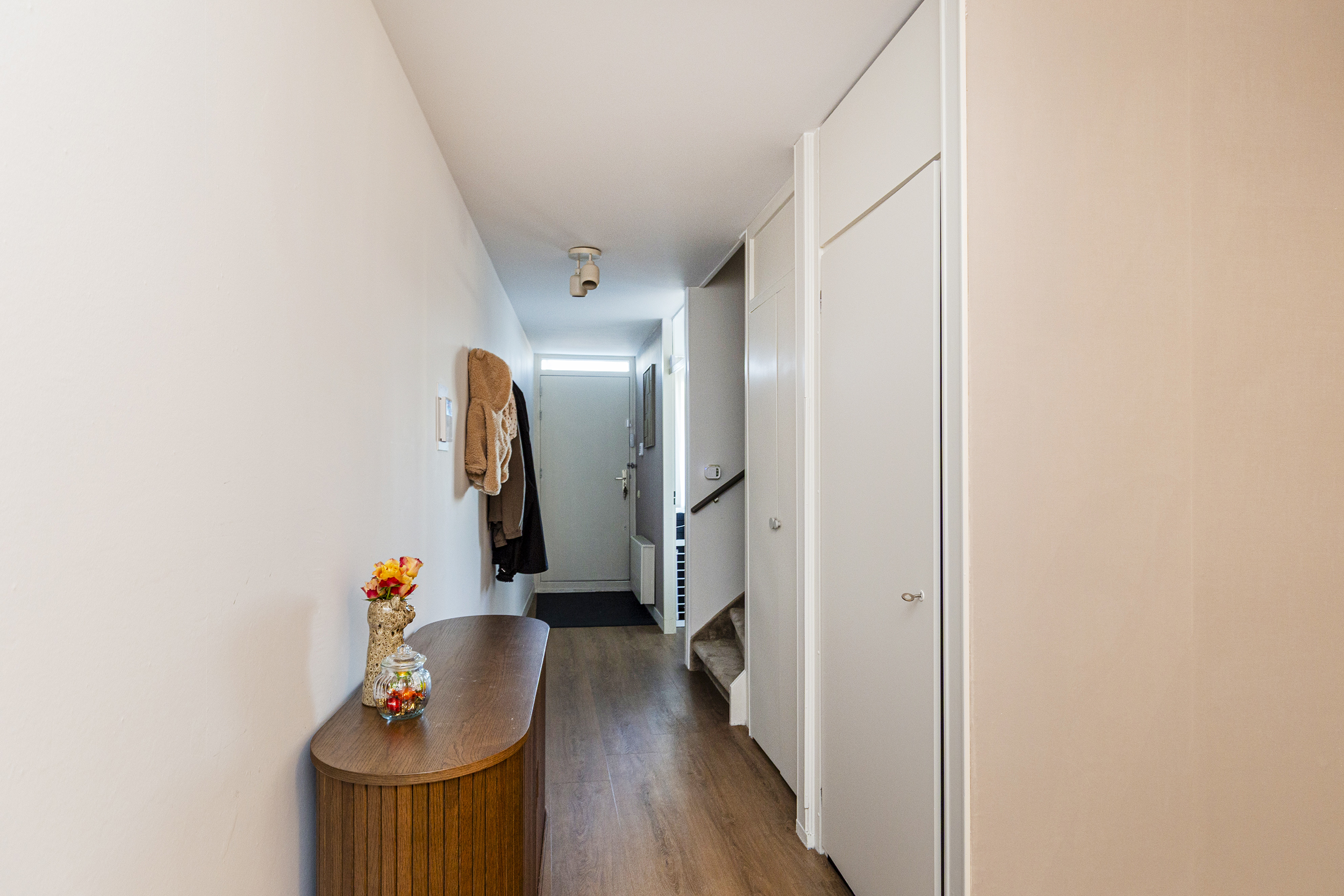 Ruime hal, een slaapkamer aan de achterzijde, twee slaapkamers aan de voorzijde. Moderne badkamer (2025) met inloopdouche, toilet, wastafelmeubel en wasmachine aansluiting. Bergruimte onder de trap naar de woonverdieping.