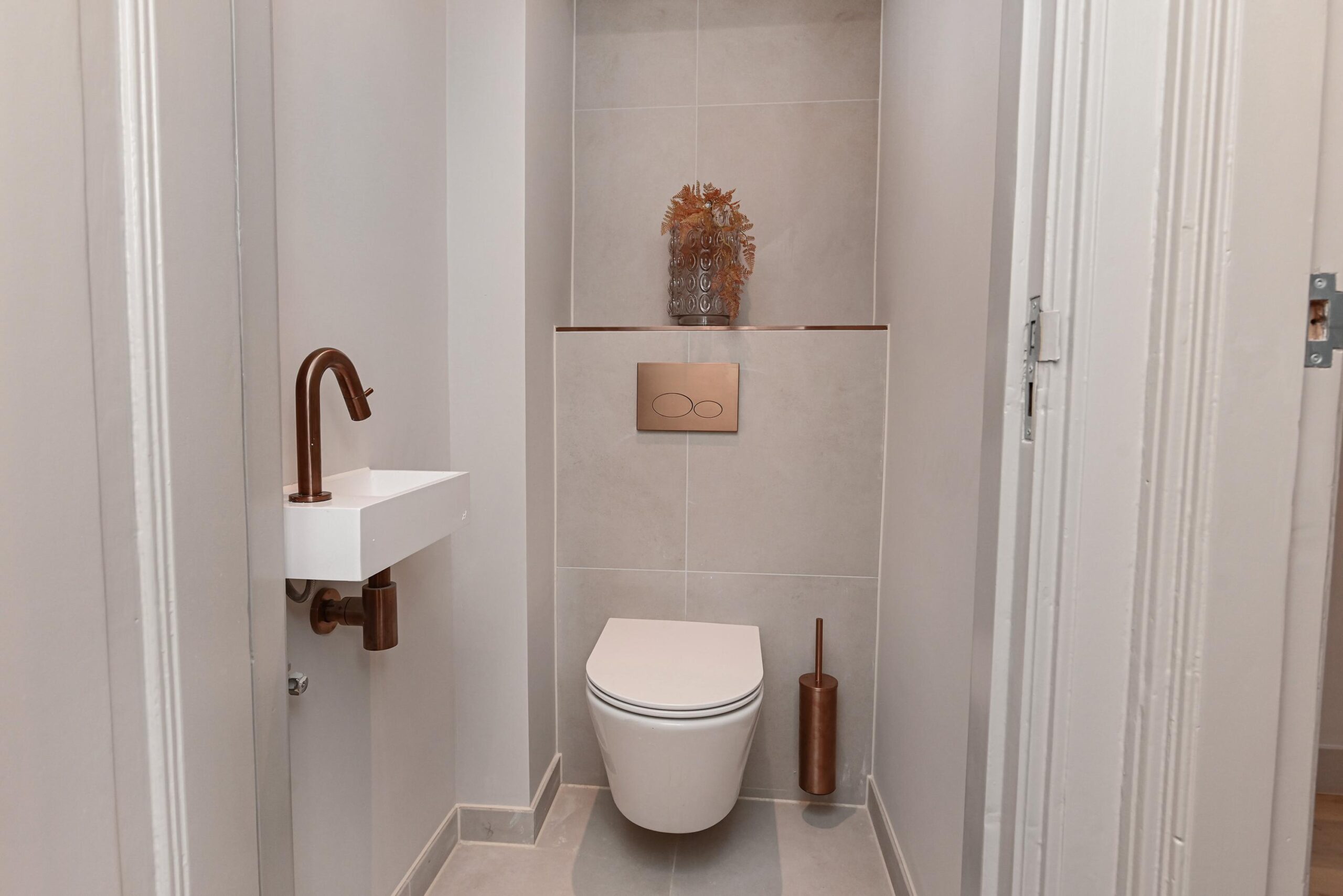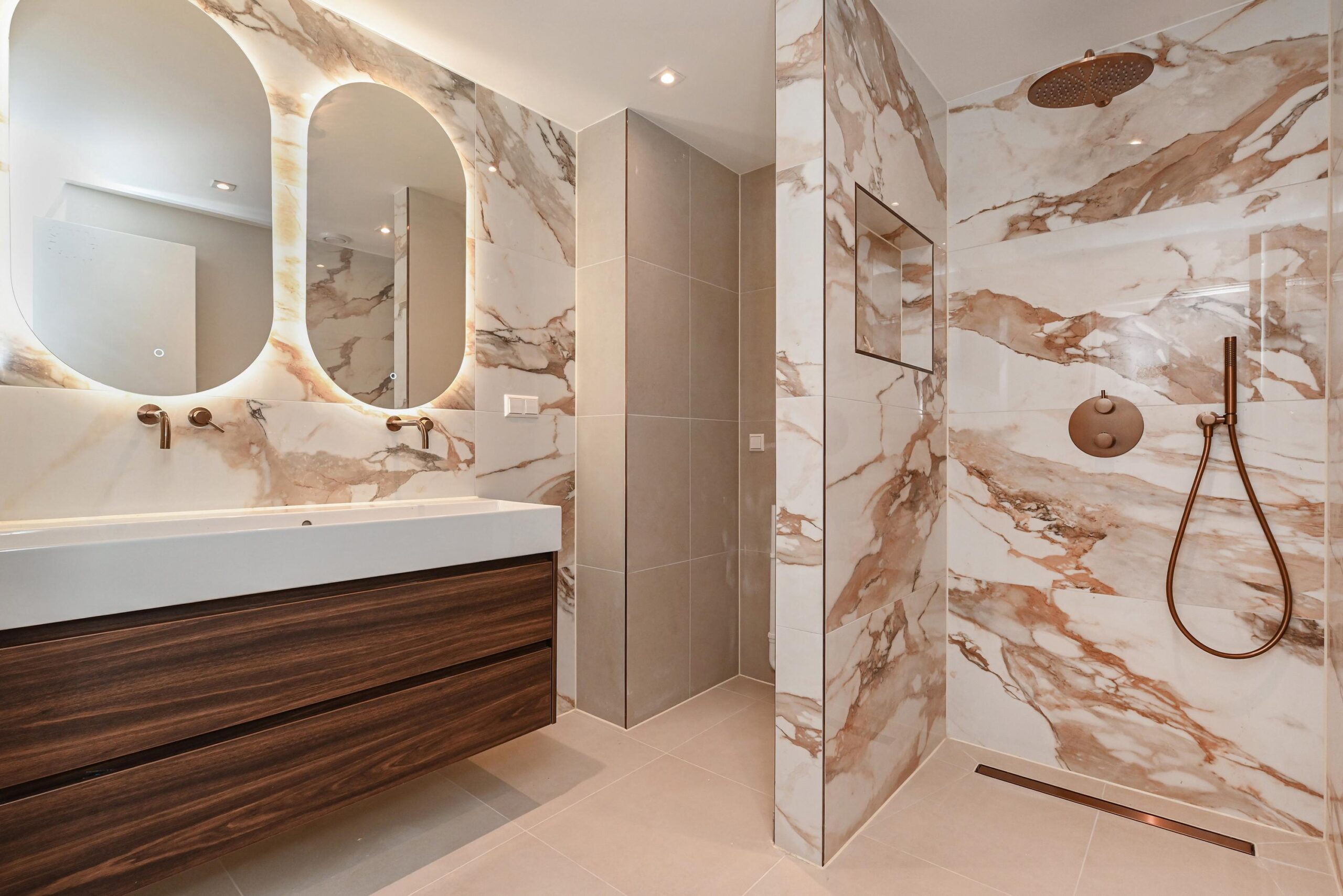 Centraal in de woning vind je de vernieuwde luxe badkamer, uitgevoerd in mooie rood-marmer tegels en voorzien van een ruime inloopdouche, een dubbele wastafel en de aansluiting voor de wasmachine. Tot slot is er nog een separaat toilet aanwezig.