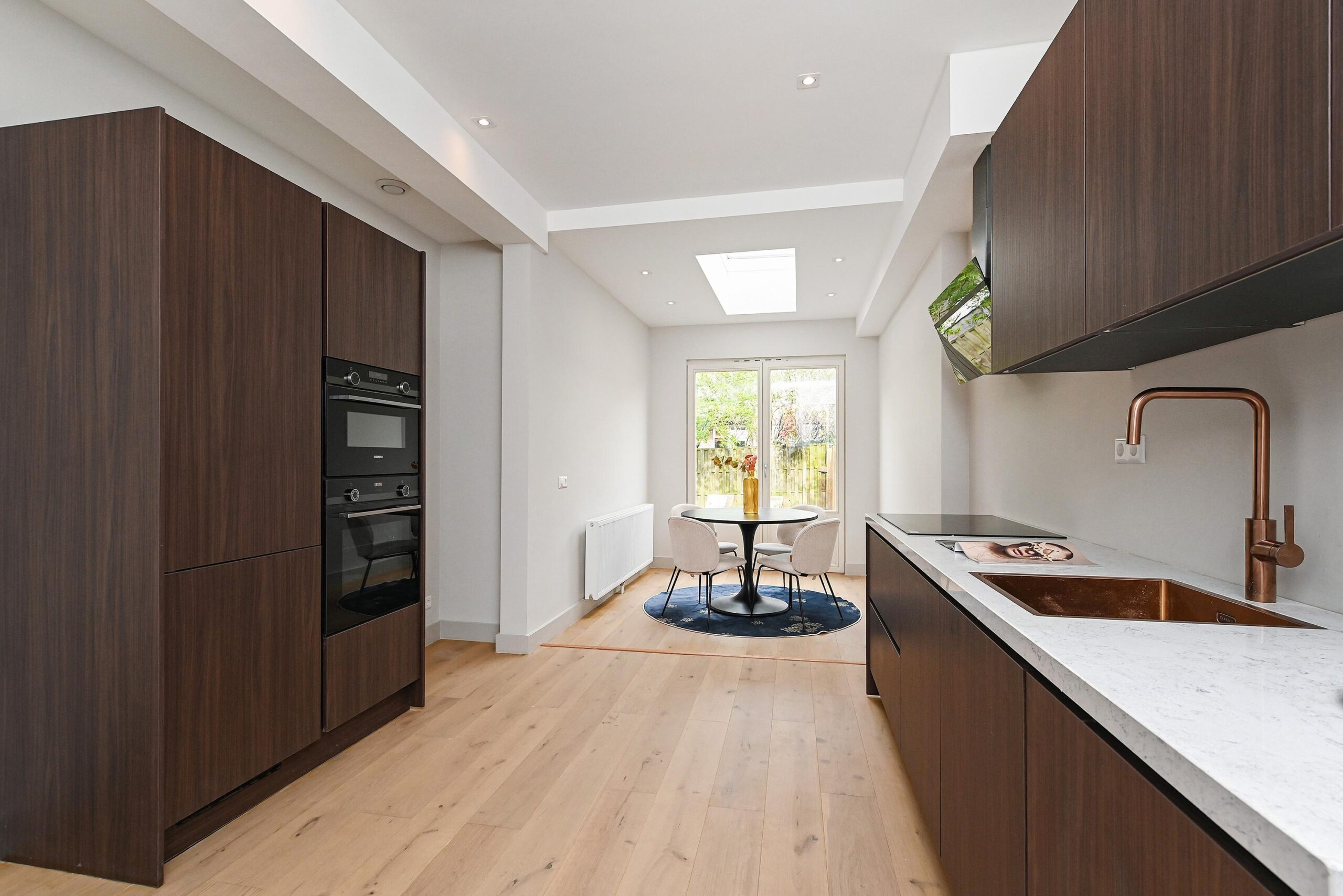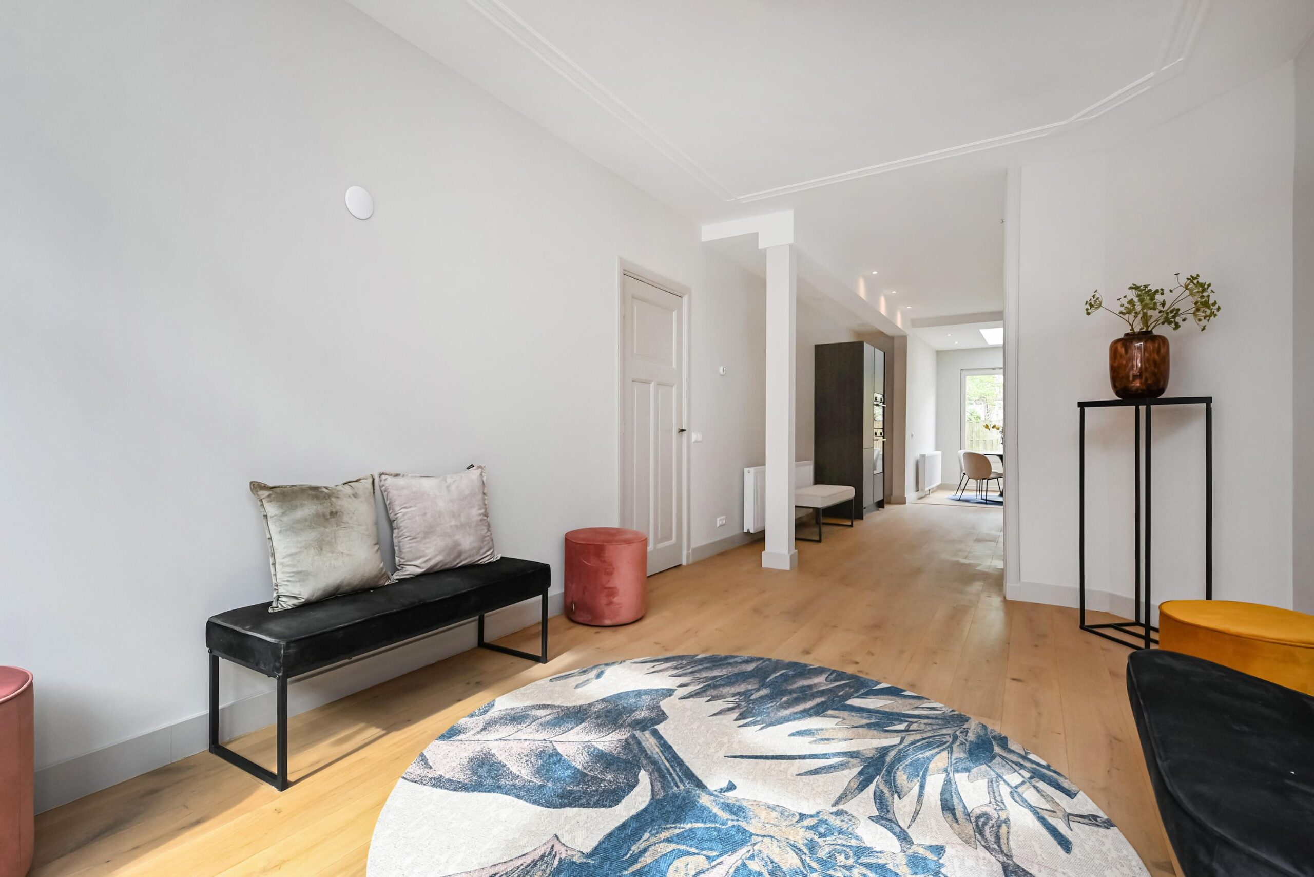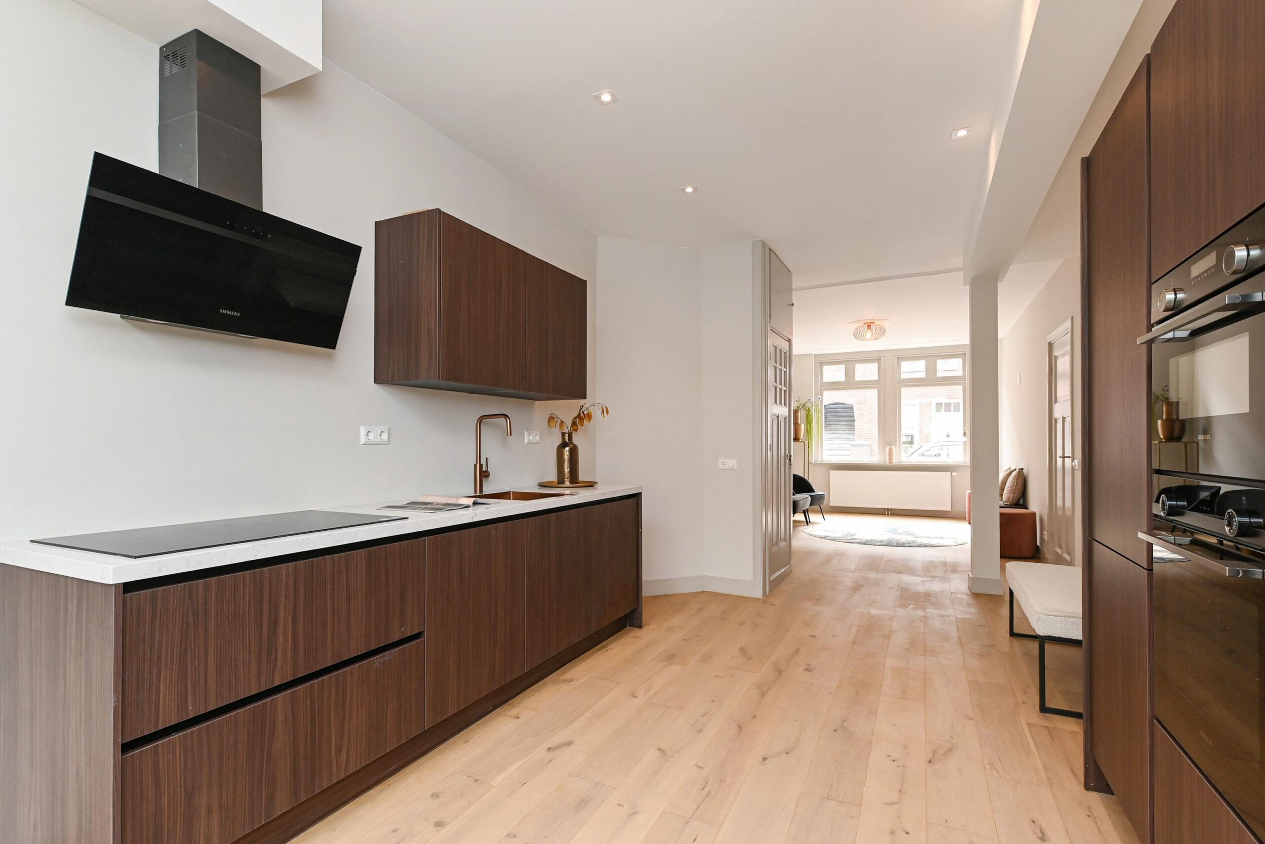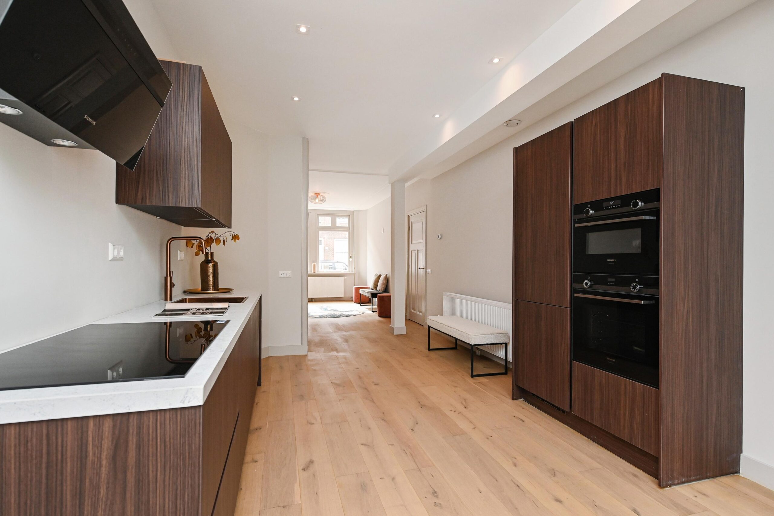 Bij binnenkomst in de woning kom je in een ruime, lange hal die toegang geeft tot alle vertrekken. Aan de rechterzijde vind je de ruime woon- en eetkamer, die zich uitstrekt over de volledige lengte van de woning. Deze lichte leefruimte heeft halverwege een praktische opbergkast, met daarachter direct de moderne keuken. De keuken is, net als de rest van de woning, volledig vernieuwd en van alle gemakken voorzien. Aan beide zijden beschik je over diverse inbouwapparatuur en voldoende opbergruimte, waaronder een inductiekookplaat, koel-/vriescombinatie, oven, combi-oven en vaatwasser.