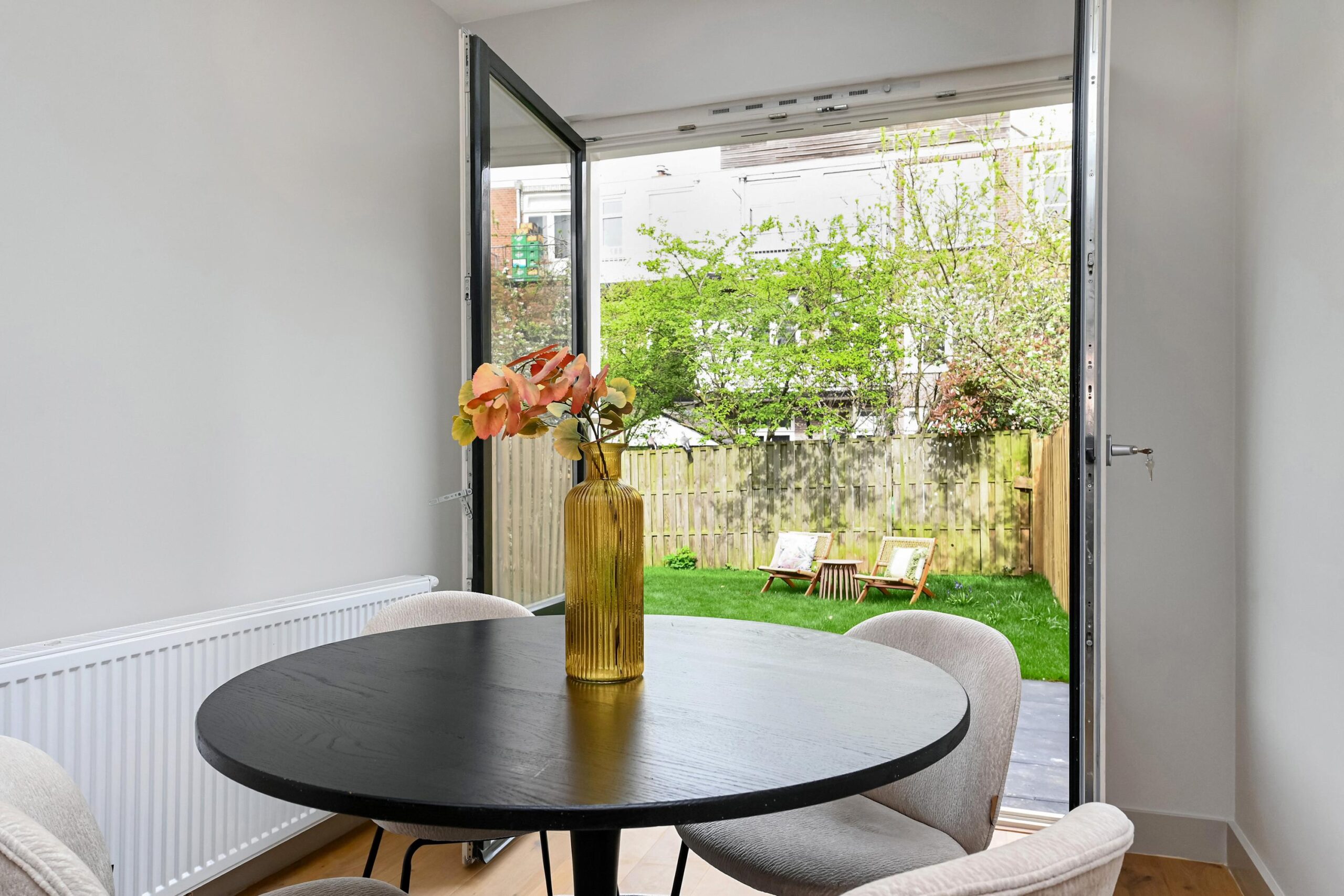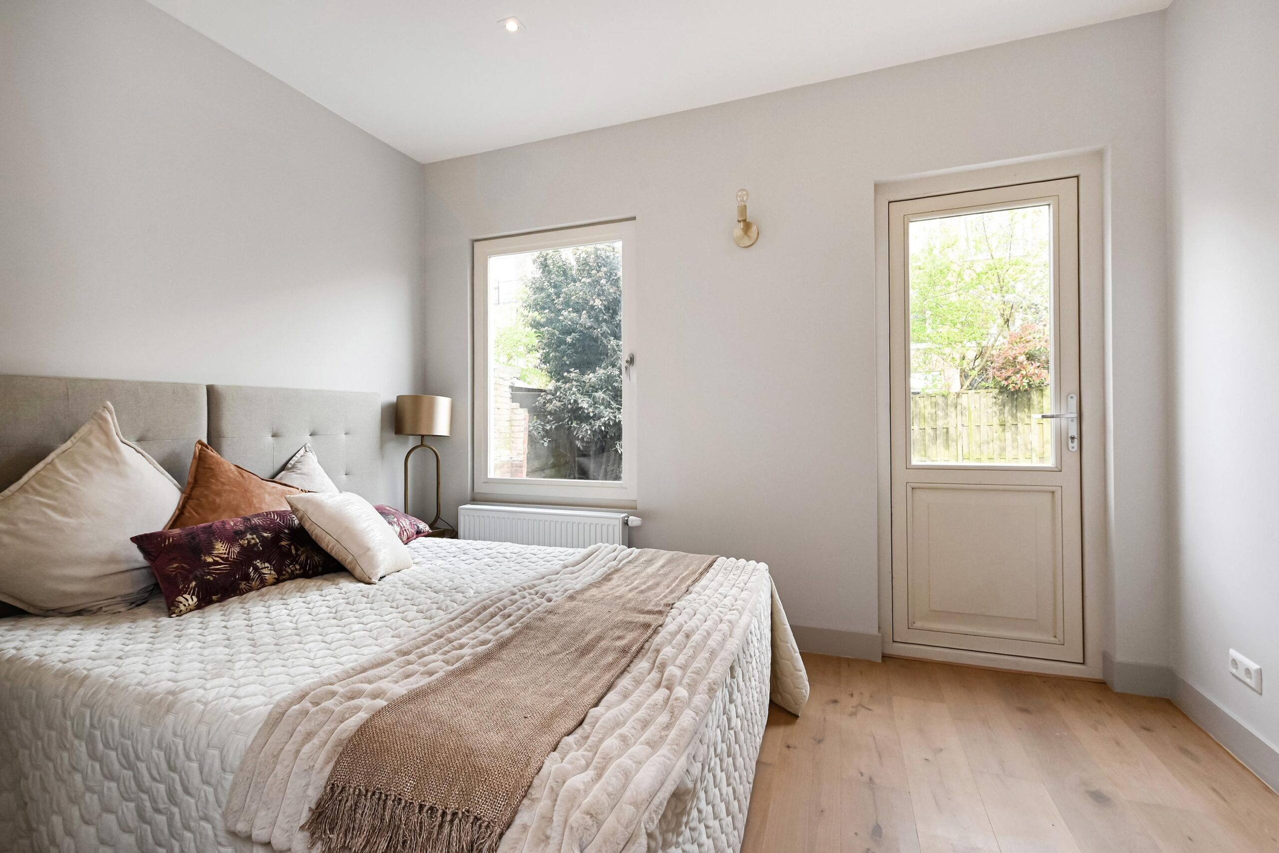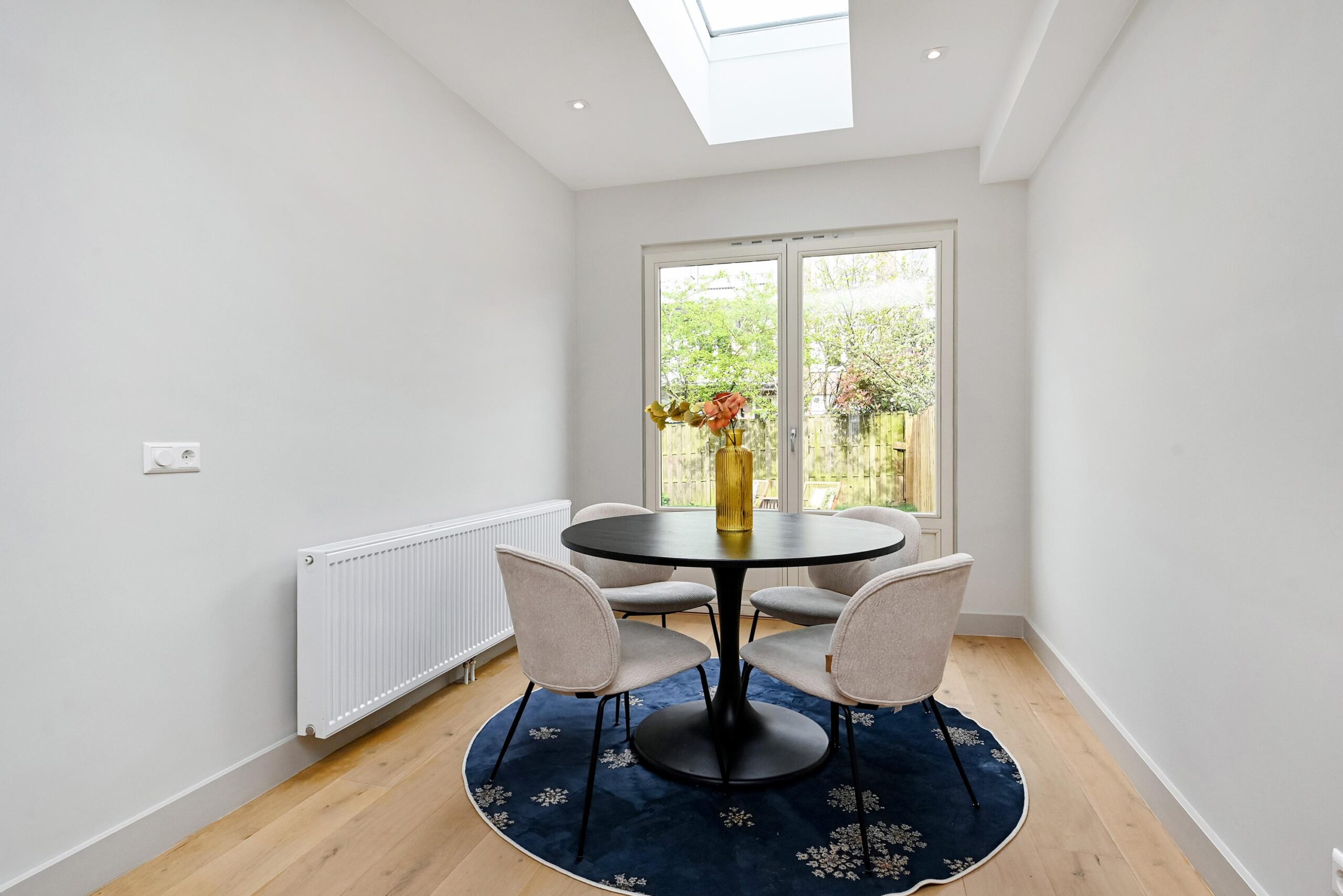 Aan de achterzijde van de woning kun je een gezellige eethoek creëren. Dankzij de lichtkoepel en de openslaande deuren valt hier veel natuurlijk licht naar binnen. De openslaande deuren geven je toegang tot de ruime tuin, waar je heerlijk van de zon kunt genieten. Ook aan de achterzijde bevindt zich de eerste en grootste slaapkamer. Daarnaast zijn er nog twee slaapkamers: één aan de achterzijde en één aan de voorzijde van de woning.