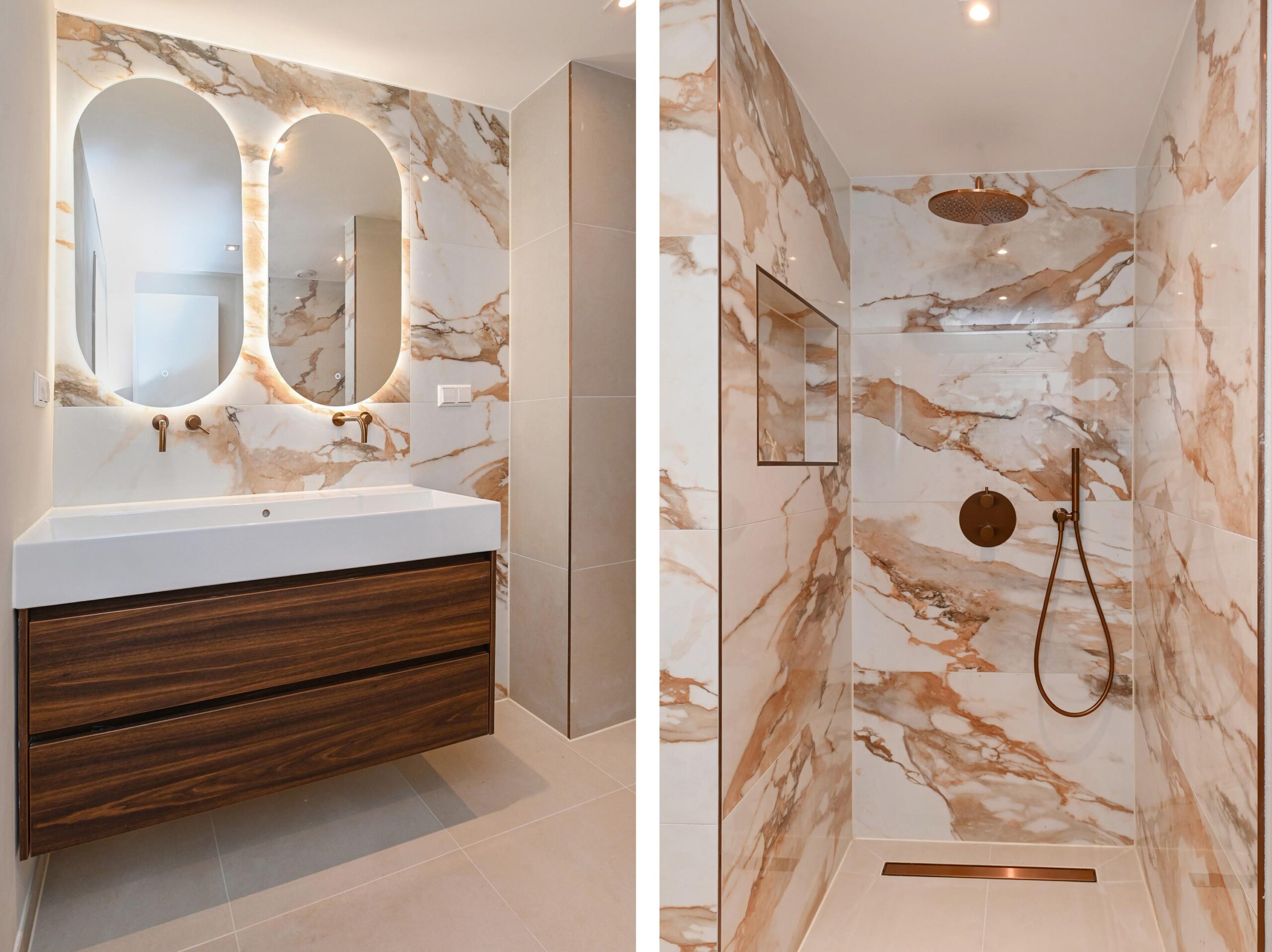 - Badkamervoorzieningen Dubbele wastafel, wastafelmeubel, inloopdouche, wasmachineaansluiting