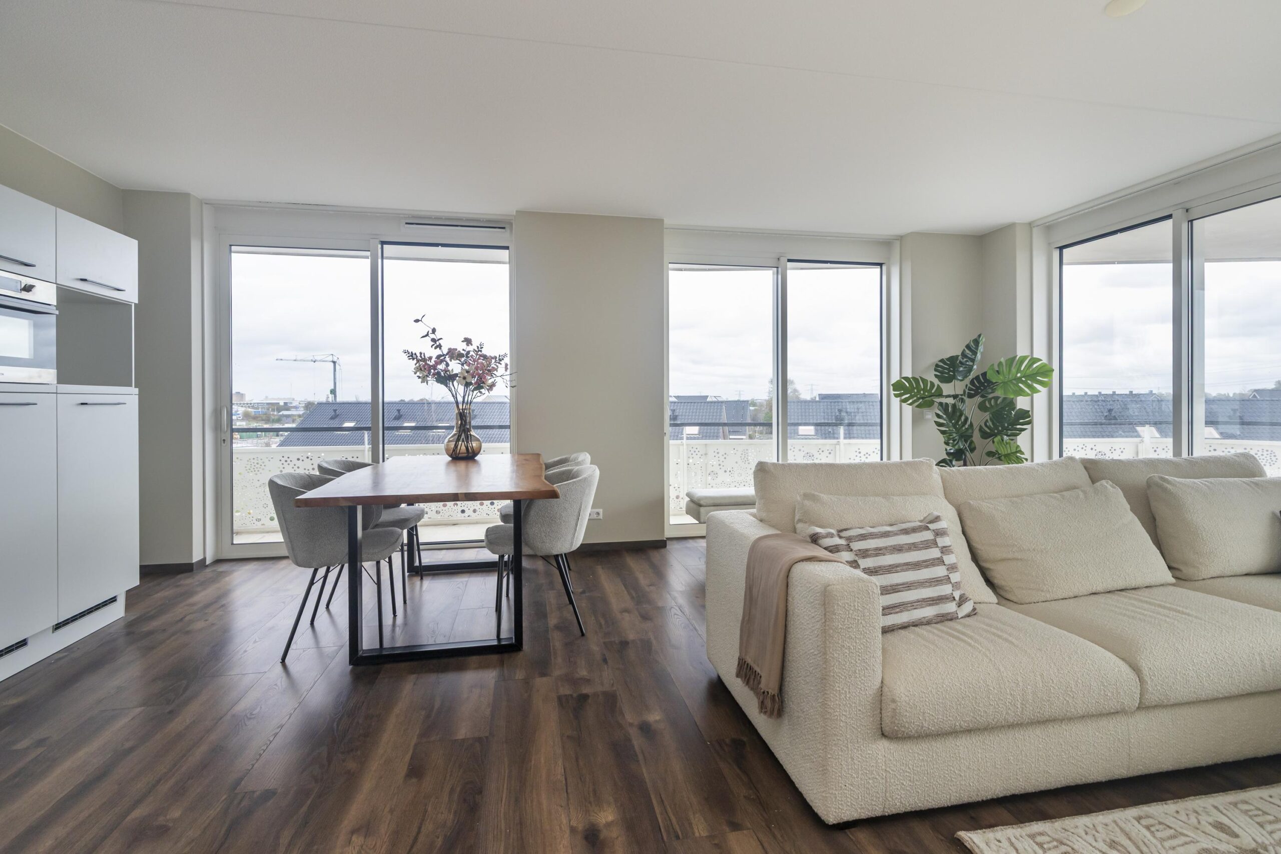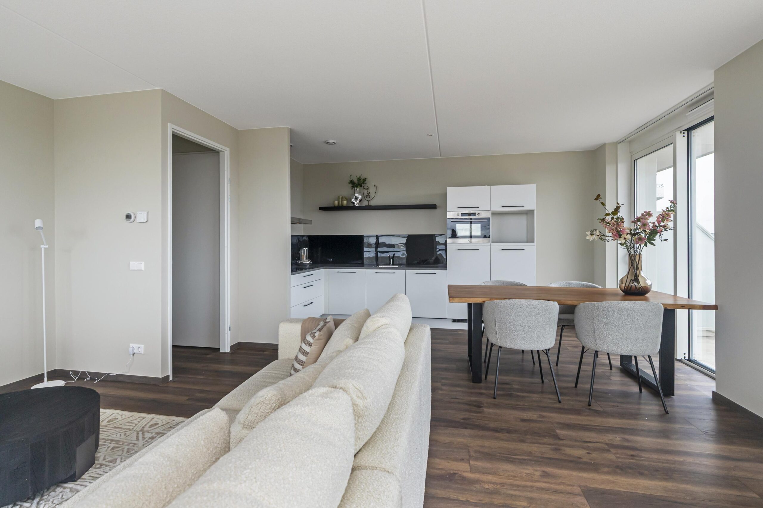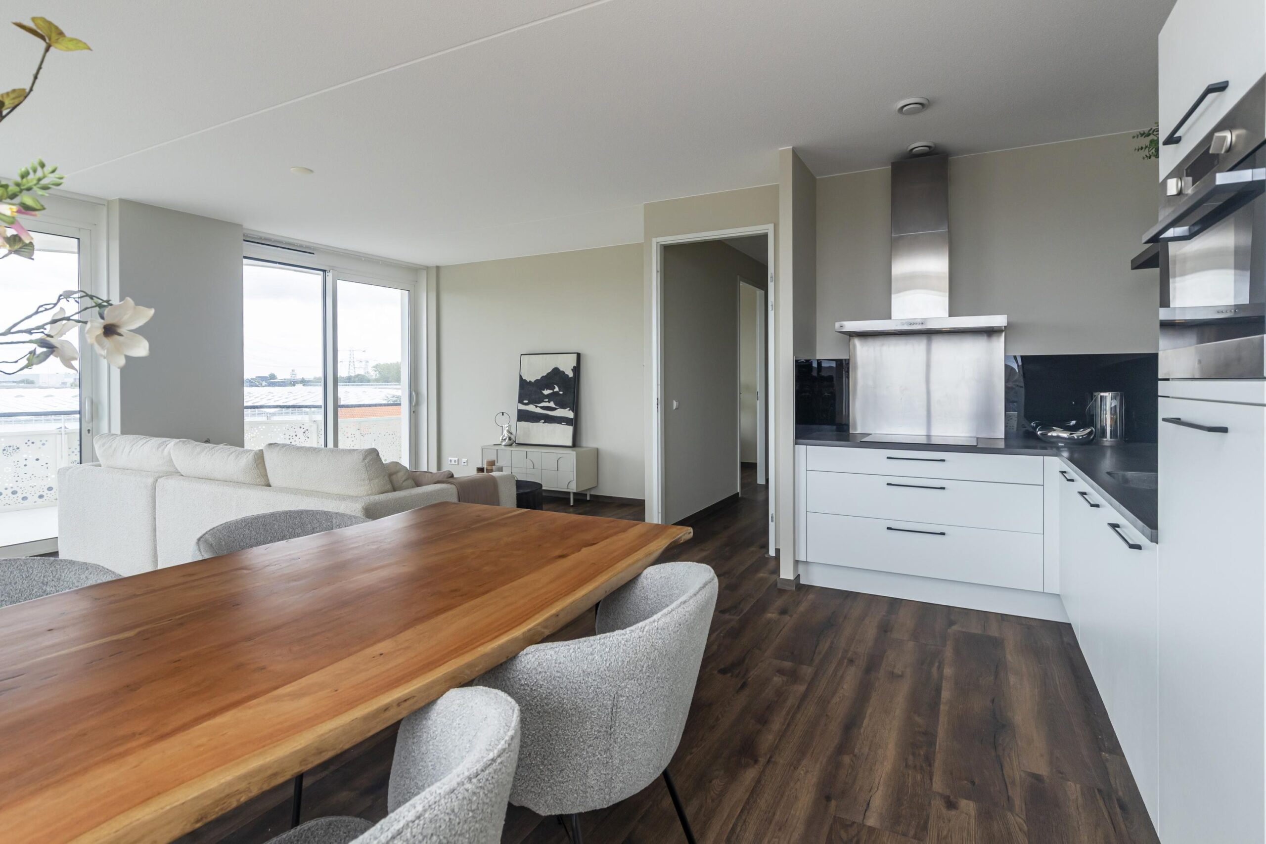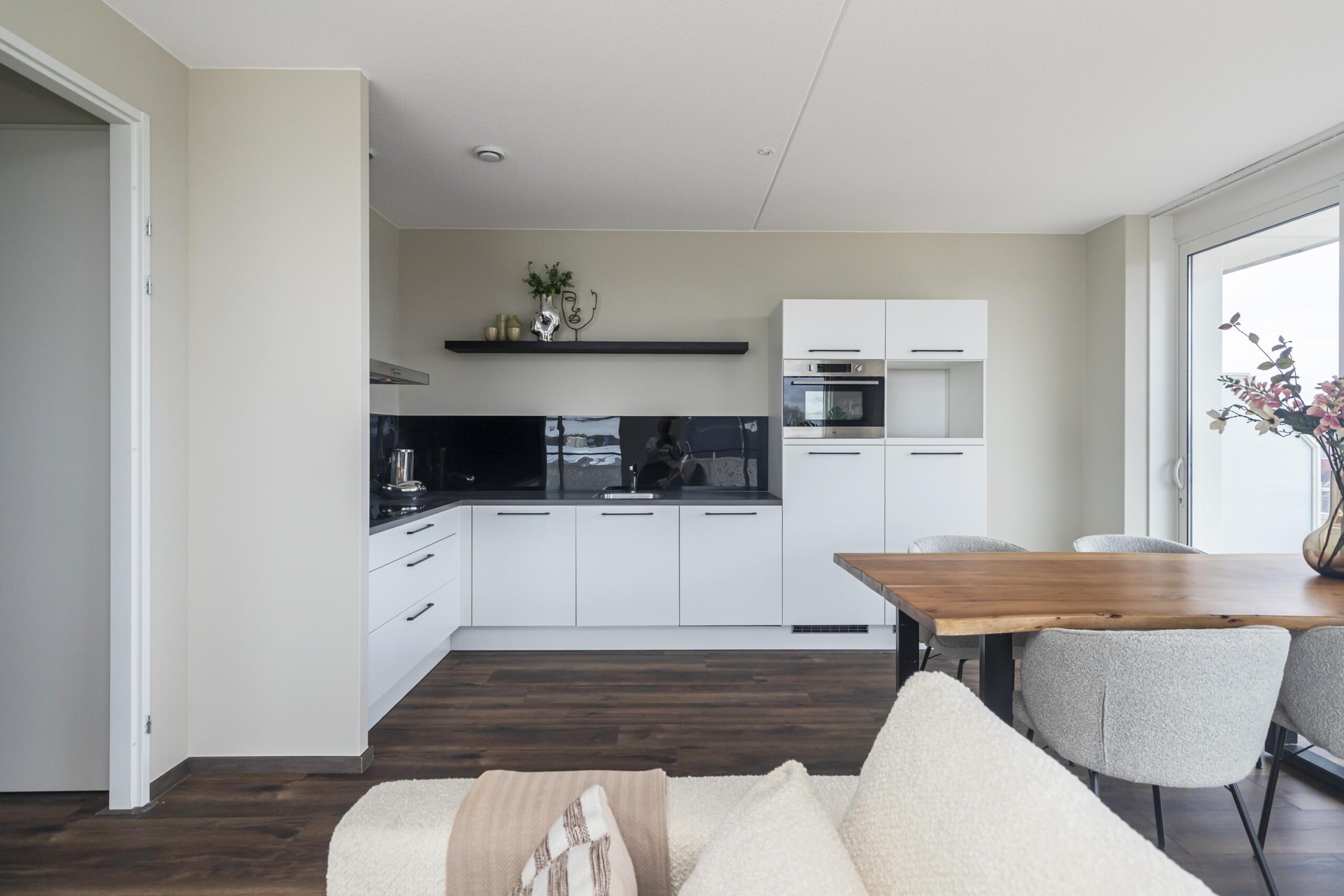 De woonkamer is opvallend licht door de grote raampartijen en staat in open verbinding met de keuken, die is voorzien van moderne inbouwapparatuur. Vanuit de woonkamer stap je het balkon op – een fijne buitenruimte met een prettige combinatie van zon en beschutting. Ideaal voor een ontspannen kop koffie in de ochtend of een borrel aan het eind van de dag.
