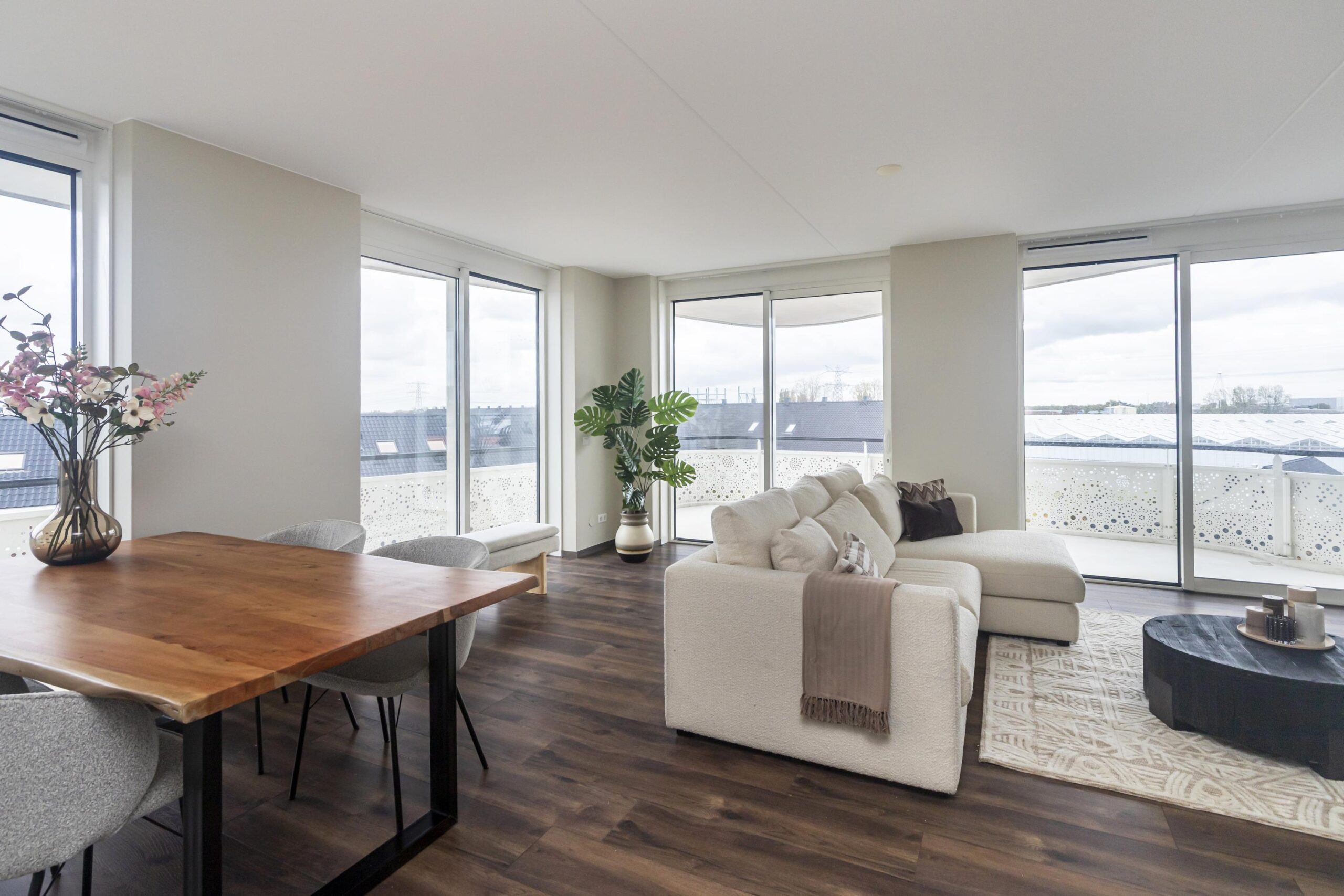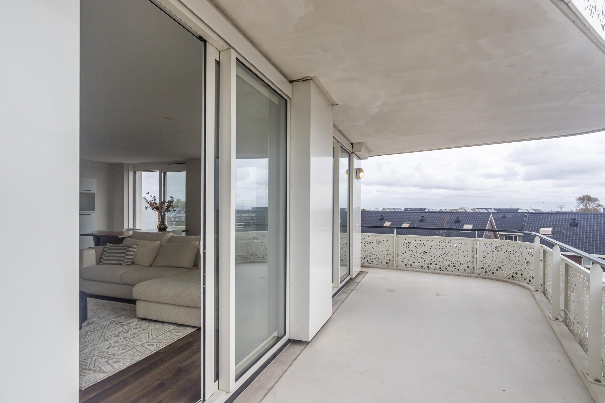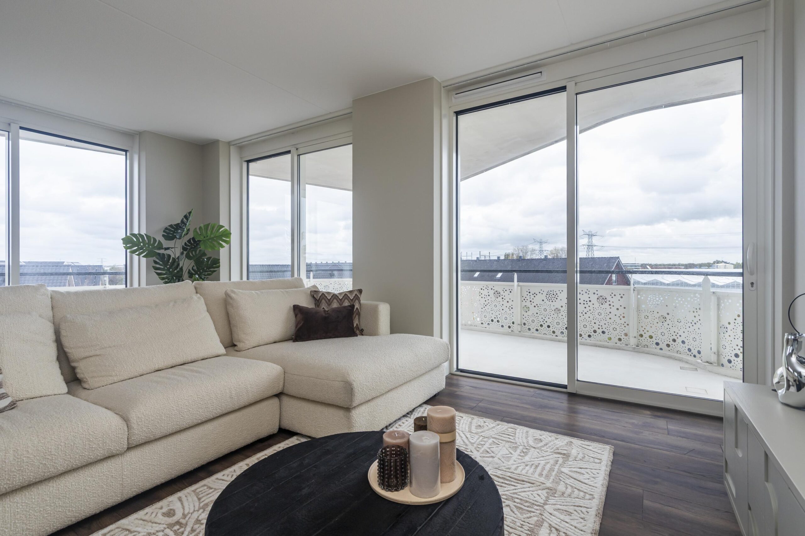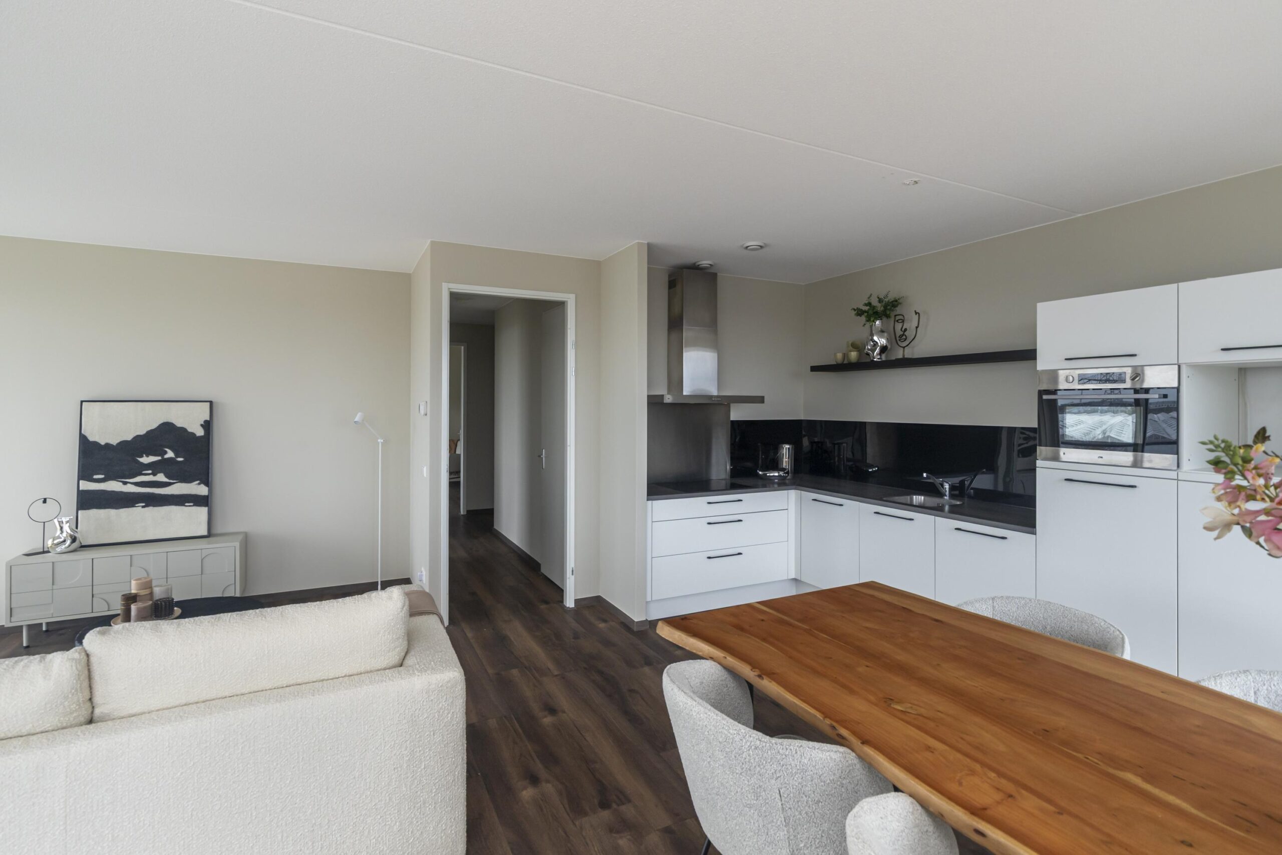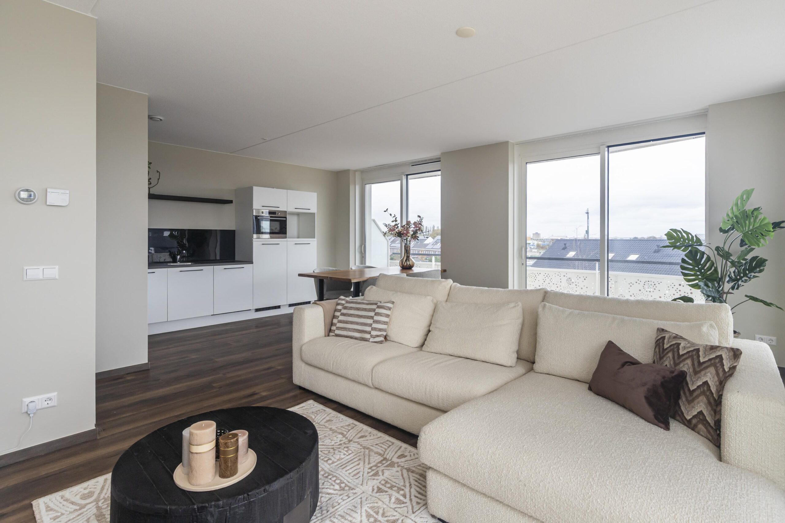 De woonkamer is opvallend licht door de grote raampartijen en staat in open verbinding met de keuken, die is voorzien van moderne inbouwapparatuur. Vanuit de woonkamer stap je het balkon op – een fijne buitenruimte met een prettige combinatie van zon en beschutting. Ideaal voor een ontspannen kop koffie in de ochtend of een borrel aan het eind van de dag.