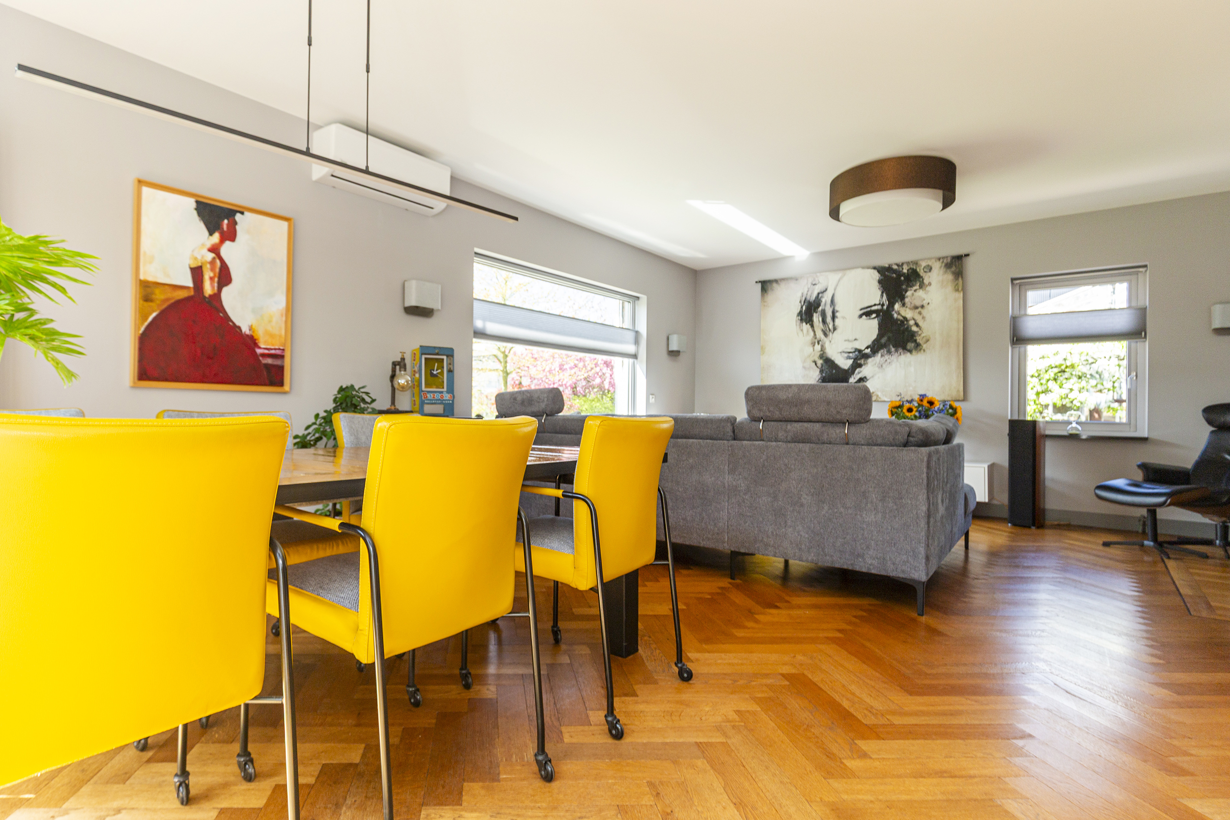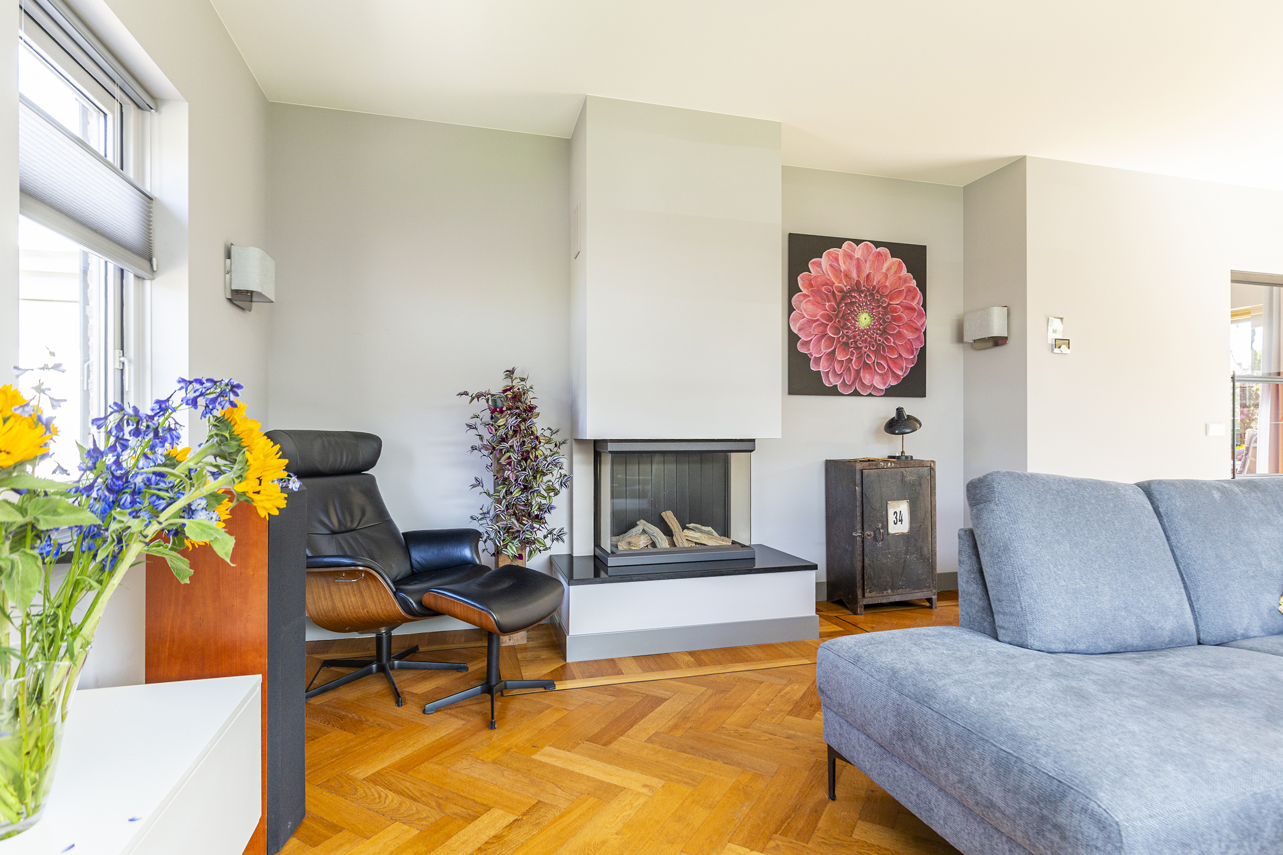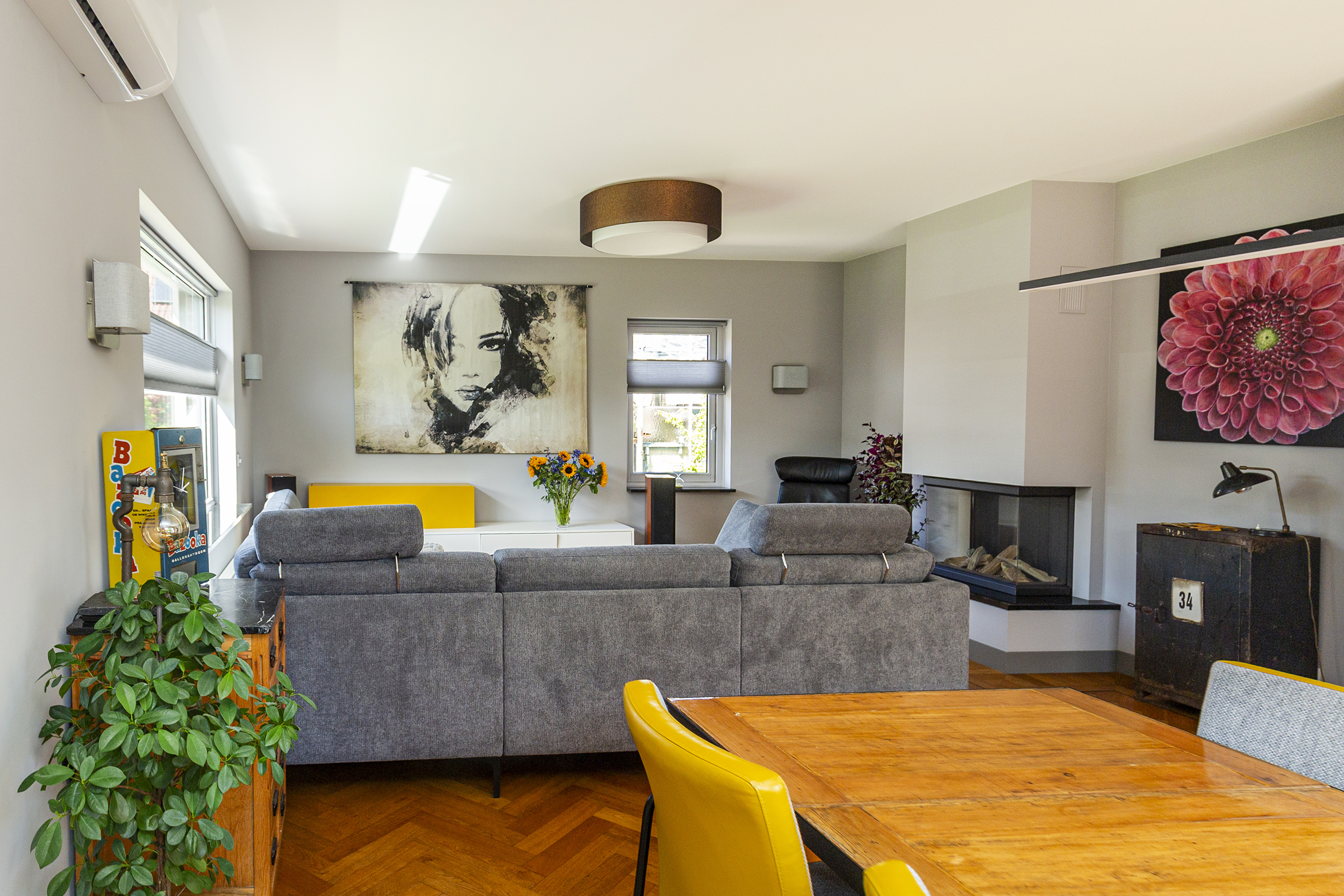 Via de taatsdeur komt u in de living. Ook hier valt direct op hoe licht en ruim deze ruimte aanvoelt. De (gas)haard zorgt voor sfeer en de massief houten vloer met vloerverwarming geeft het geheel een warme uitstraling. Dit is een woonkamer waar u met gemak samen bent, maar waar ook alle ruimte is om rustig te ontspannen.