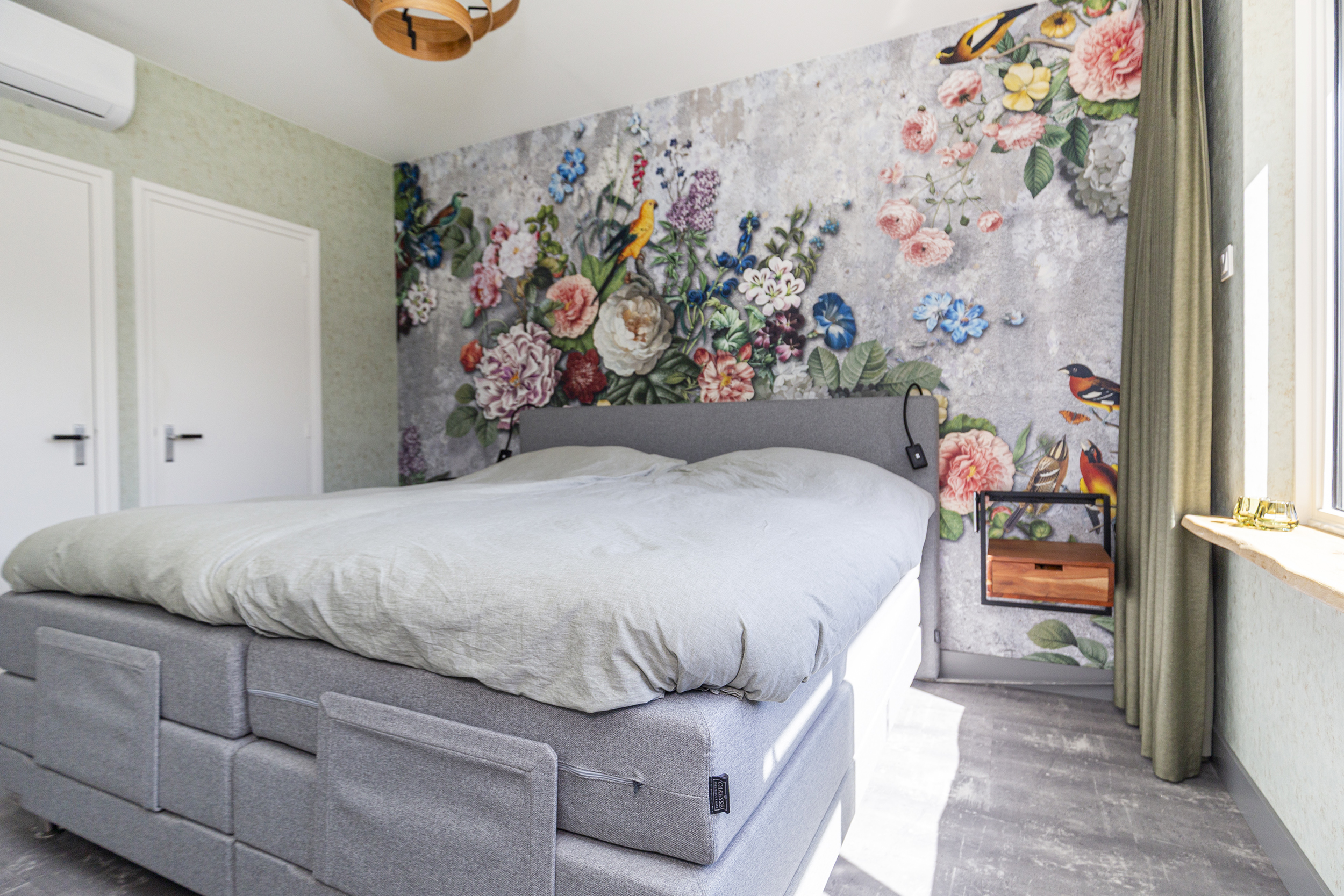 De slaapkamer op de begane grond is ruim van opzet en kijkt uit op de fraai aangelegde tuin. Dankzij de airconditioning en de badkamer ensuite is dit een heel fijne plek voor gelijkvloers wonen. De badkamer is smaakvol afgewerkt en voorzien van een ruime inloopdouche, dubbele wastafel en toilet. Daarnaast is er op deze verdieping nog een separaat gastentoilet.
