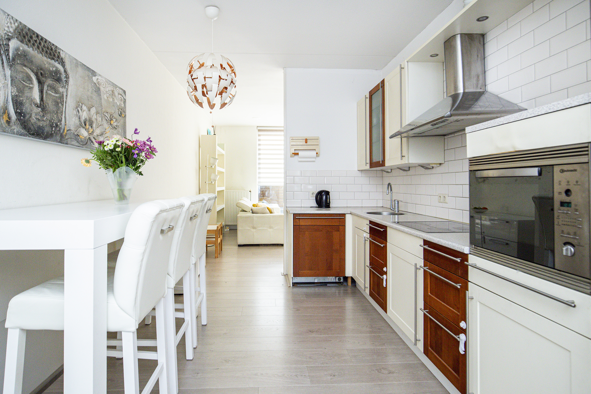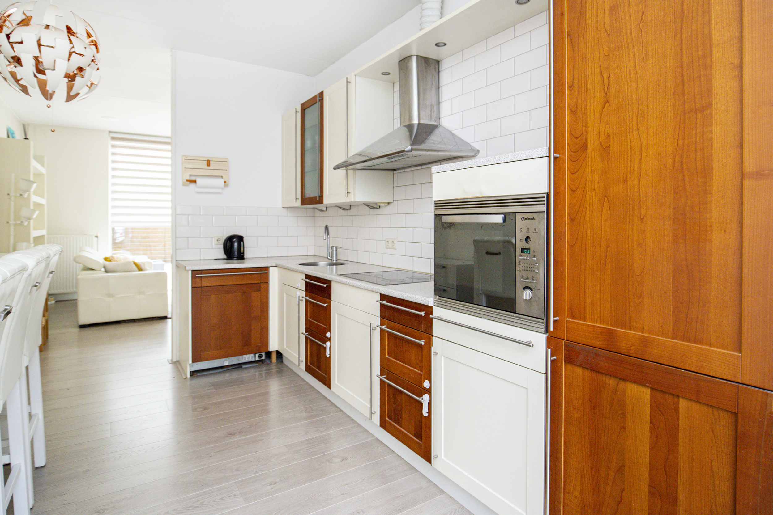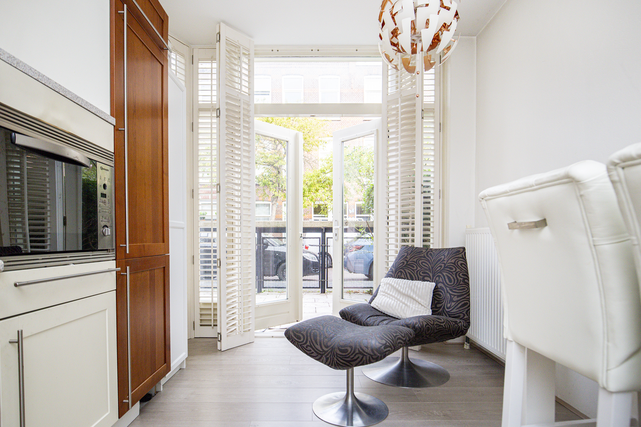 De nette voortuin leidt naar de entree van de woning. In de hal bevinden zich het toilet met fonteintje, de meterkast en de trap naar boven. De woonkamer is opvallend licht dankzij de grote schuifpui richting de zonnige achtertuin op het zuidoosten. Aan de achterzijde is elektrische zonwering aanwezig, ideaal op warme dagen. De open keuken aan de voorzijde is voorzien van inbouwapparatuur en heeft openslaande deuren naar een betegeld terras aan de voorkant – een prettige plek voor een kop koffie in de ochtendzon. Een trapkast biedt extra opbergruimte.