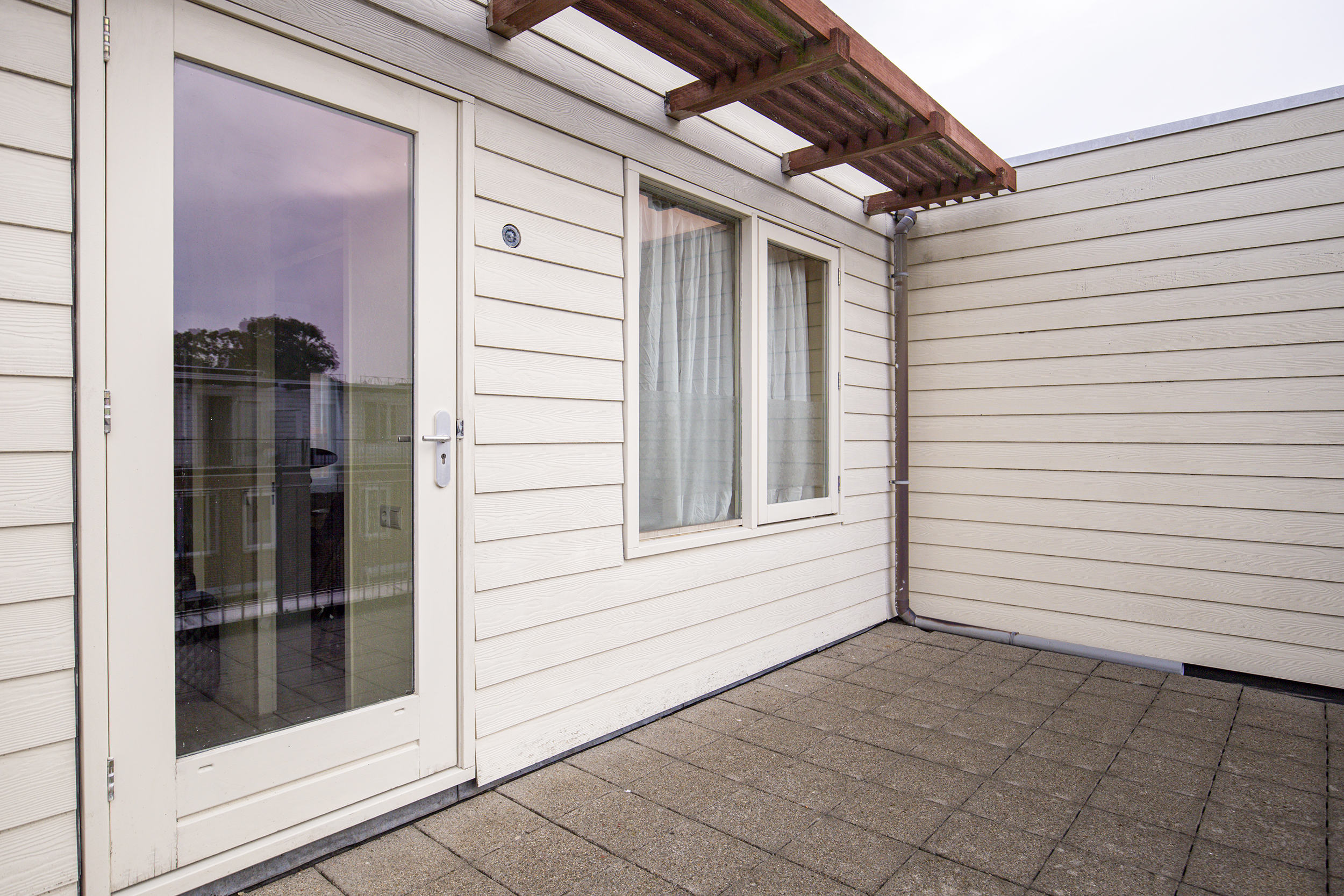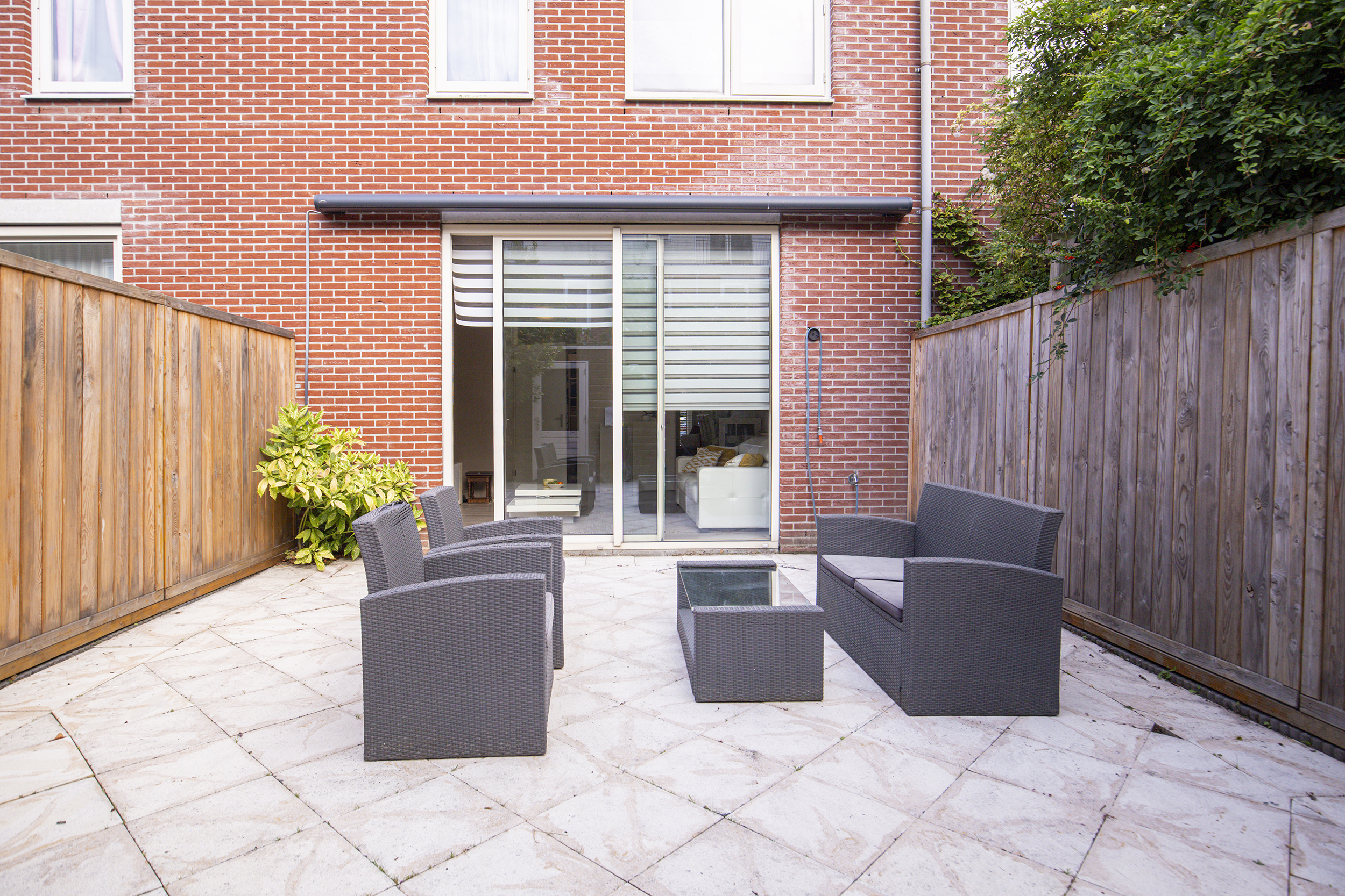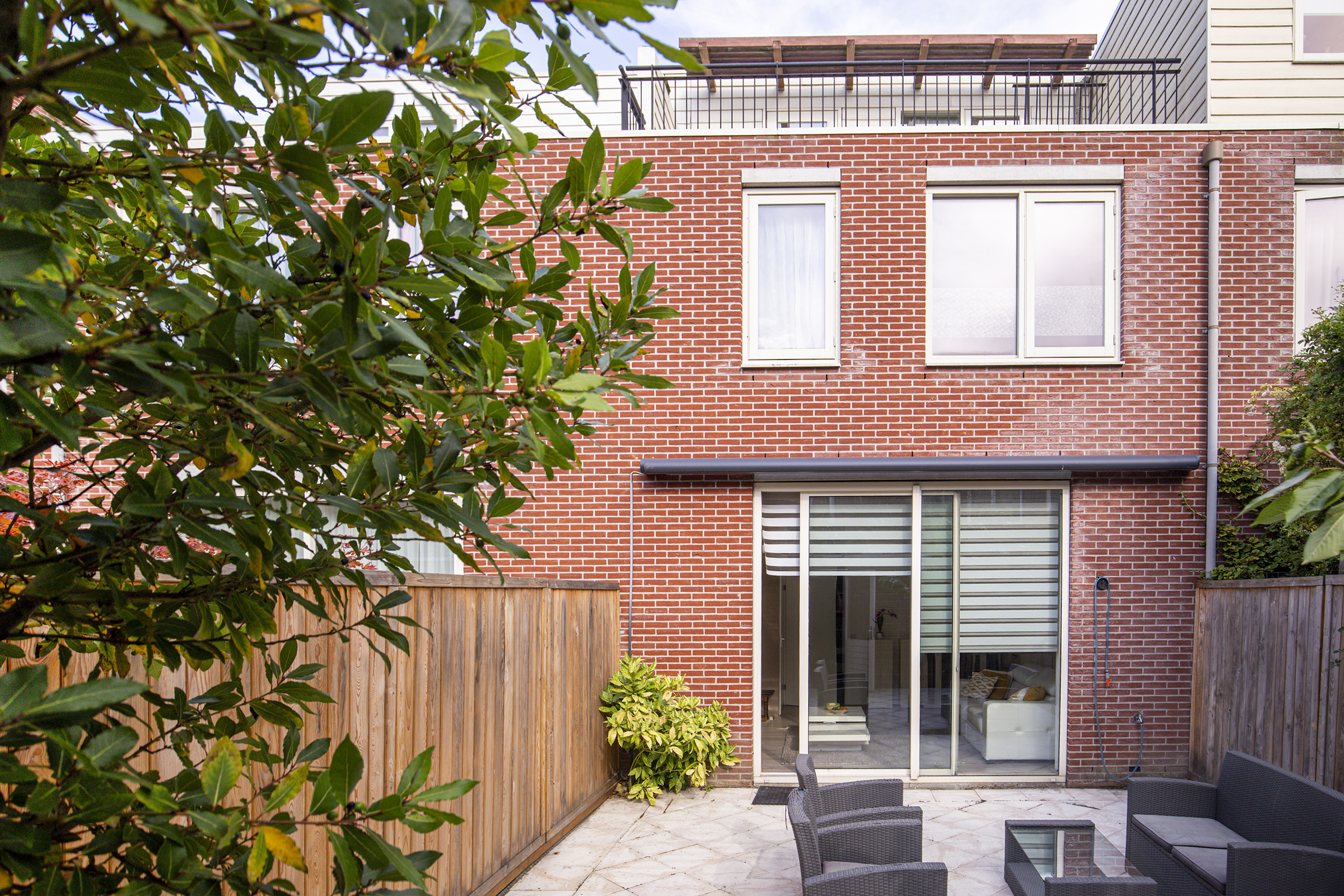 • Betegelde voor- en achtertuin, balkon én dakterras