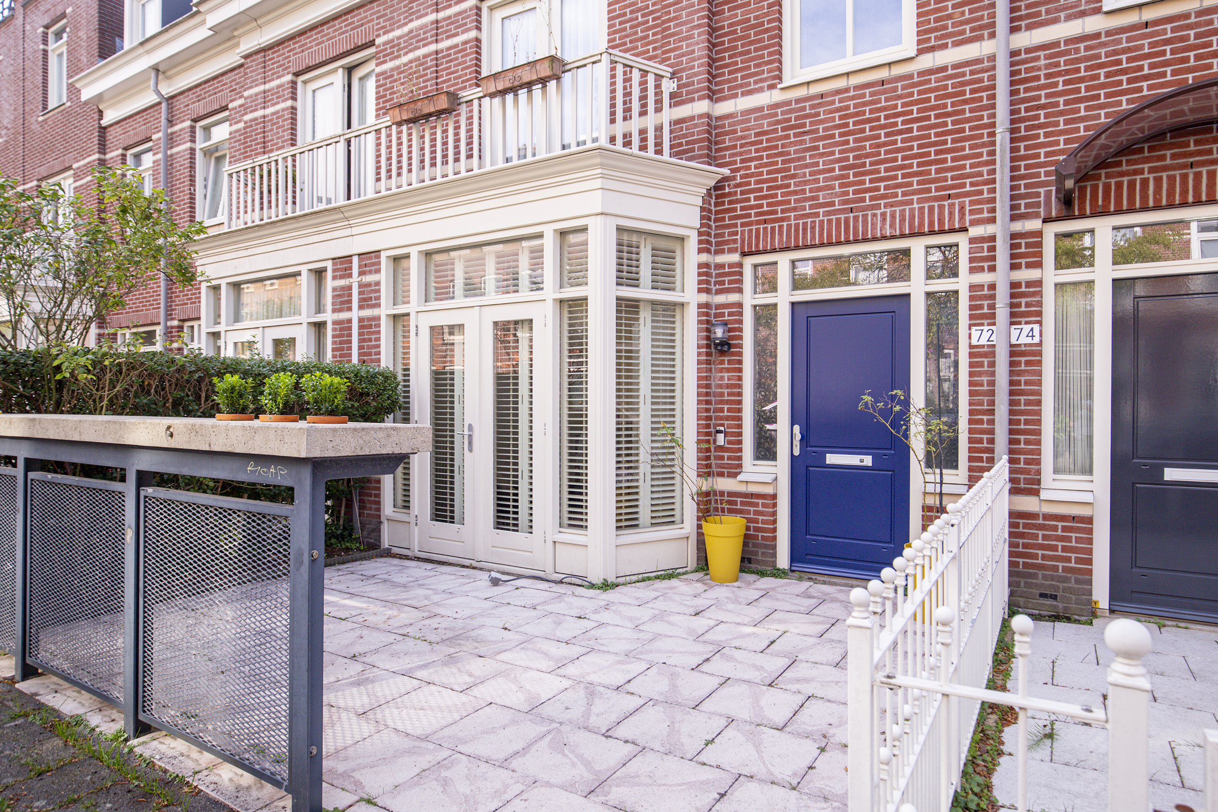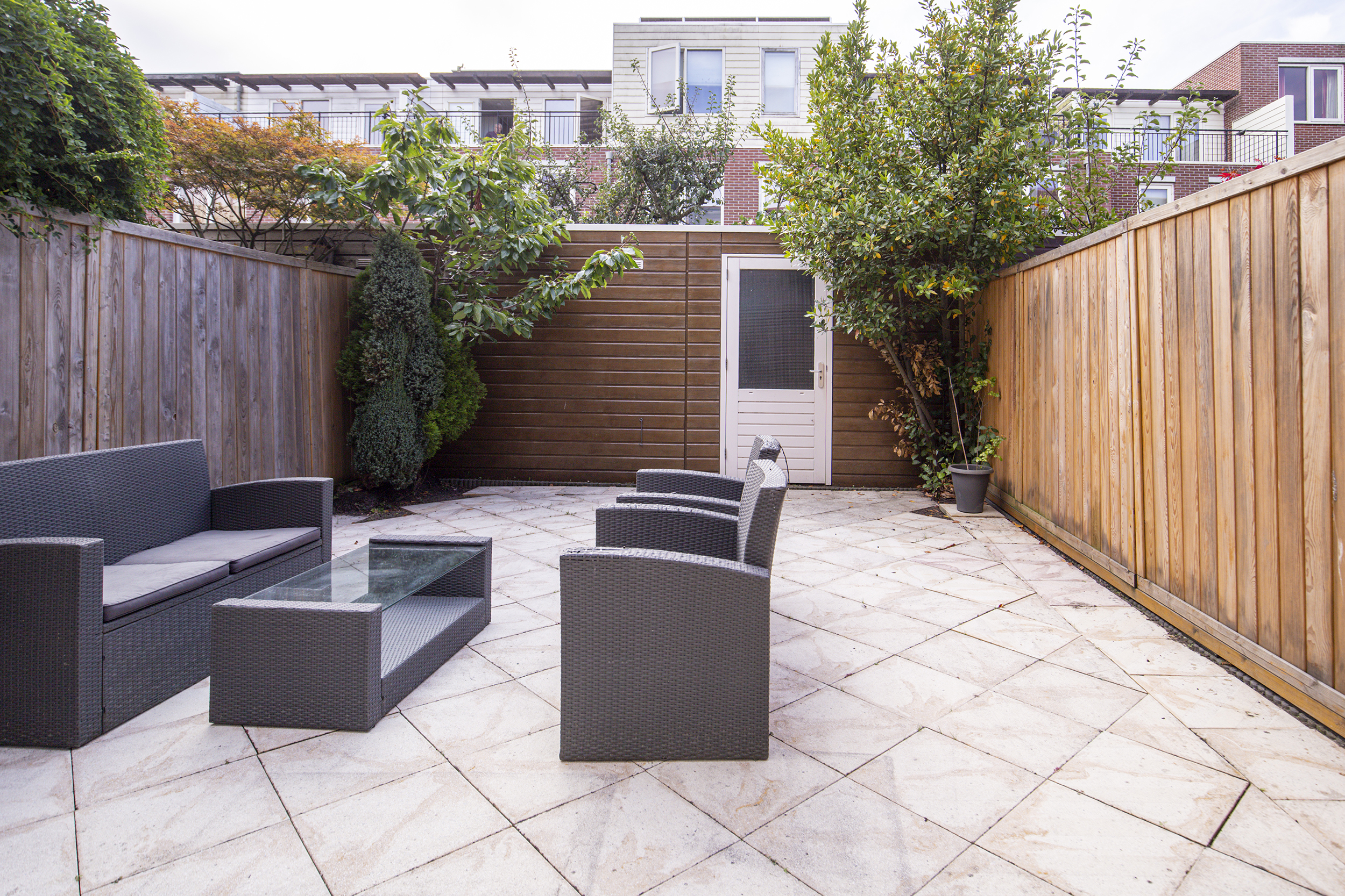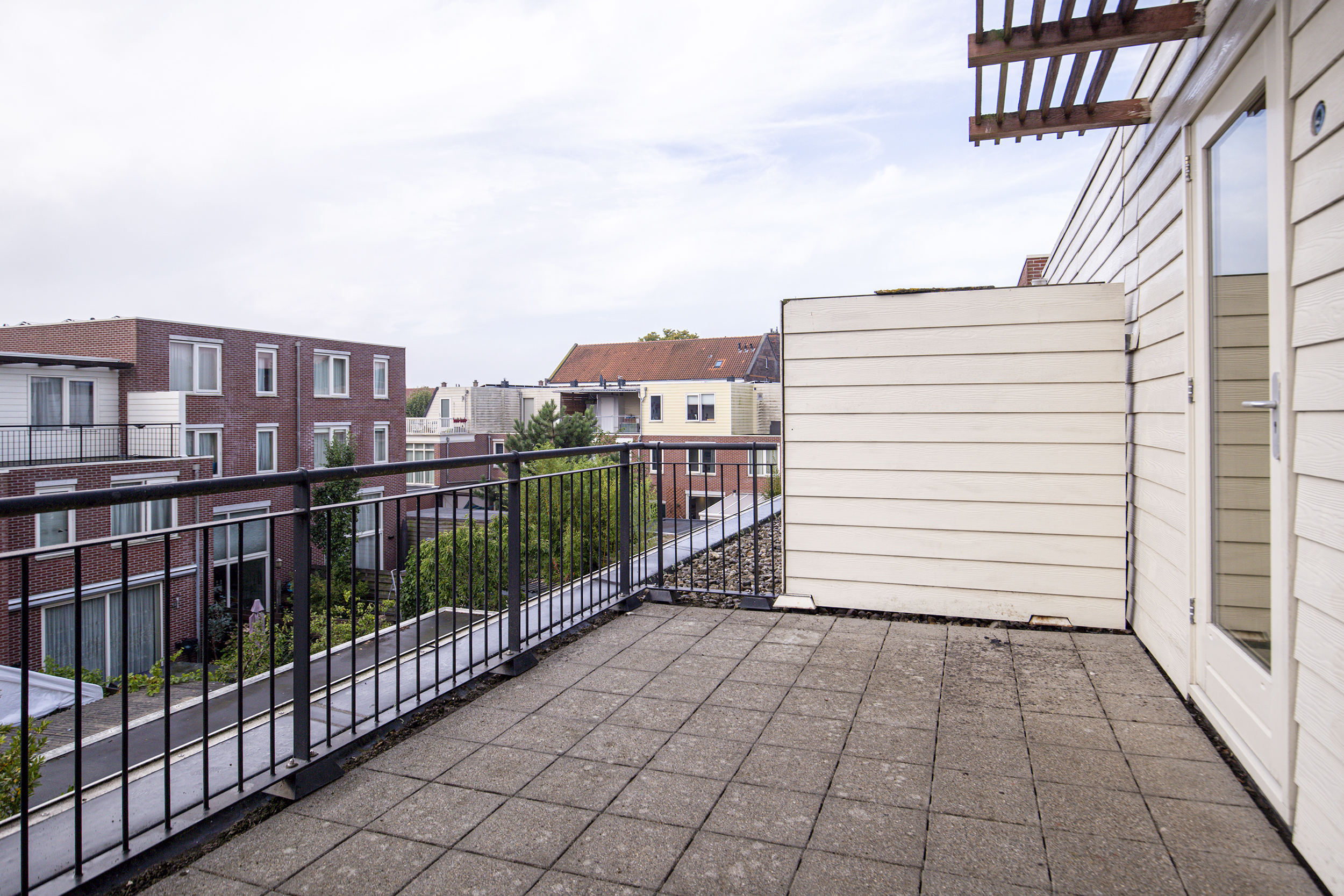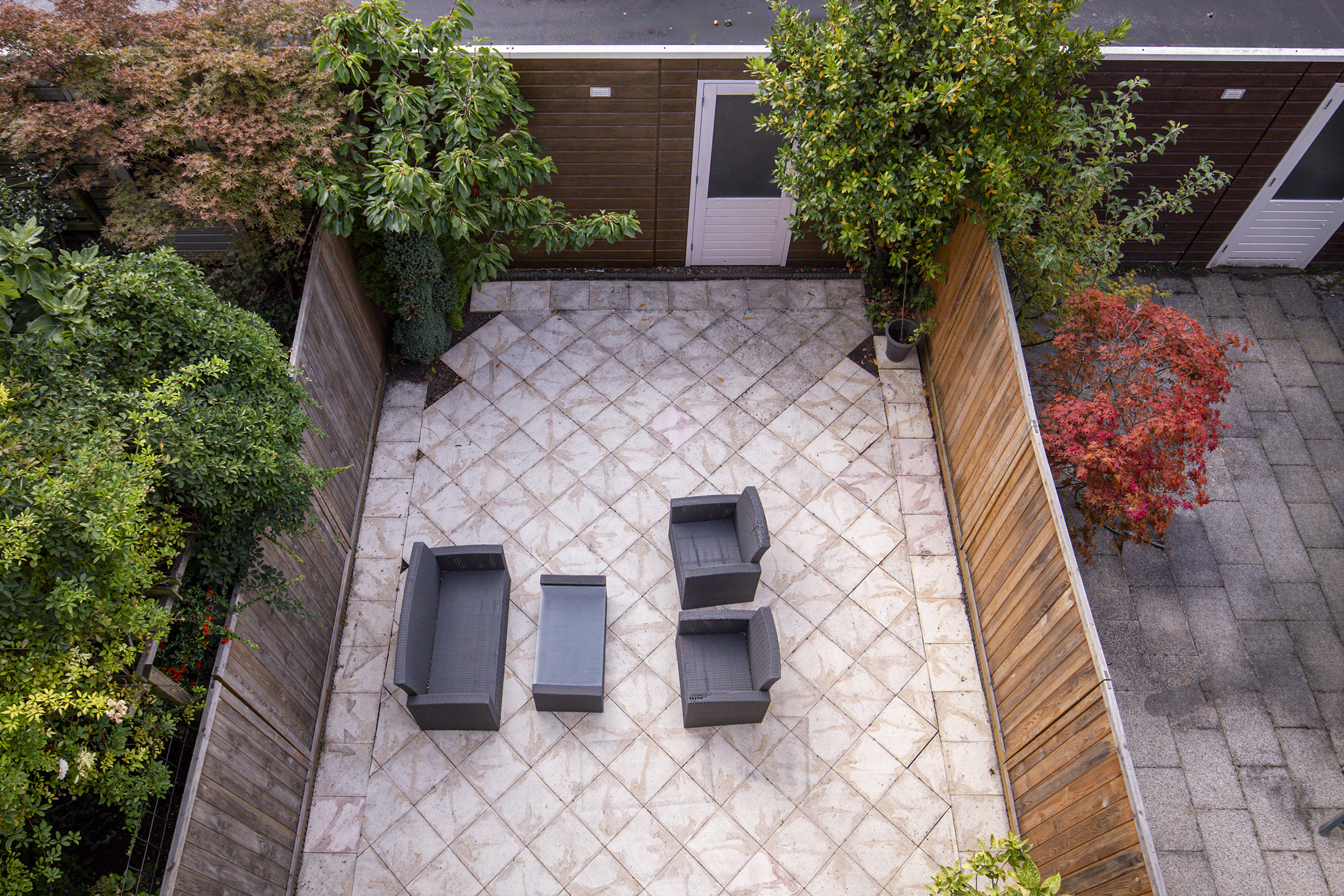 • Betegelde voor- en achtertuin, balkon én dakterras