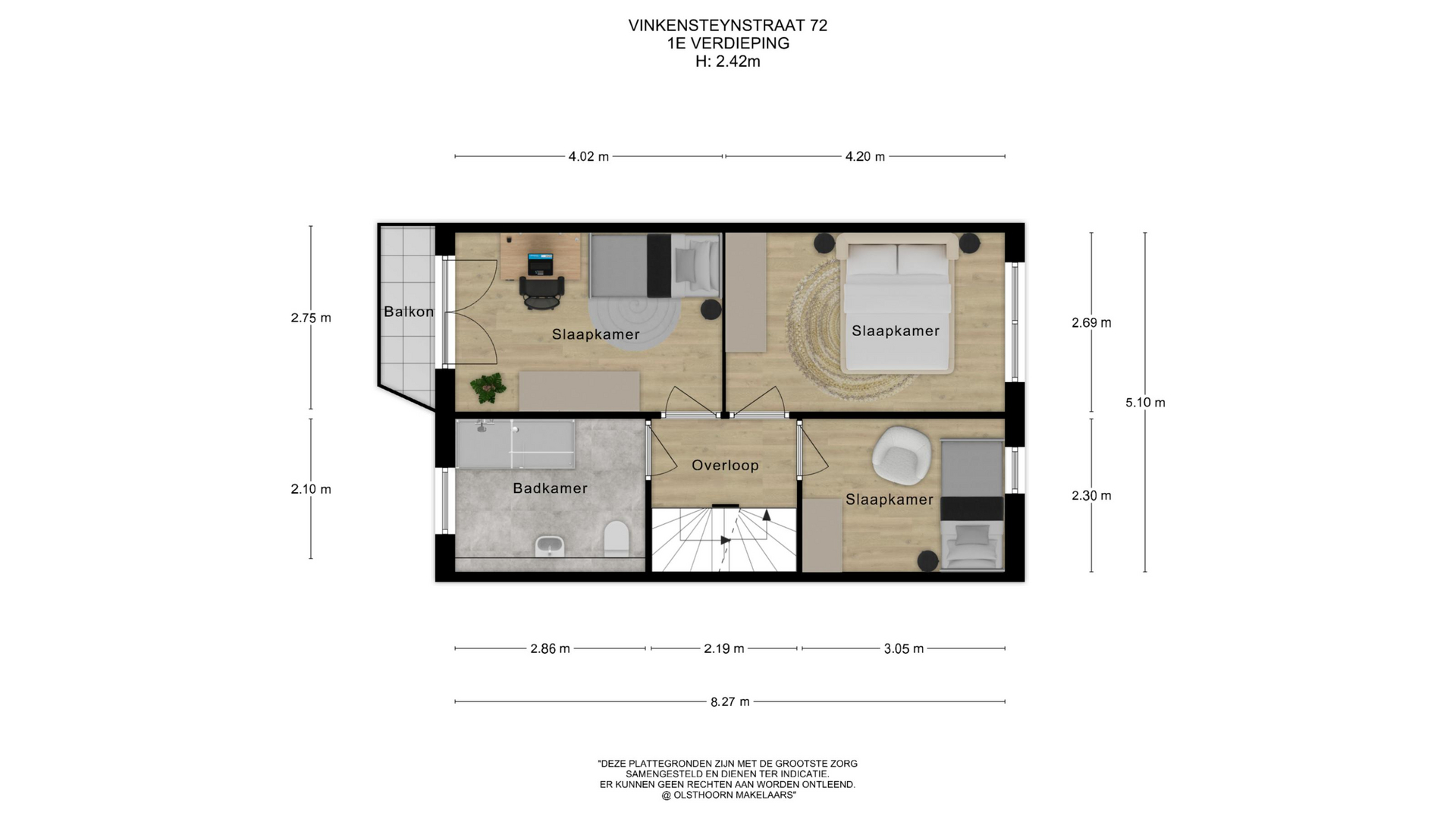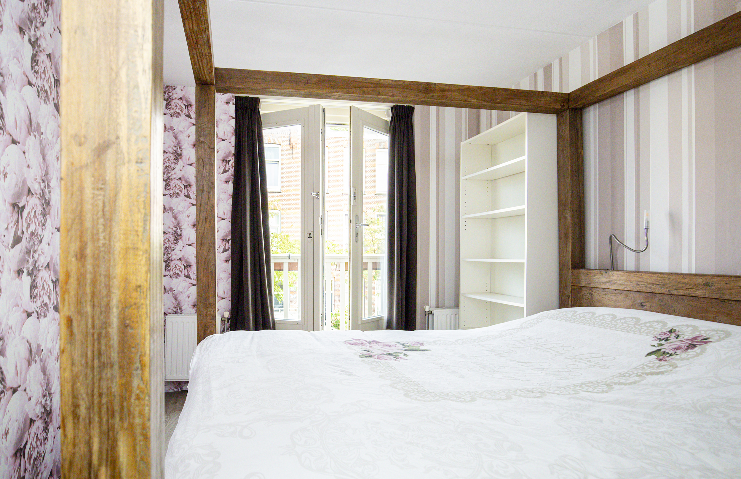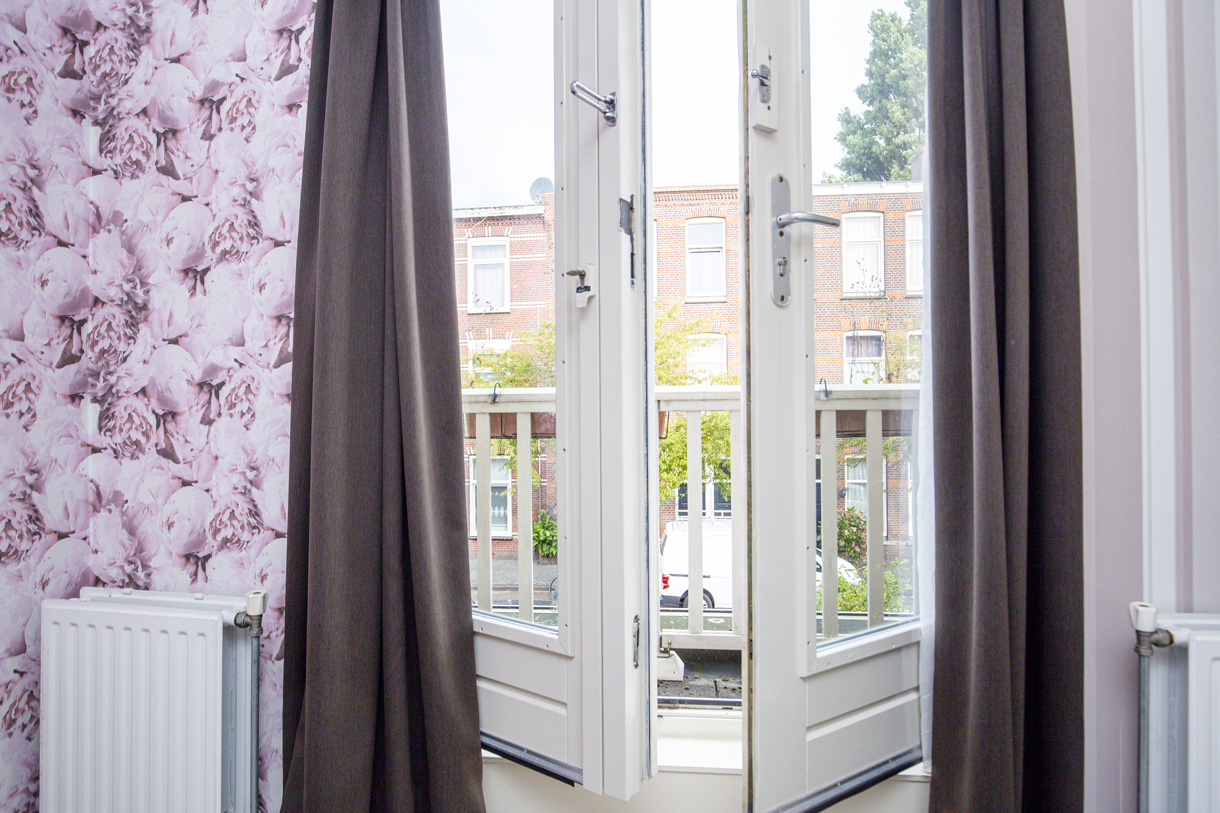 Deze verdieping telt drie slaapkamers: twee aan de achterzijde en één aan de voorzijde met een charmant balkon. De badkamer is praktisch ingedeeld met een inloopdouche, tweede toilet, wastafel en een raam voor daglicht en ventilatie.