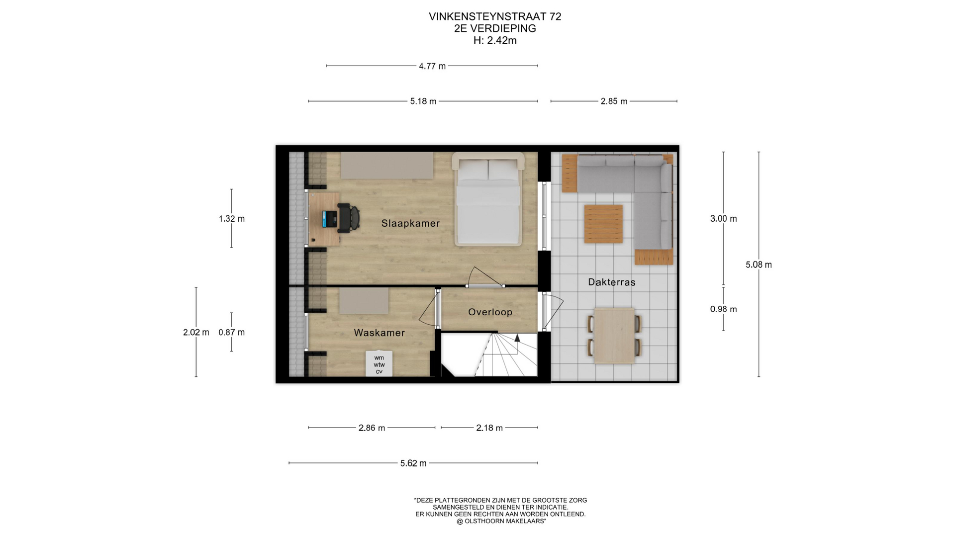 De ruime zolderverdieping loopt over de volle lengte van het huis en beschikt over ramen aan voor- en achterzijde. Deze verdieping is multifunctioneel en kan gebruikt worden als extra slaapkamer, werkplek of hobbyruimte. Vanuit de overloop is het ruime dakterras bereikbaar. Verder is hier de afgesloten technische ruimte met de HR-combiketel (2015), vernieuwde WTW-unit (2020), omvormer, wasmachineaansluiting en extra bergruimte.