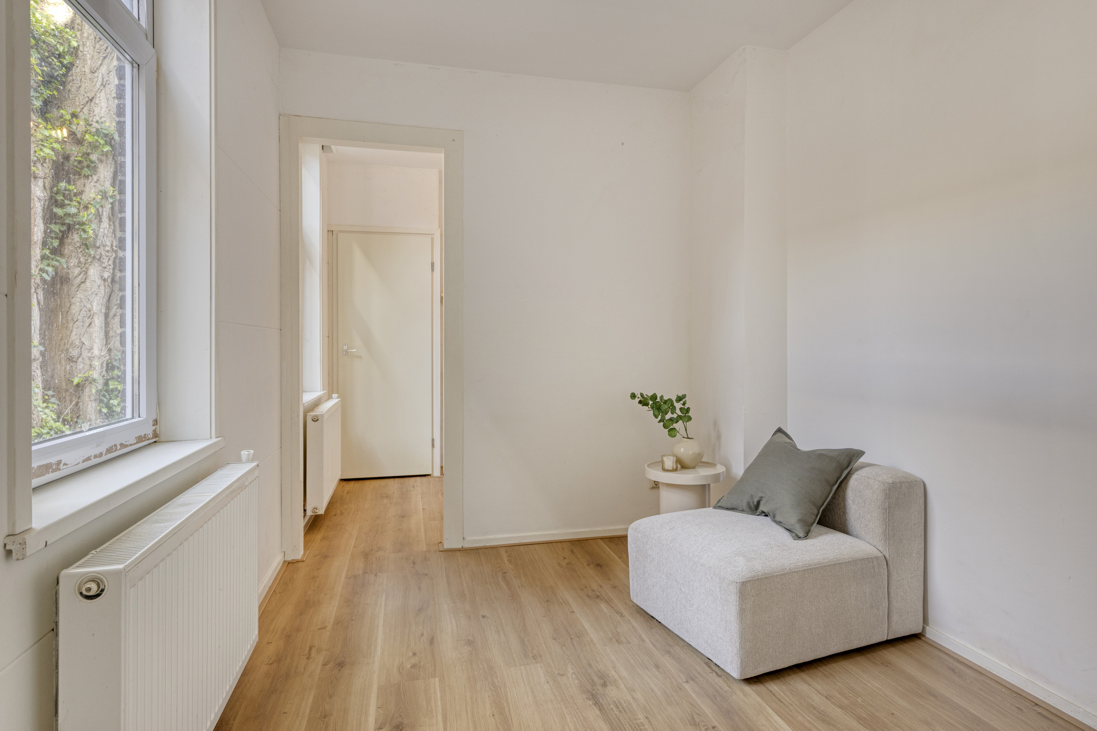 Hier is de entree van de woning met een halletje. Vanuit hier is er toegang tot de ruime woonkamer. Hier is voldoende plaats voor een grote eettafel en een ruime zithoek. Er is een voorzij-kamer. Deze is goed te gebruiken als thuiswerkplek of opslag voor de spullen.