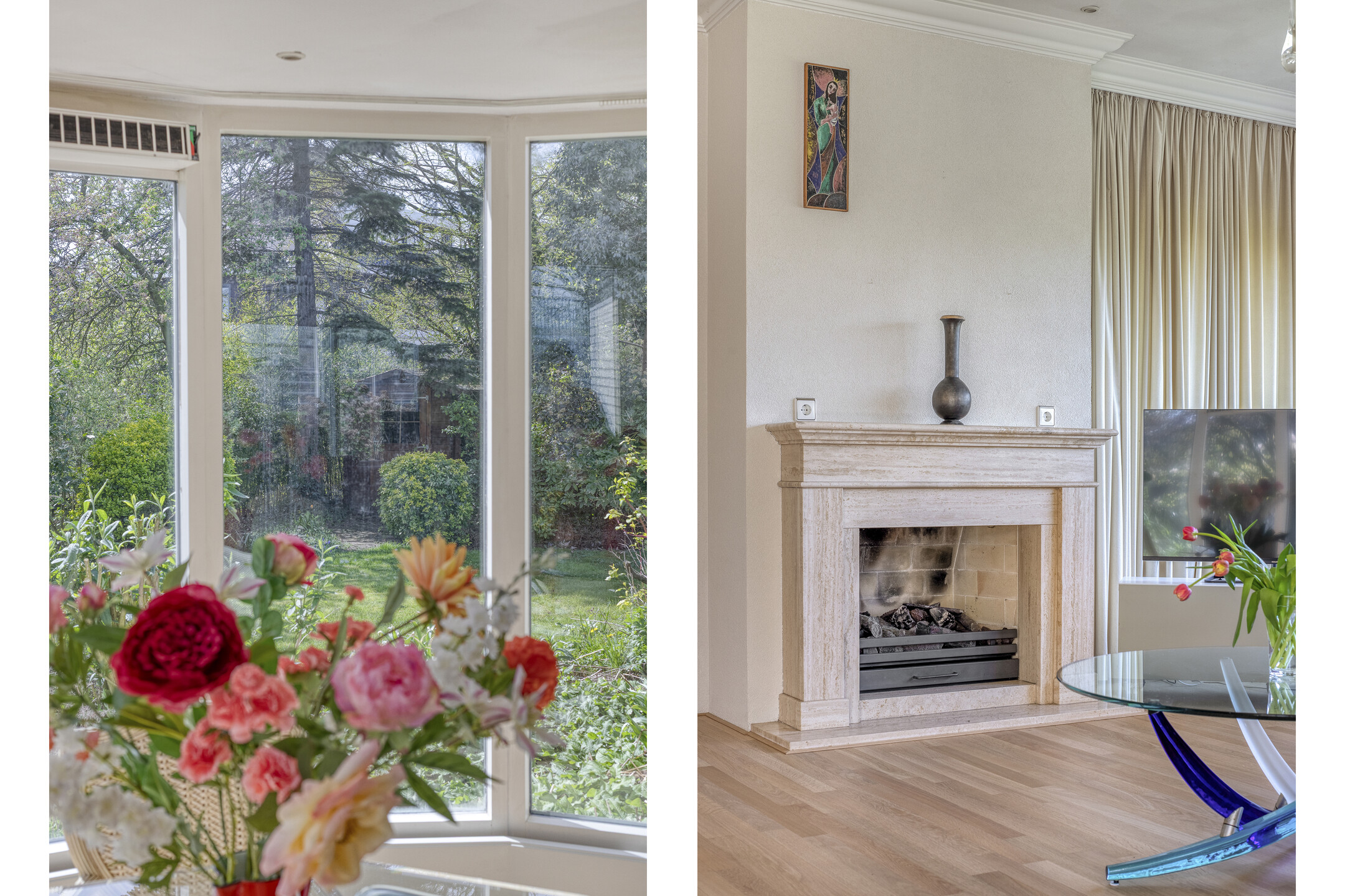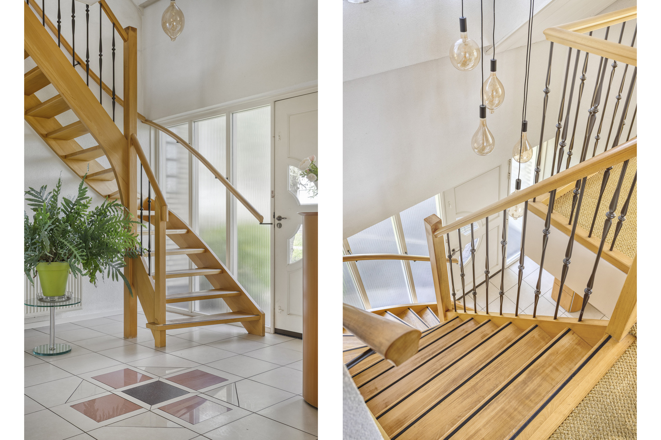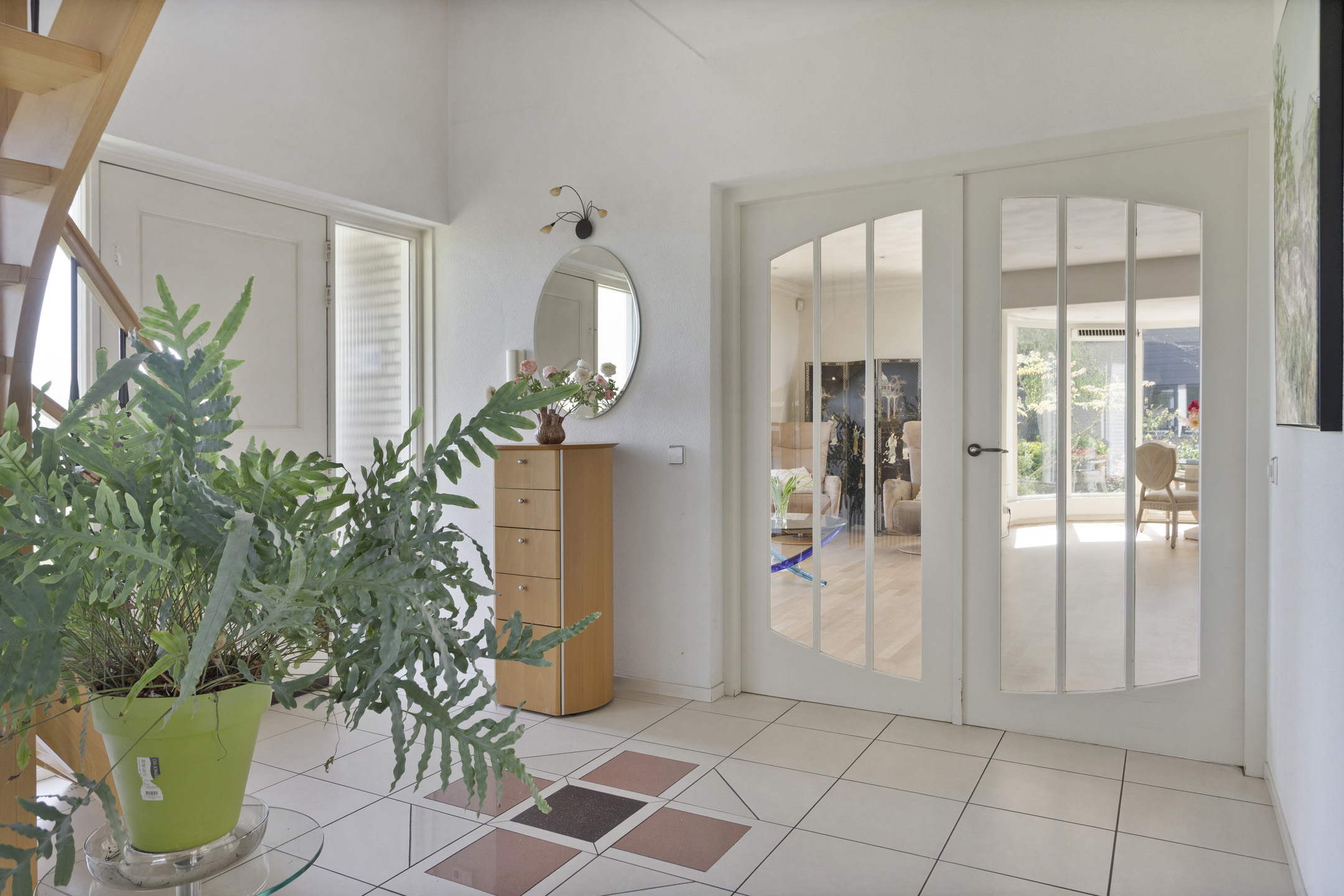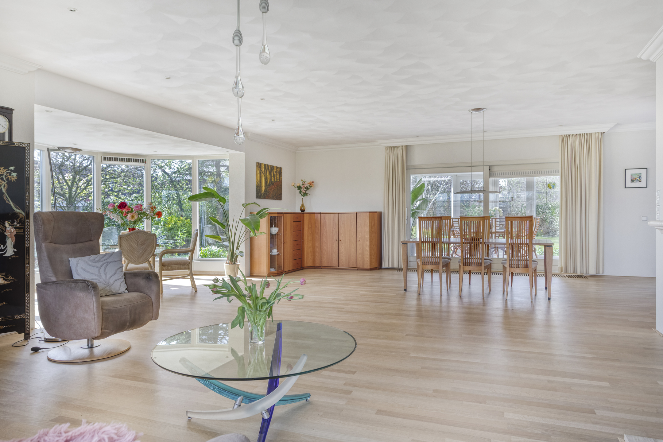 Via de entree kom je in een ruime hal met garderobe, toiletruimte en trapopgang. Vanuit hier betreed je de royale woonkamer, het hart van de woning. De speelse vormgeving, met serre en erker, zorgt voor een prettige dynamiek en meerdere zitplekken. Grote raampartijen brengen het buitenleven naar binnen en zorgen voor een aangename lichtinval gedurende de hele dag.