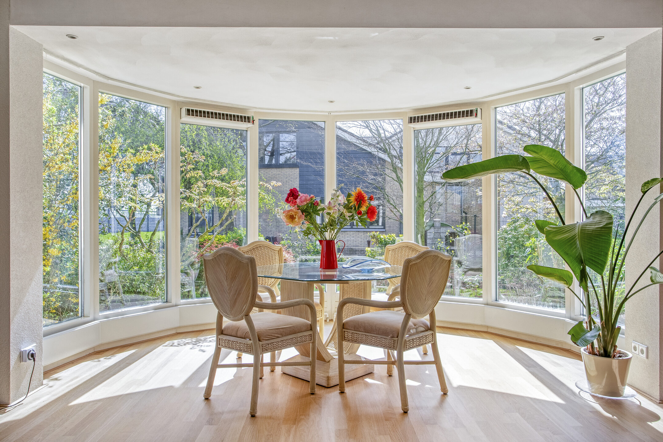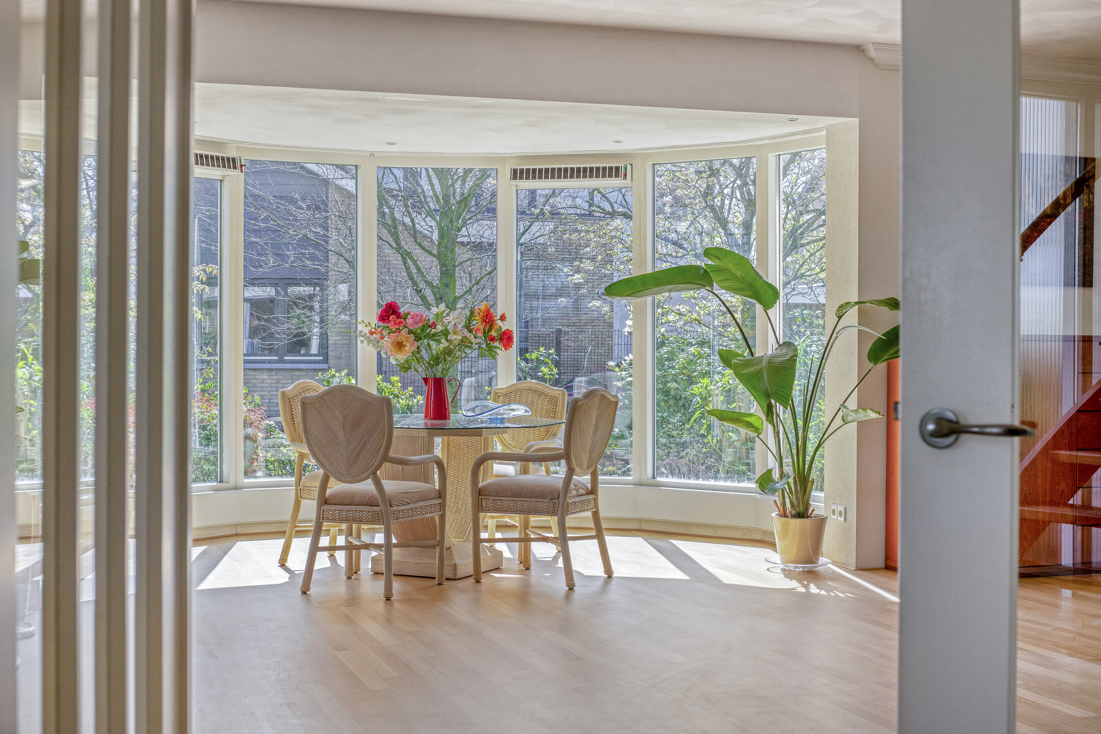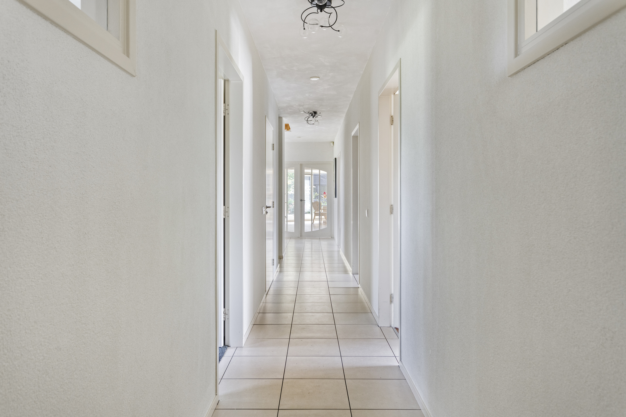 Via de entree kom je in een ruime hal met garderobe, toiletruimte en trapopgang. Vanuit hier betreed je de royale woonkamer, het hart van de woning. De speelse vormgeving, met serre en erker, zorgt voor een prettige dynamiek en meerdere zitplekken. Grote raampartijen brengen het buitenleven naar binnen en zorgen voor een aangename lichtinval gedurende de hele dag.