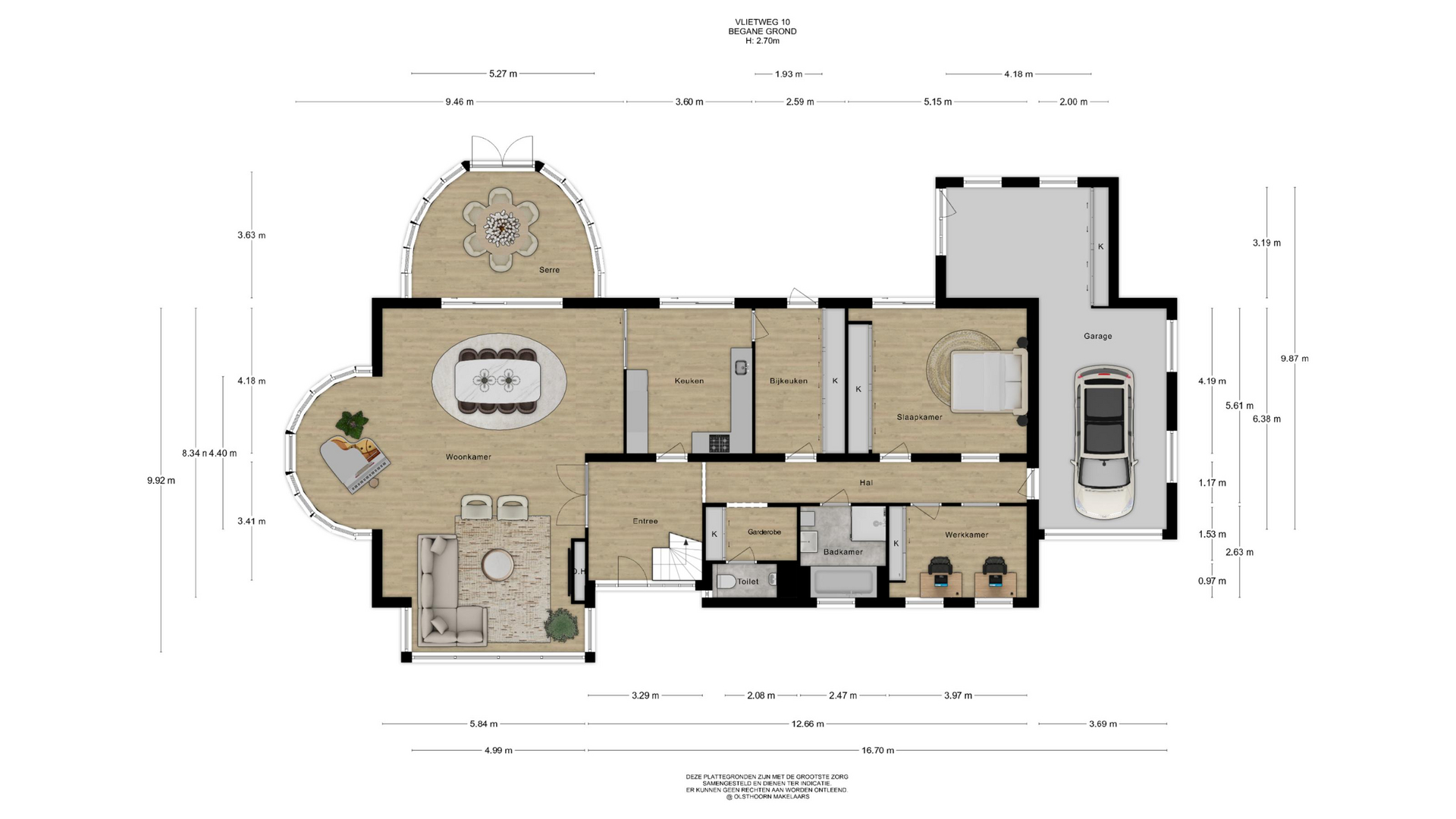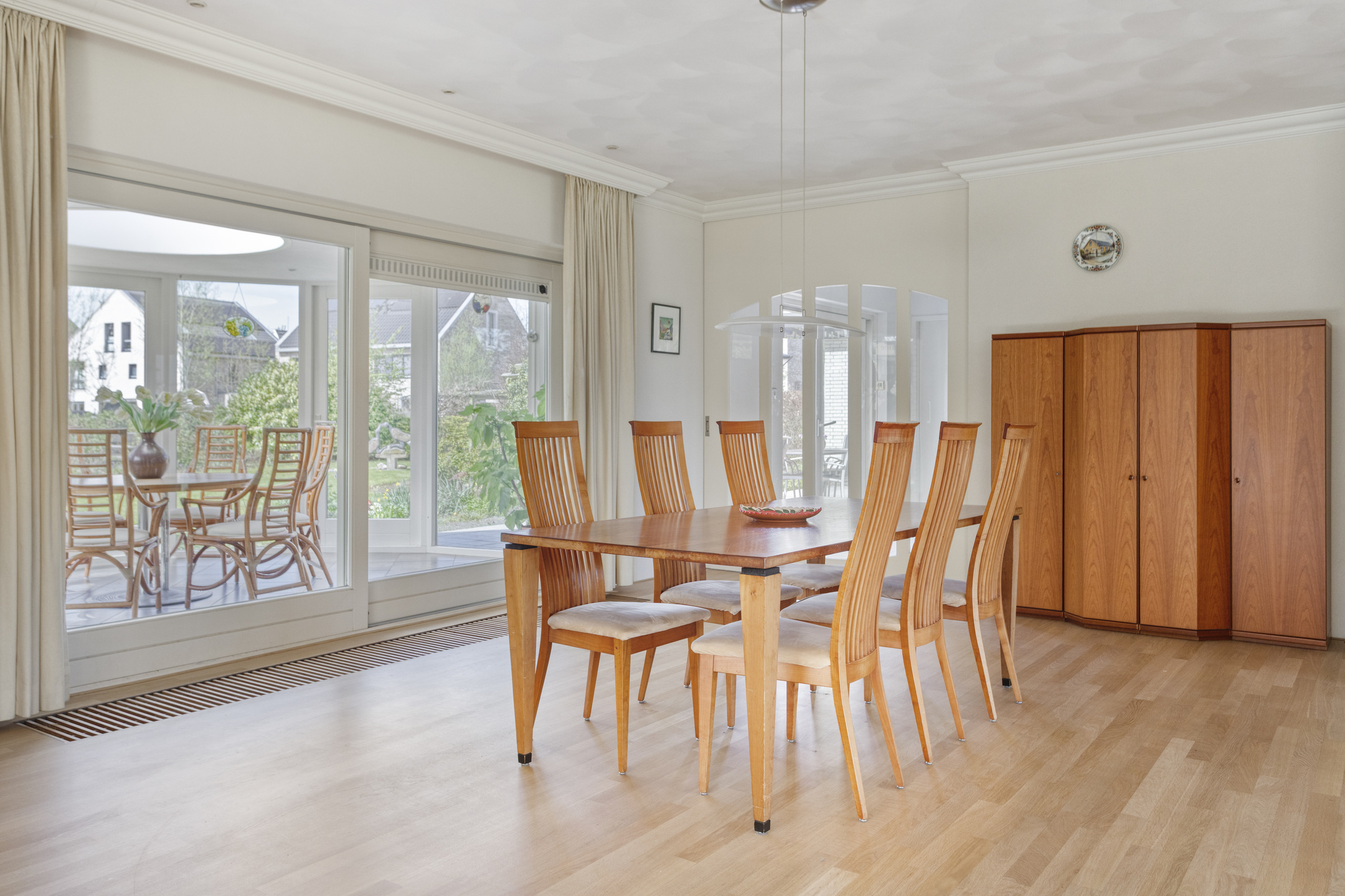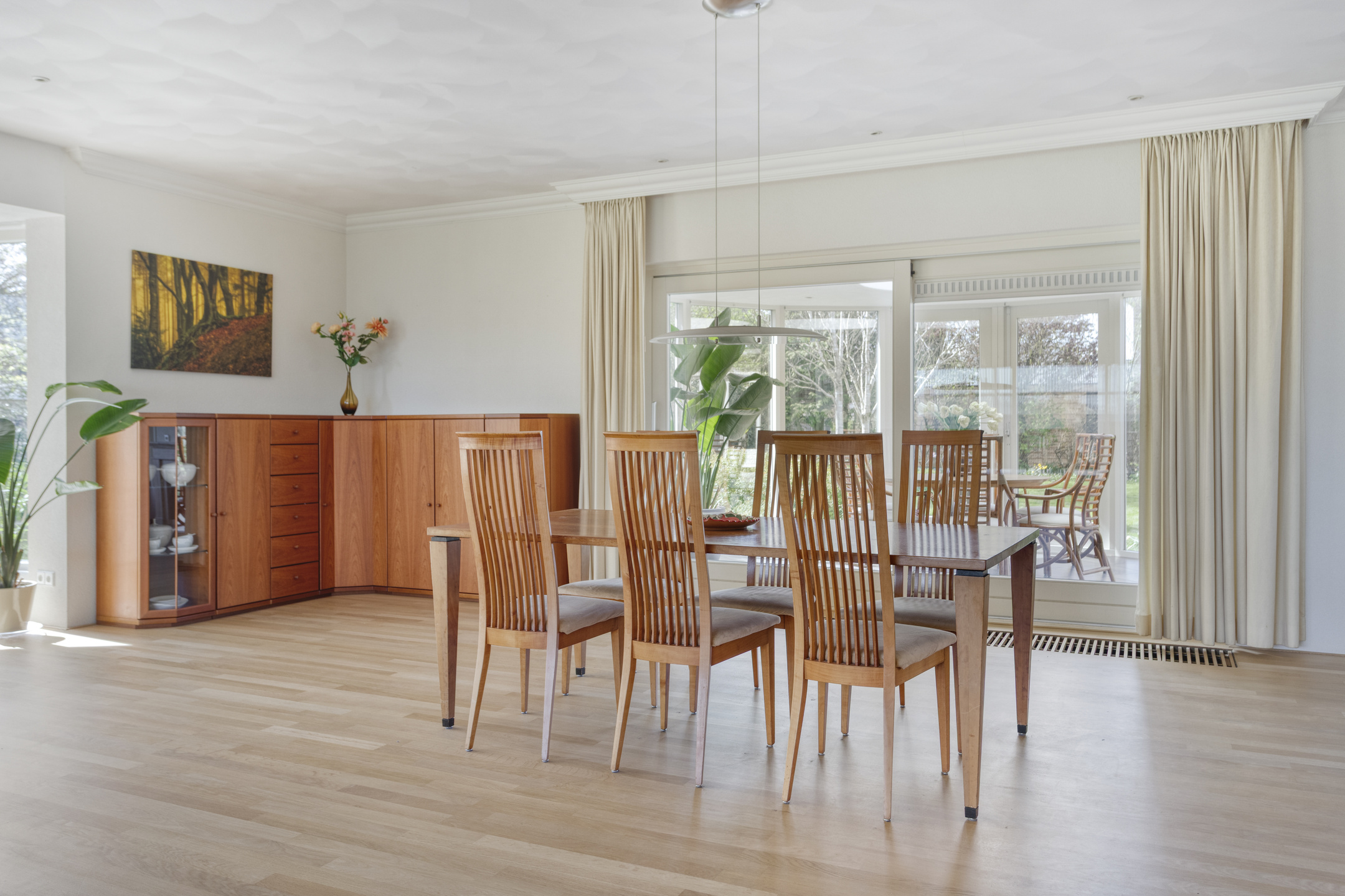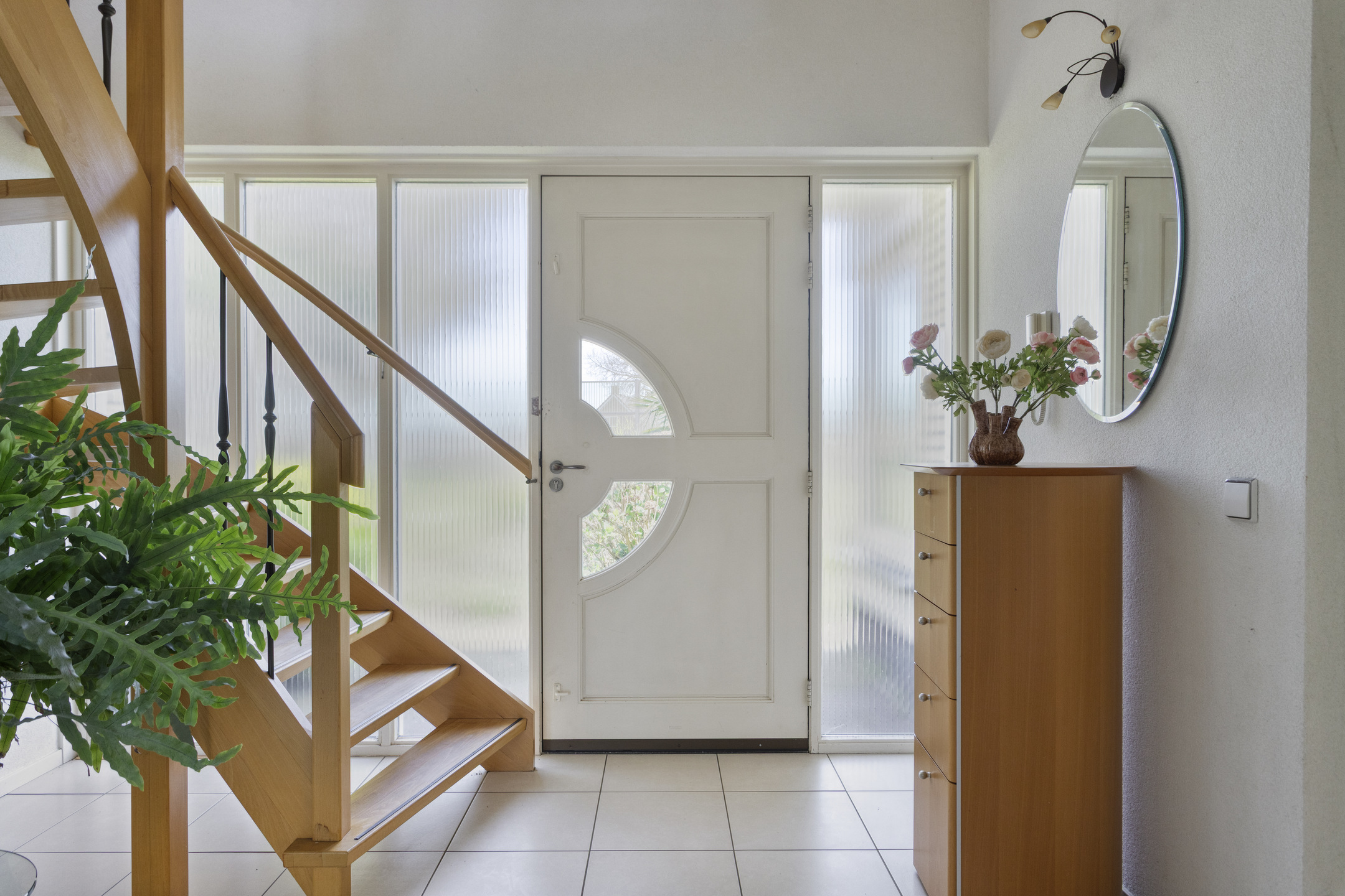 Via de entree kom je in een ruime hal met garderobe, toiletruimte en trapopgang. Vanuit hier betreed je de royale woonkamer, het hart van de woning. De speelse vormgeving, met serre en erker, zorgt voor een prettige dynamiek en meerdere zitplekken. Grote raampartijen brengen het buitenleven naar binnen en zorgen voor een aangename lichtinval gedurende de hele dag.