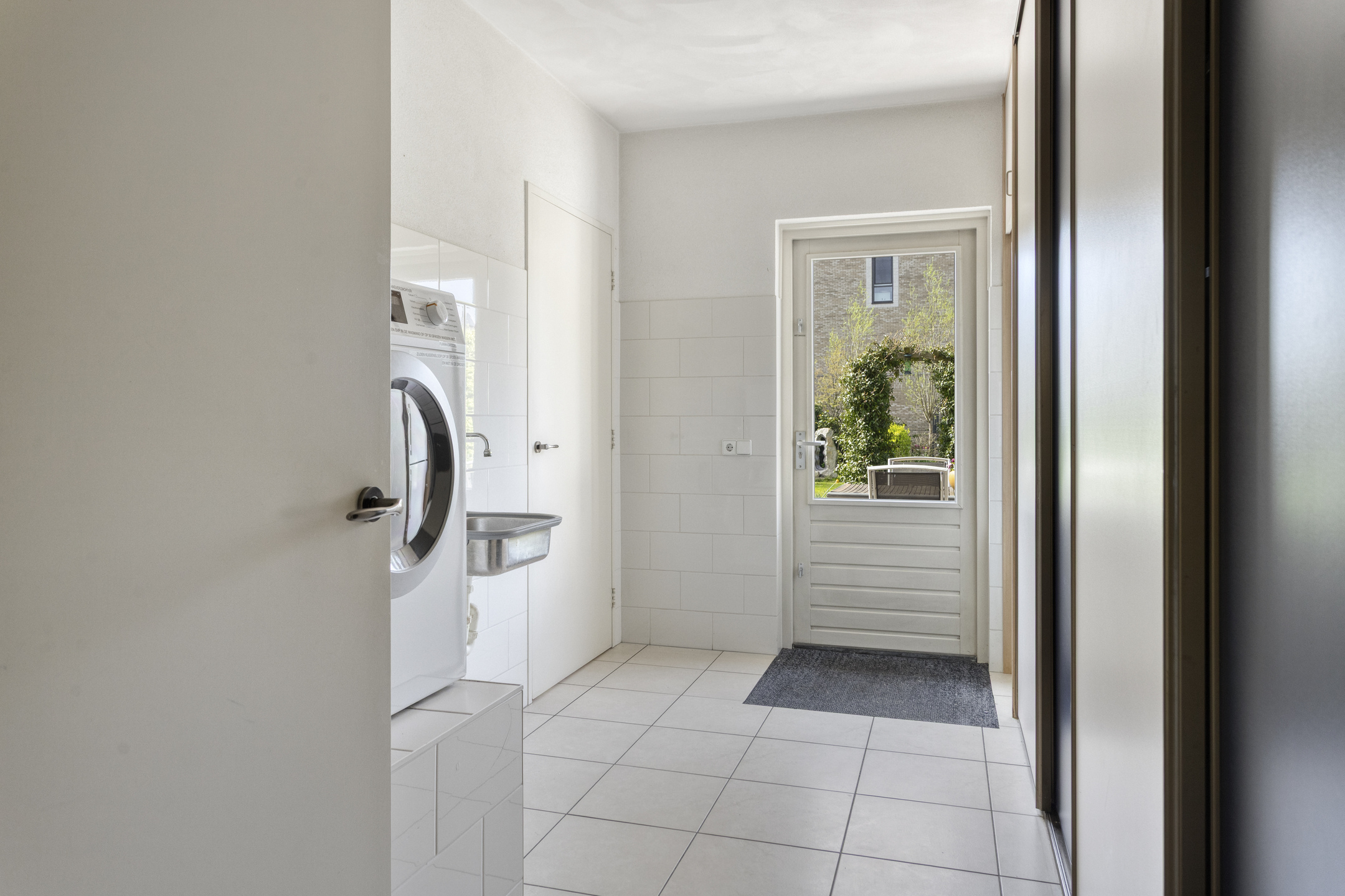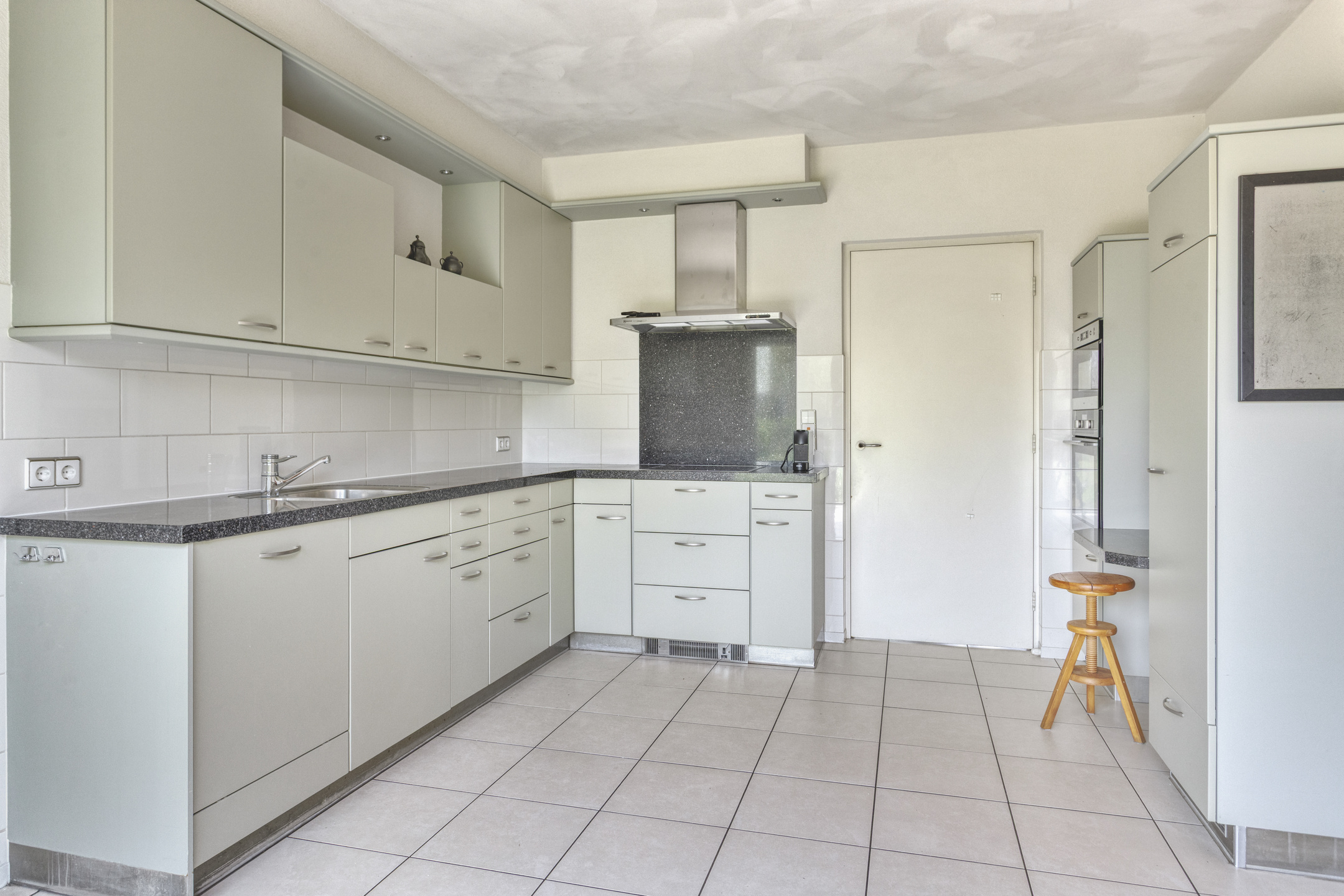 De keuken is centraal in de woning gelegen en praktisch ingericht, met directe verbinding naar zowel de woonkamer als de bijkeuken. Deze bijkeuken biedt volop ruimte voor voorraad, wasvoorzieningen en extra bergruimte.