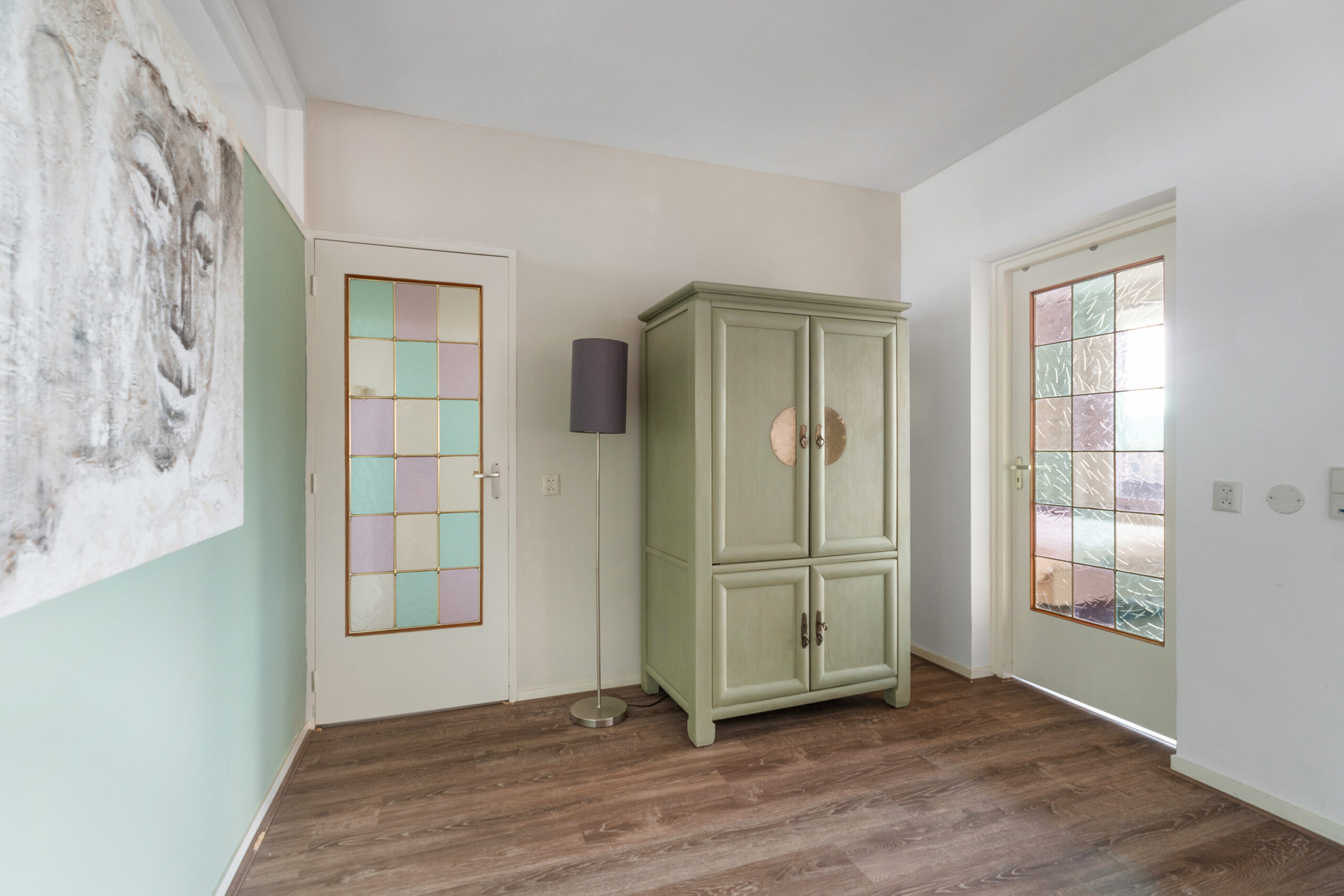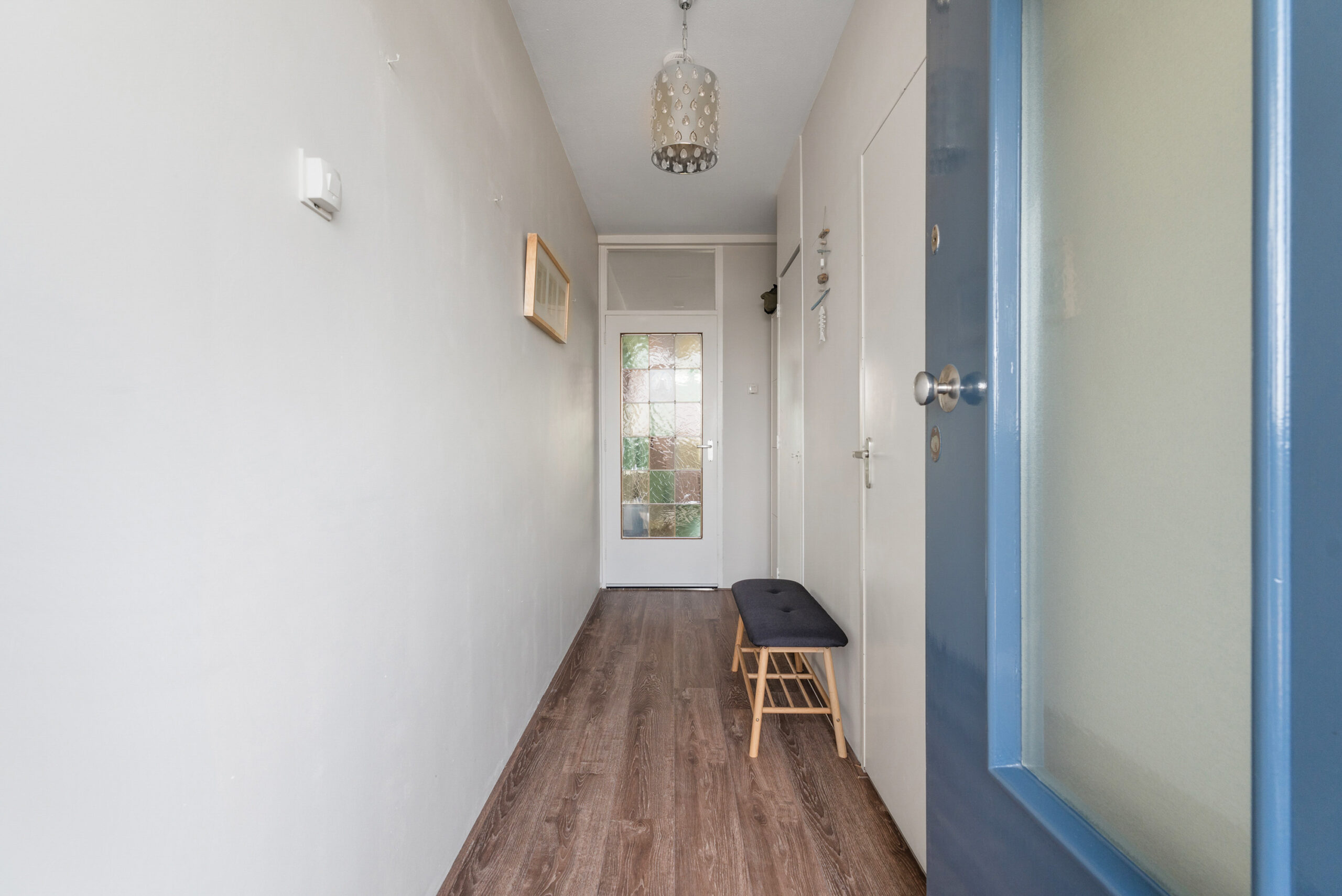 Via de centrale entree bereik je het appartement met de lift of trap. Bij binnenkomst stap je direct in een ruime entree met toegang tot zowel extra opbergruimte als de woonkamer. In de hal is ook een elektrische boiler aanwezig.