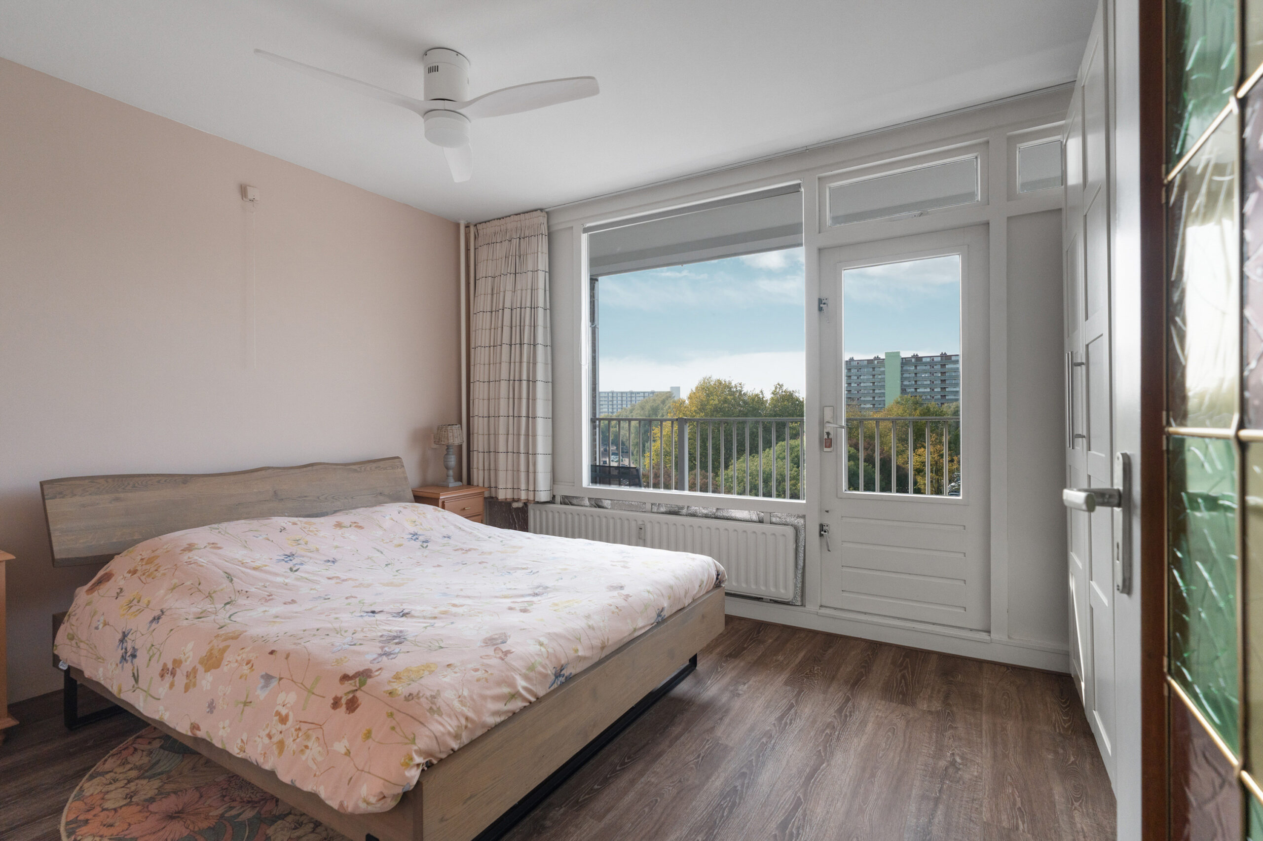 De woonkamer is heerlijk licht en biedt een prettig uitzicht. Vanuit hier is er toegang tot de keuken en het balkon. De keuken is voorzien van een koel-vriescombinatie, inductie en een oven. Ook is er een aparte vaatwasser aanwezig. Aangrenzend aan de ruime woonkamer bevindt zich een hal die toegang geeft tot een van de slaapkamers, welke heerlijk ruim is. Deze slaapkamer beschikt over ruime (inbouw)kasten. Het balkon, welke ook te bereiken is via de slaapkamer, is gelegen op het westen waardoor er een groot deel van de dag zon is. Op het balkon is er ook een elektrische zonnescherm aanwezig. De badkamer met douche, wastafel en wasmachineaansluiting is zowel via de hal als de slaapkamer achter te bereiken. Via een tweede hal bereik je het separate toilet. Aan de voorzijde van de woning is de tweede, grootste slaapkamer te vinden. Oorspronkelijk beschikte het appartement over drie slaapkamers. Eén van deze slaapkamers is samengevoegd, waardoor er nu twee slaapkamers aanwezig zijn. De oorspronkelijke indeling is echter eenvoudig te herstellen, aangezien de deuropening behouden is.