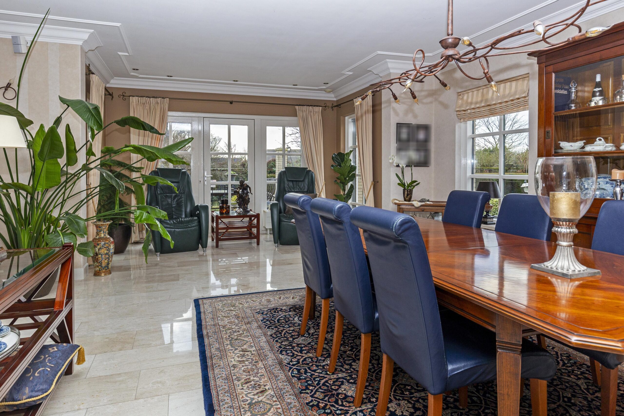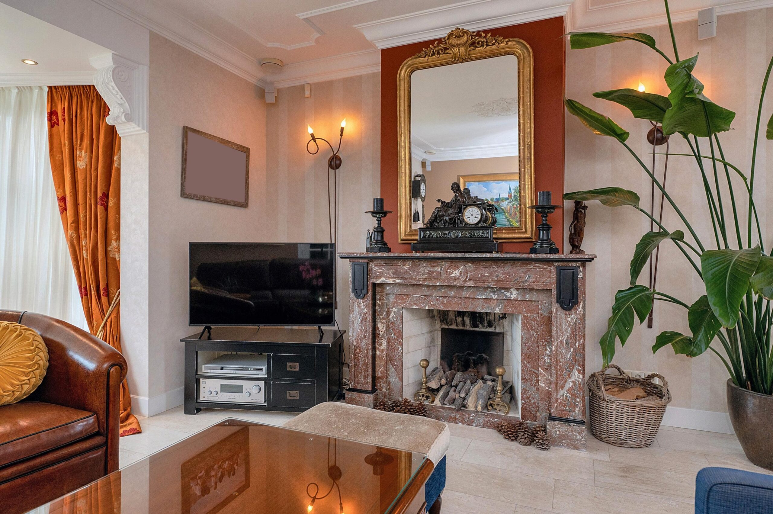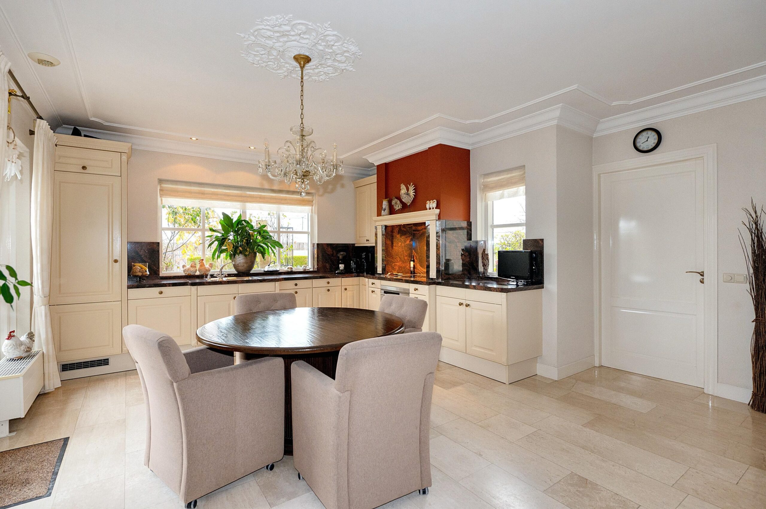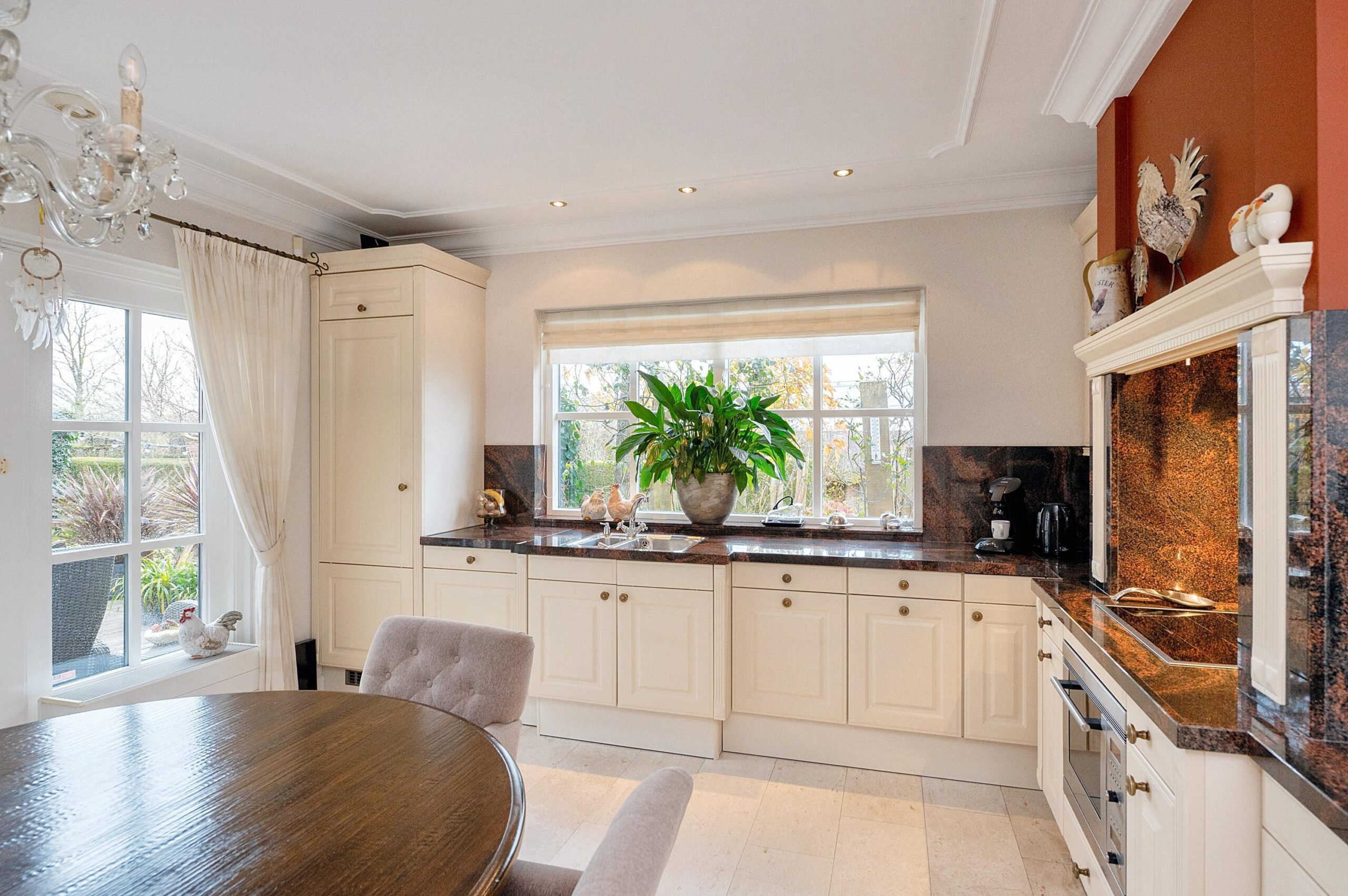 Deze vrijstaande woning in het Westland combineert de charme van een klassiek landhuis met modern gemak. De statige entree, met een marmeren vloer en indrukwekkende hoogte, zet meteen de toon. Via dubbele openslaande deuren betreed je de royale woonkamer, waar ronde lijnen, sierlijke plafondornamenten en twee prachtige erkers het landelijke karakter versterken. Het pronkstuk is de marmeren schouw, afkomstig uit een Frans kasteel, die de open haard omringt. De living biedt volop indelingsmogelijkheden en geïntegreerde technologie zoals geluidsboxen, centrale lichtbediening en vloerverwarming. De open leefkeuken sluit hier perfect op aan. Veel bergruimte, een koelkast met vriesgedeelte, een vaatwasser en een marmeren schouw boven de elektrische kookplaat zorgen voor een keuken die zowel stijlvol als praktisch is.