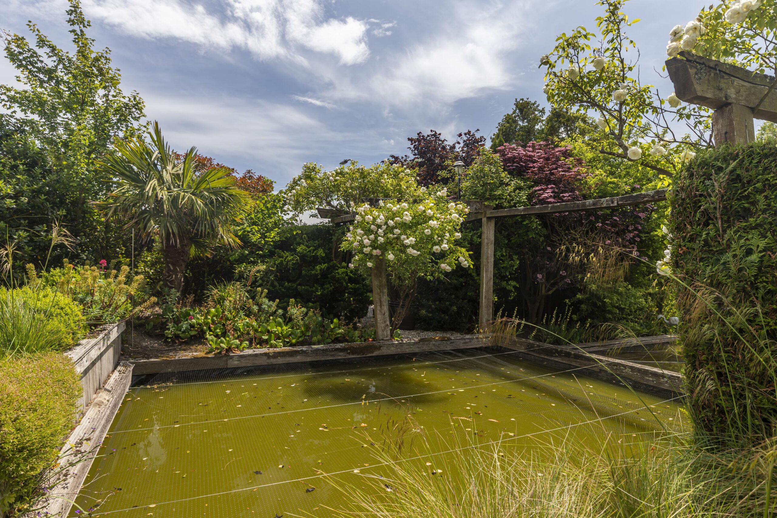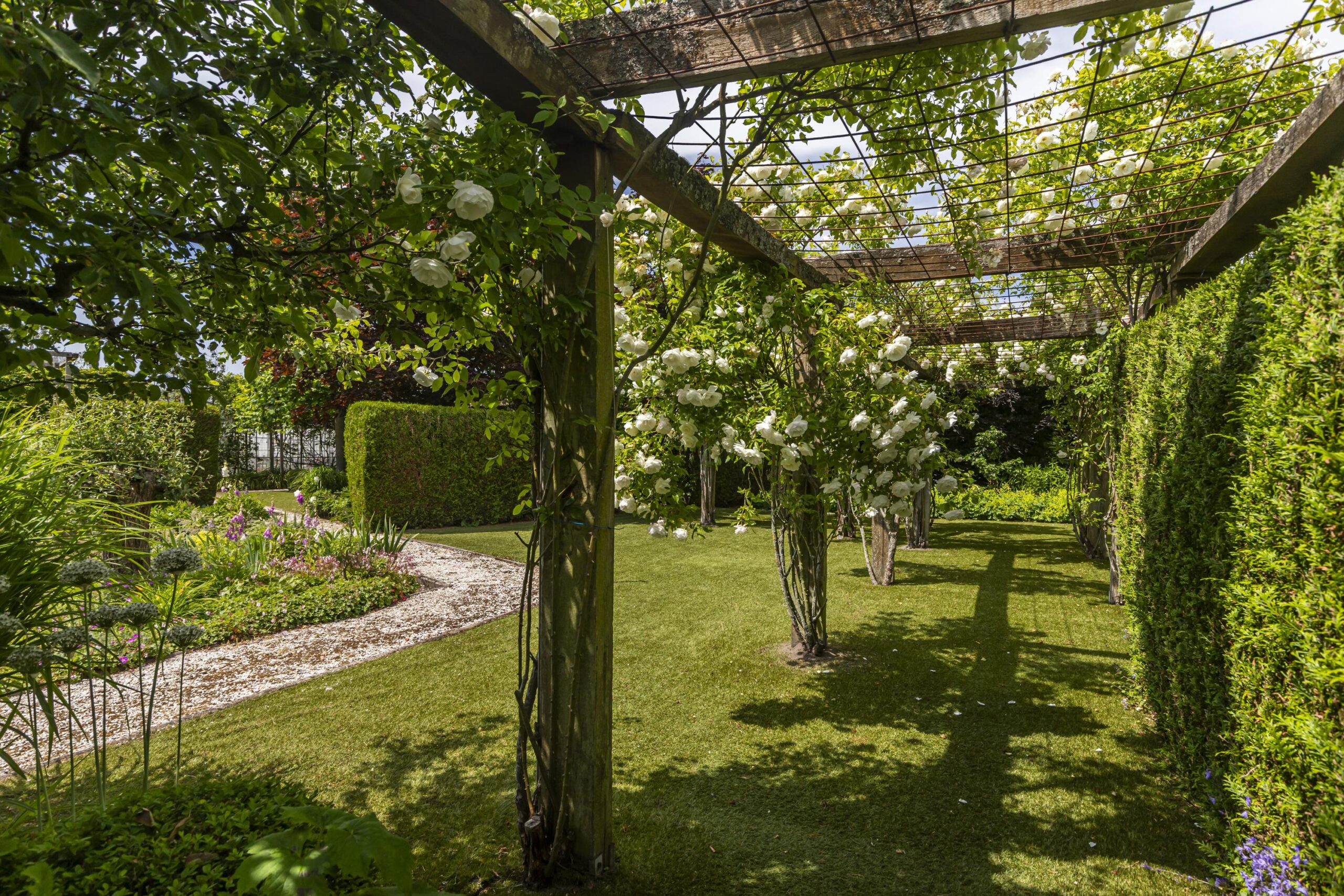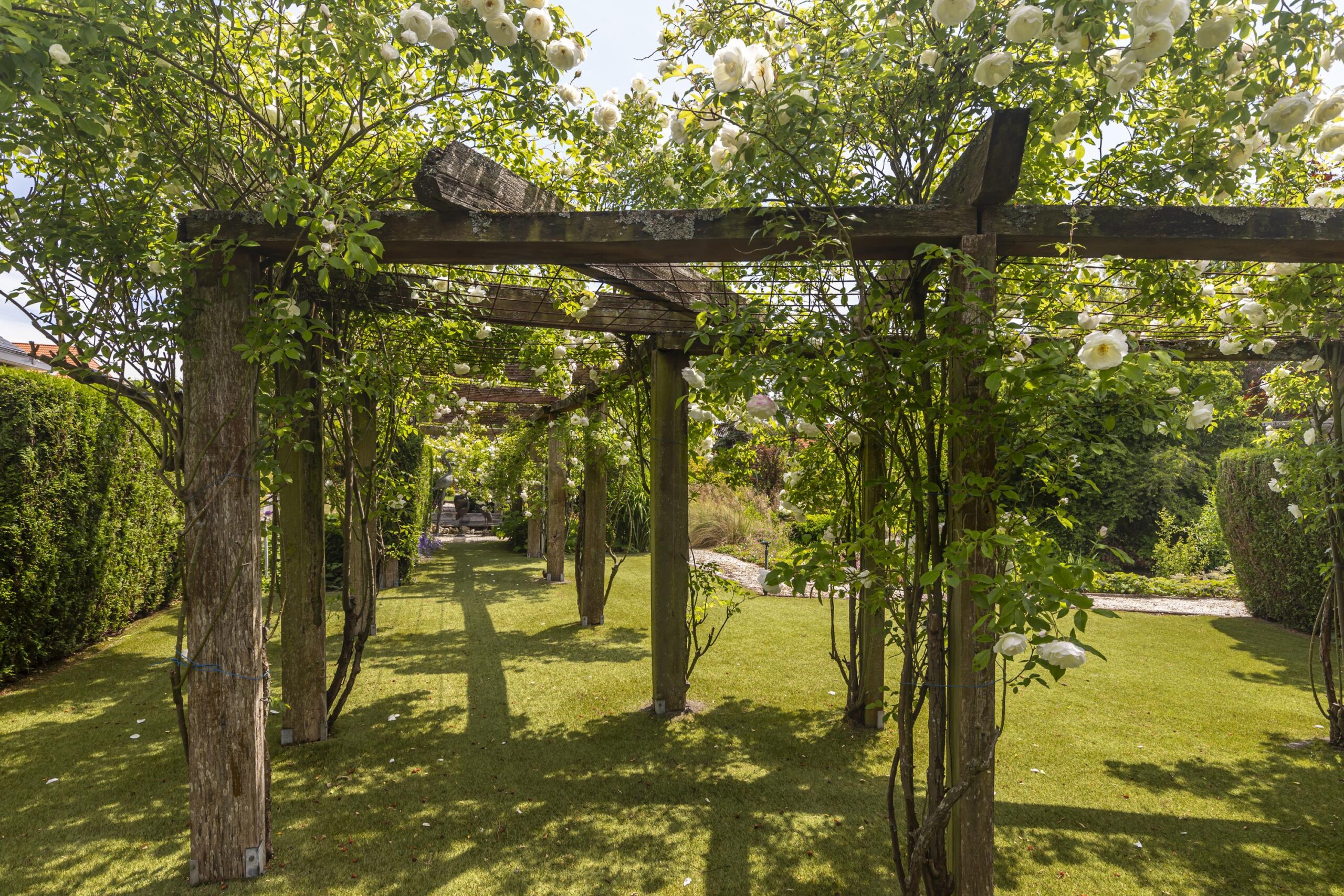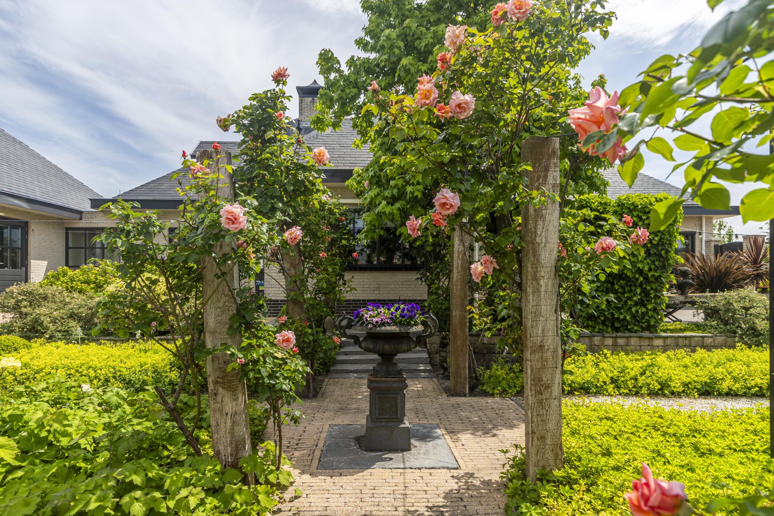 Op een royaal perceel van circa 1885 m² strekt zich een droomtuin uit, die met zorg en visie is ontworpen. Overal waar je kijkt, ontdek je iets nieuws: van de drie grote vijvers in verschillende hoogten tot rijen pergola's die een sprookjesachtige doorgang vormen met blauwe regen en geurende klimrozen. Verborgen plekjes en doorkijkjes onthullen steeds weer een volgende verrassing. Denk aan een ommuurd speelveld, een eigen boshut die de droom is van ieder kind, en een 60-meter lange ren voor kippen of andere dieren.