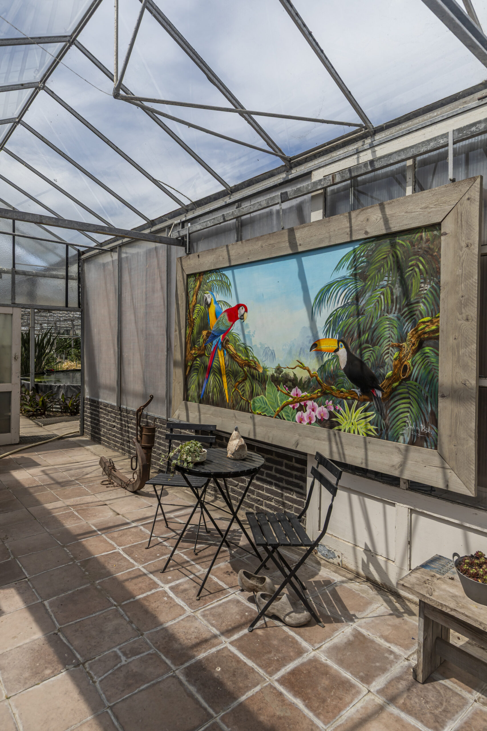 Grenzend aan de tuin ligt een indrukwekkende kas van 1.000 m², vol mogelijkheden. Of je nu droomt van een eigen moestuin, of een creatieve hobbyruimte. Momenteel wordt de kas deels gebruikt als hobbykas, waar bloemen, groenten en fruit goed gedijen. Verder is er een vijver met koikarpers, een waterput, een keukenblok en toilet. Daarnaast is er een biljartruimte, compleet met een authentieke houtkachel en karakteristieke vloertegels afkomstig uit een oude kerk.