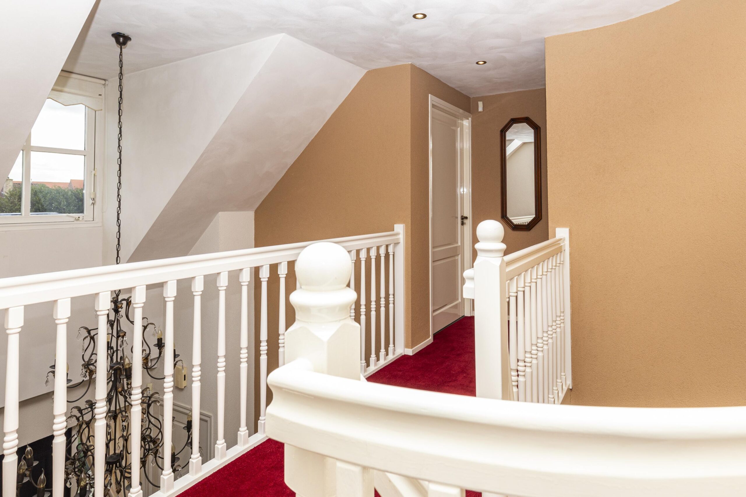 Via de elegante trap in de hal bereiken we de eerste etage. Hier bevinden zich drie ruime slaapkamers, een tweede badkamer met douchecabine en dubbele wastafel, en een apart toilet. Een van de slaapkamers heeft een loggia met een fantastisch uitzicht over de Westlandse kassen. Daarnaast is er een extra werk- of hobbyruimte met ruimte voor de technische installaties.