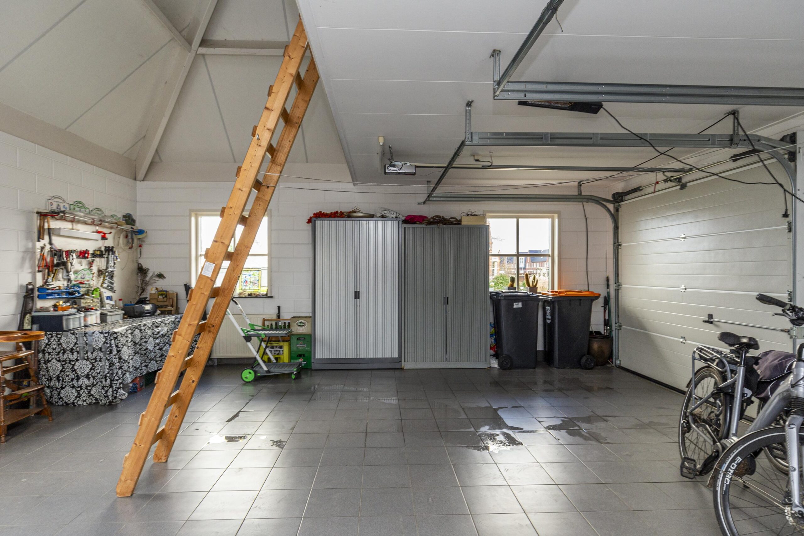 De hal naast de keuken is voorzien van een vaste kastenwand en aansluitpunten voor de wasmachine en droger. Via deze hal komen we in de dubbele garage, een veelzijdige ruimte met een vliering, een keukenblok, werkbank en verwarming. De perfecte plek voor hobby’s, het stallen van voertuigen of extra opslag.