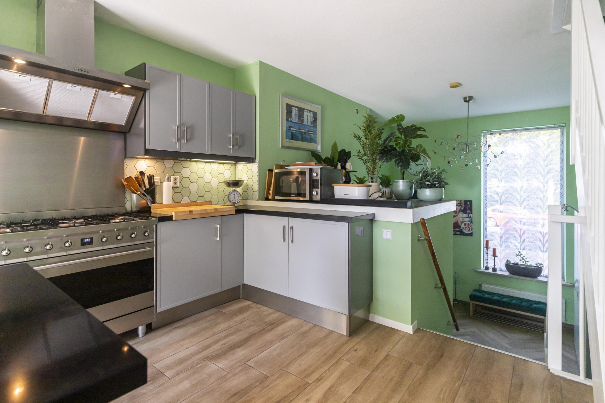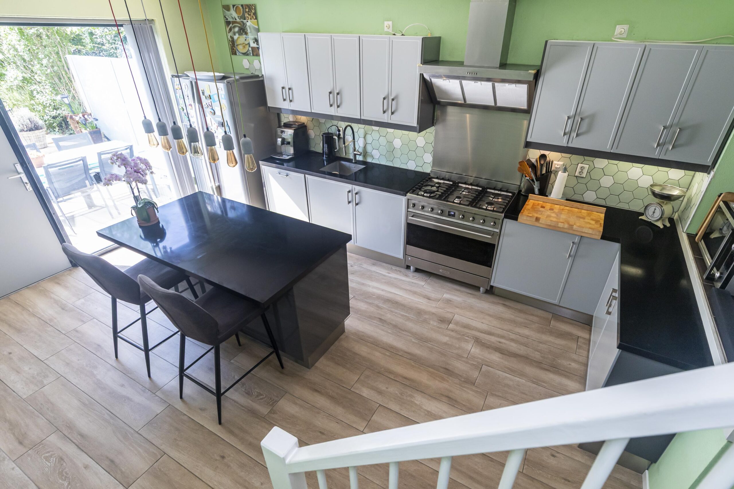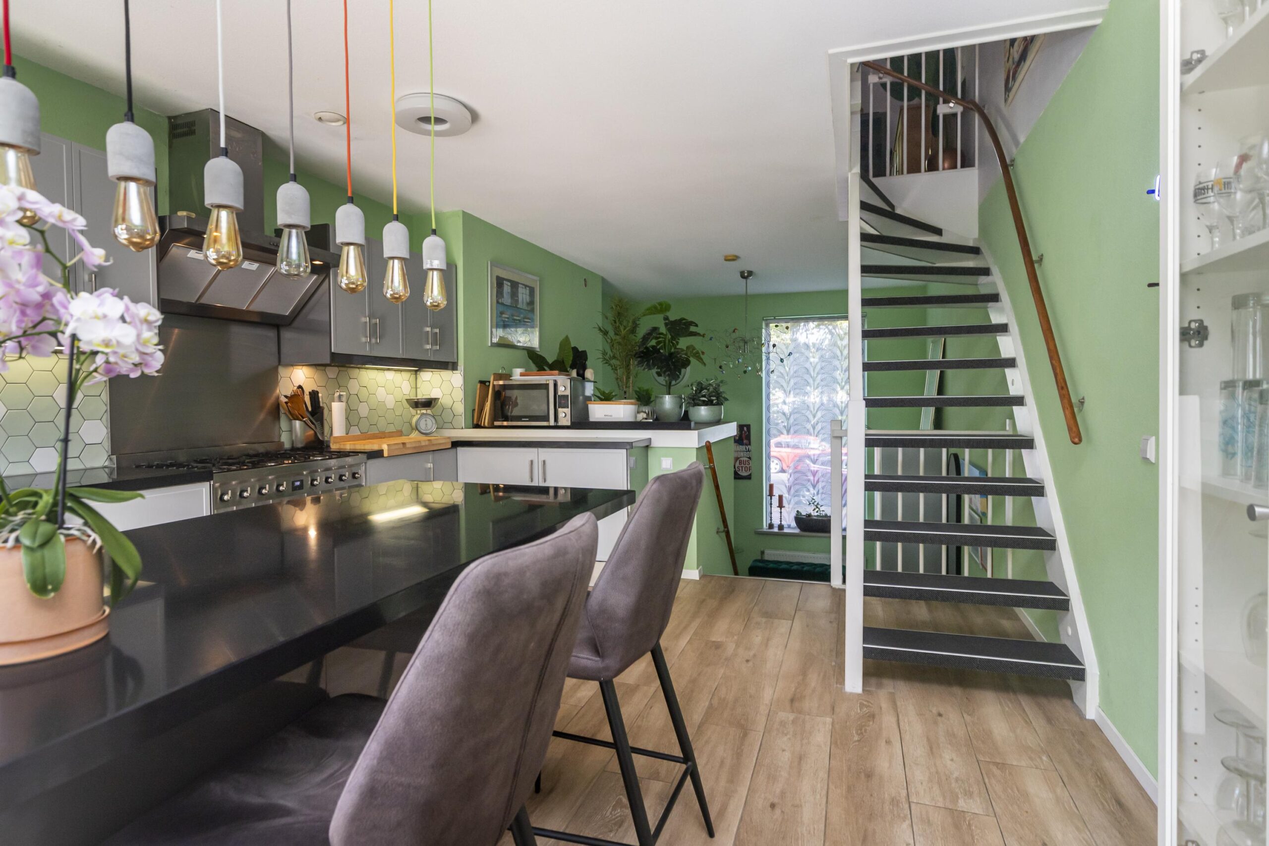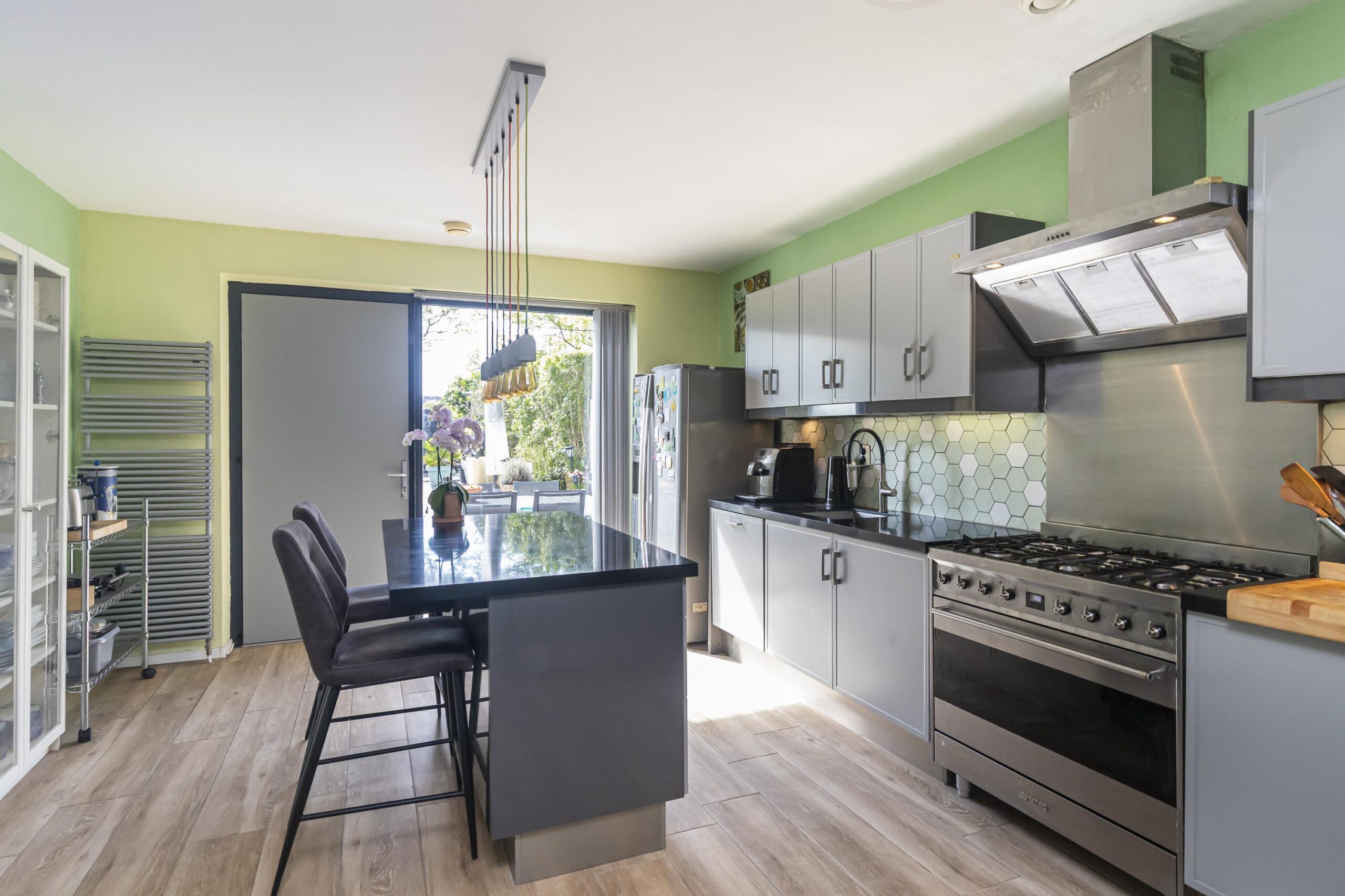 Via de trap naar boven bereik je de ruime woonkeuken. Deze lichte en sfeervolle ruimte is uitgerust met een 6-pits gasfornuis, koelkast, oven en vaatwasser, zodat je hier met plezier de lekkerste maaltijden bereidt. Vanuit de keuken stap je direct de achtertuin in, die op het zuidwesten ligt. Hier geniet je van de zonnestralen en heb je een fijne plek om even tot rust te komen.