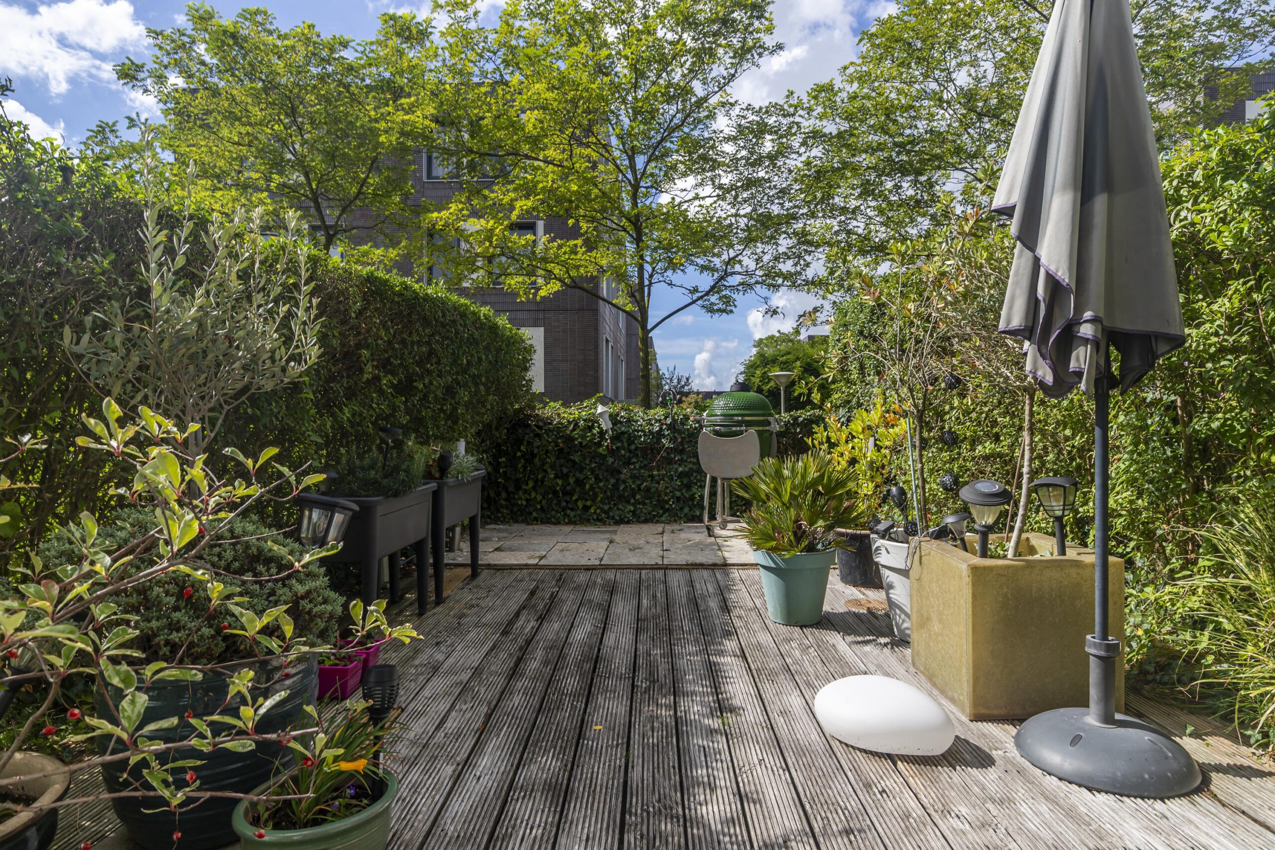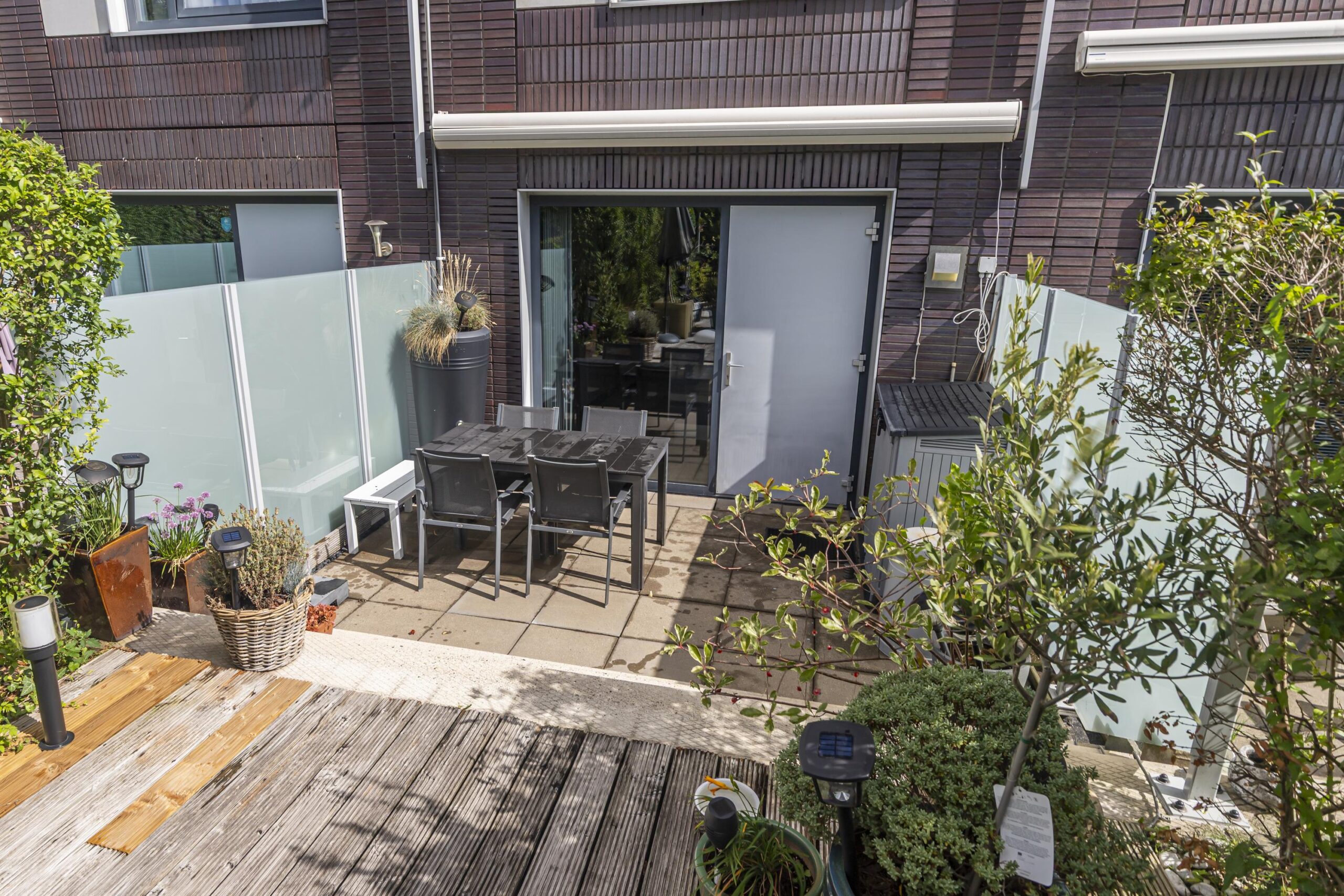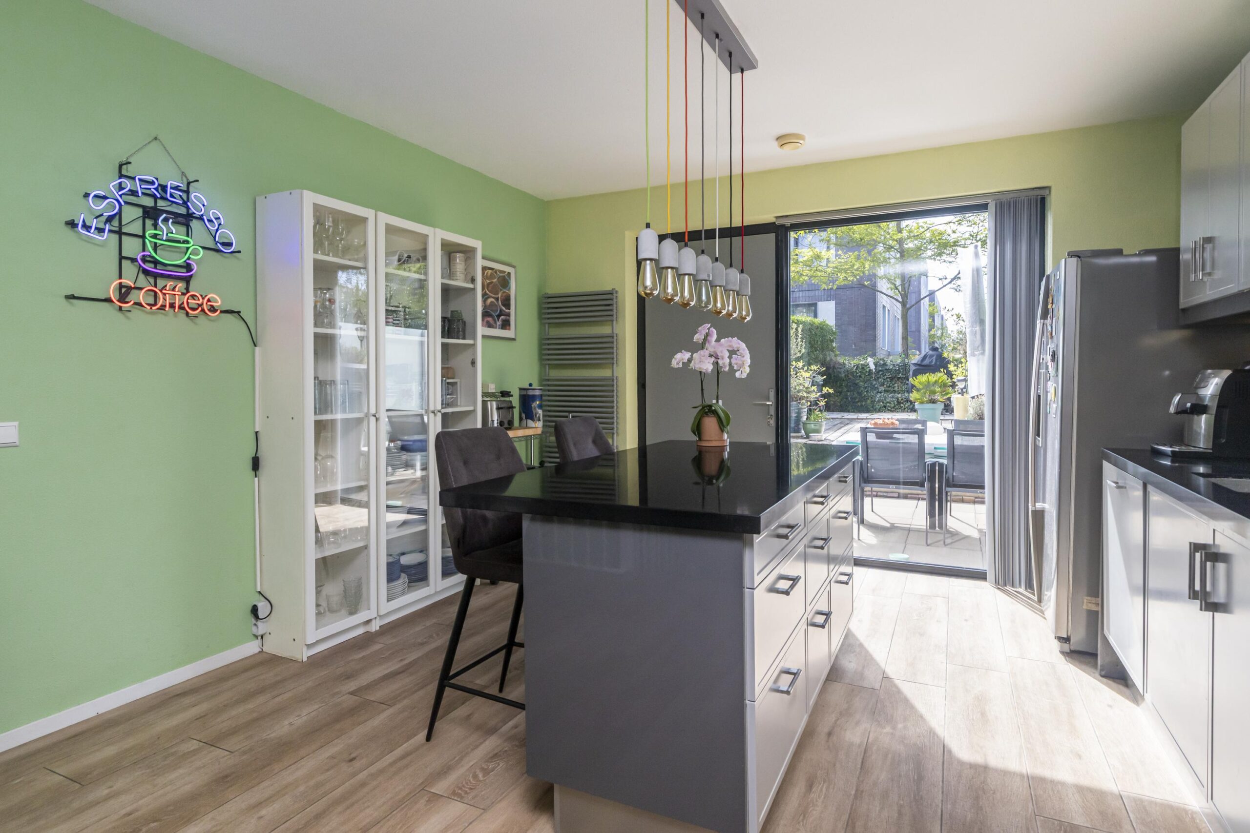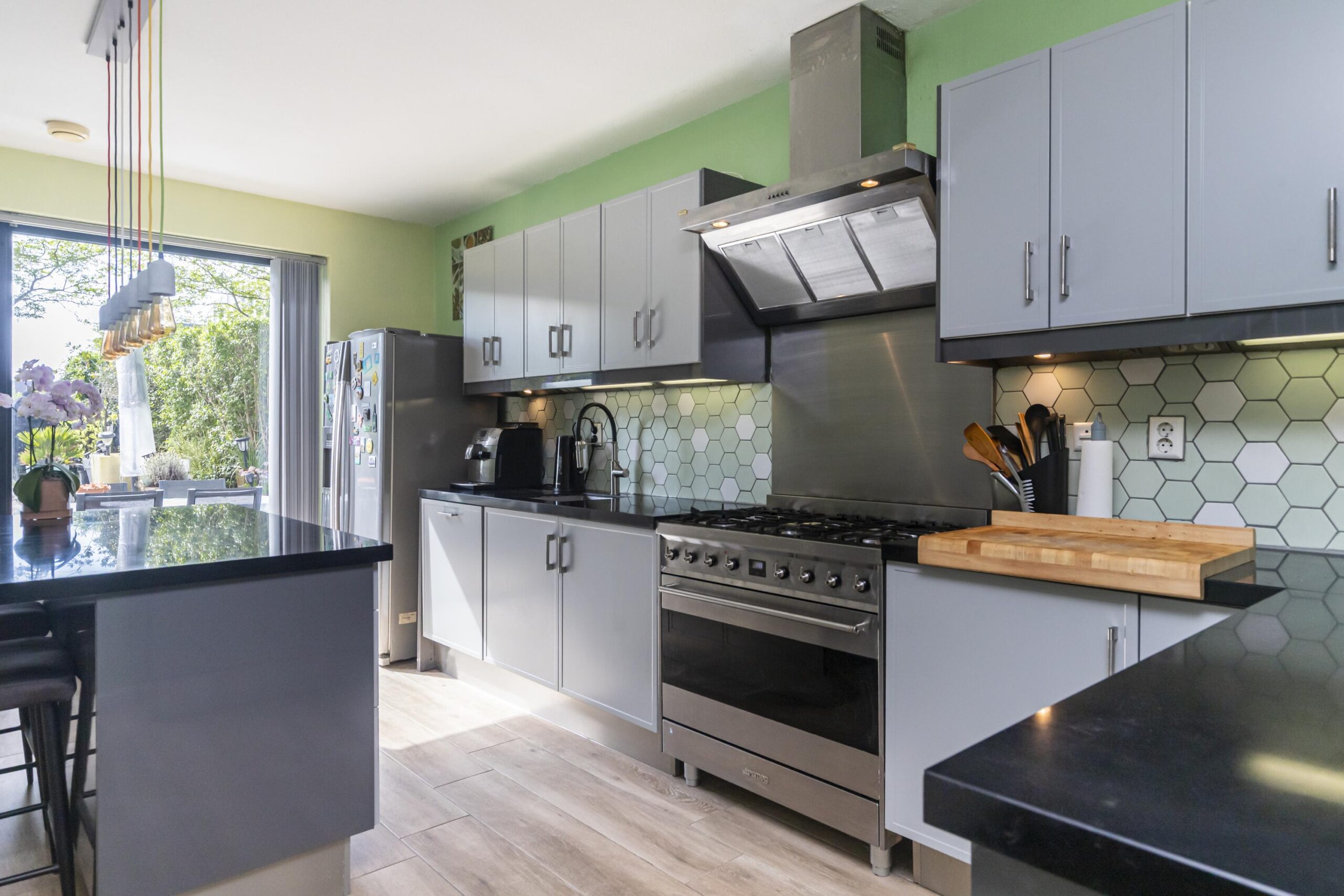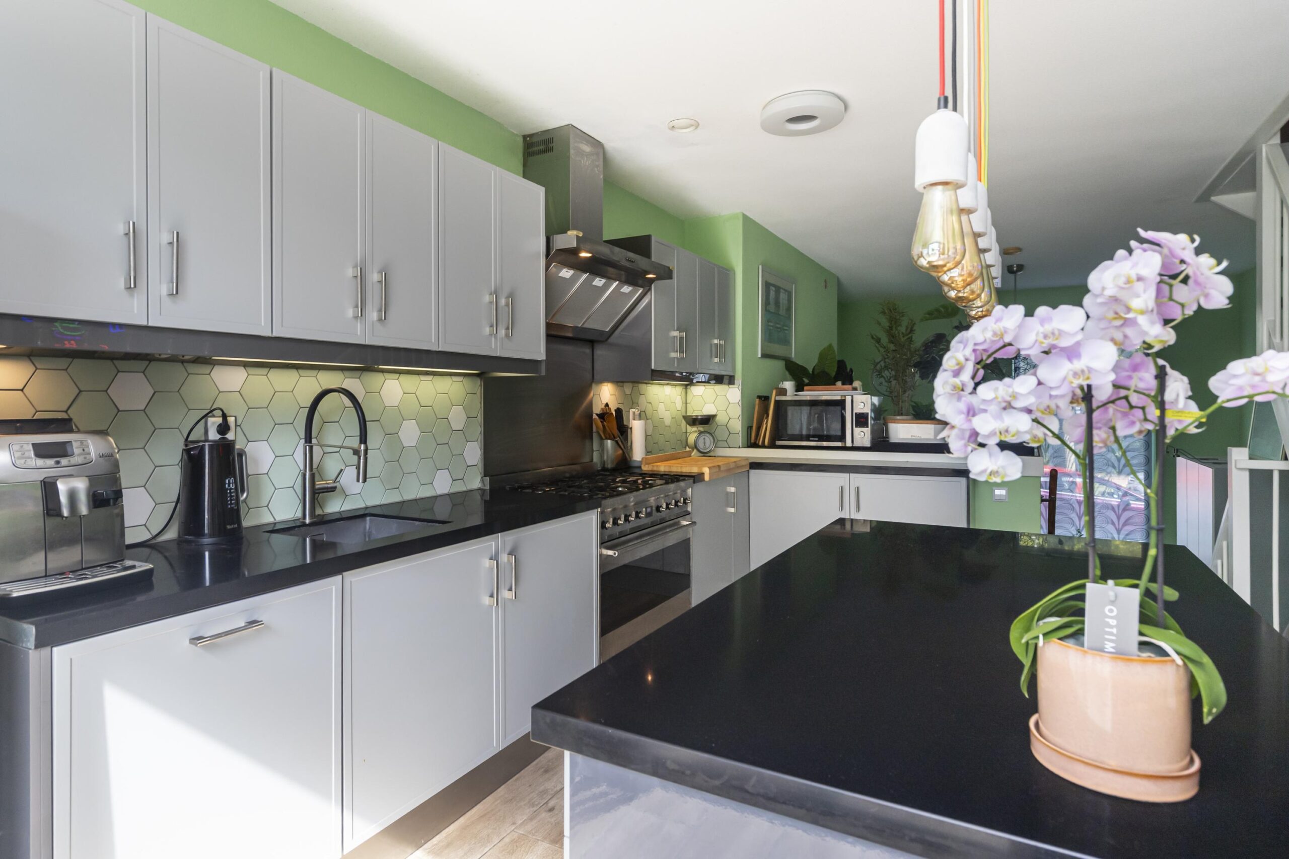 Via de trap naar boven bereik je de ruime woonkeuken. Deze lichte en sfeervolle ruimte is uitgerust met een 6-pits gasfornuis, koelkast, oven en vaatwasser, zodat je hier met plezier de lekkerste maaltijden bereidt. Vanuit de keuken stap je direct de achtertuin in, die op het zuidwesten ligt. Hier geniet je van de zonnestralen en heb je een fijne plek om even tot rust te komen.