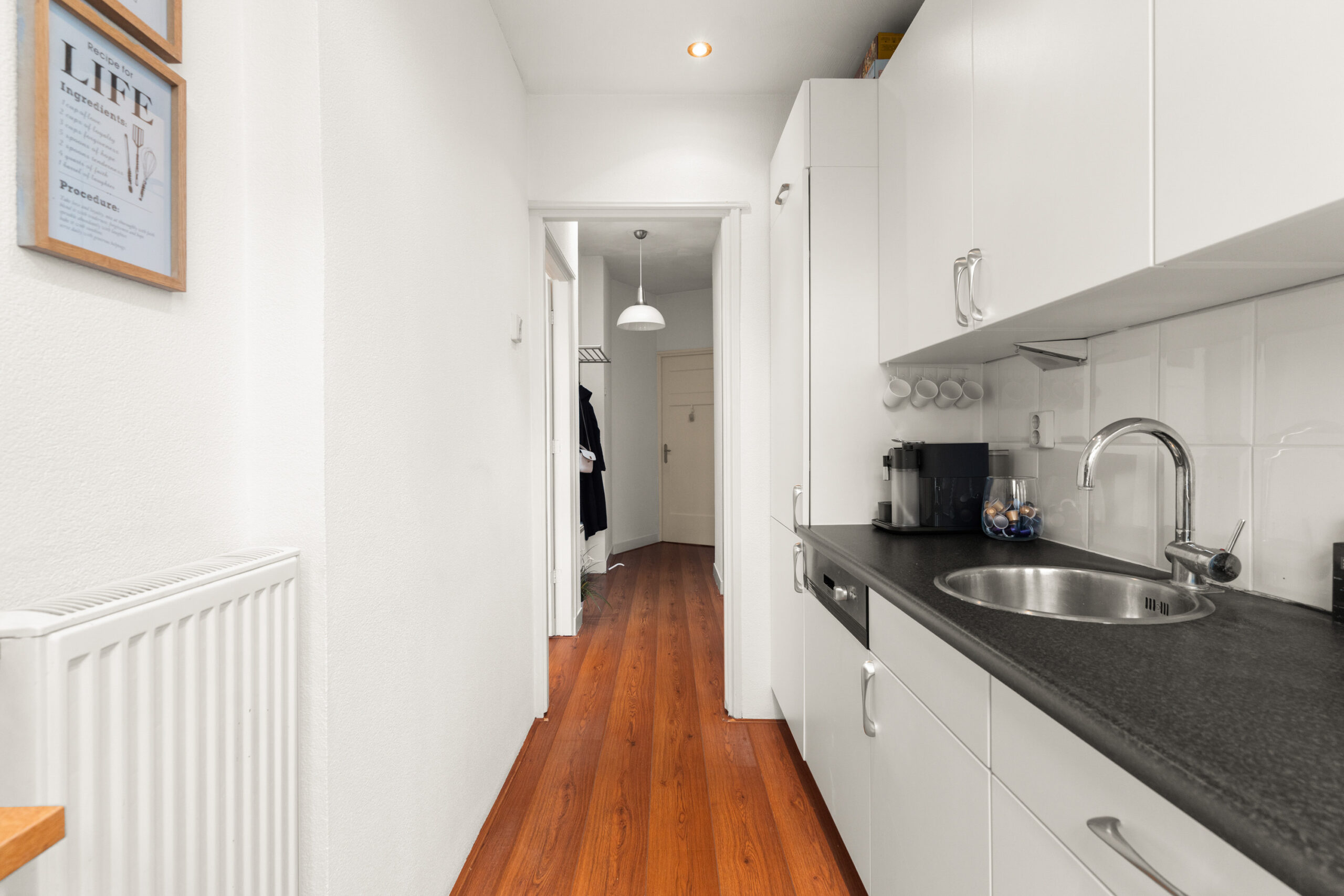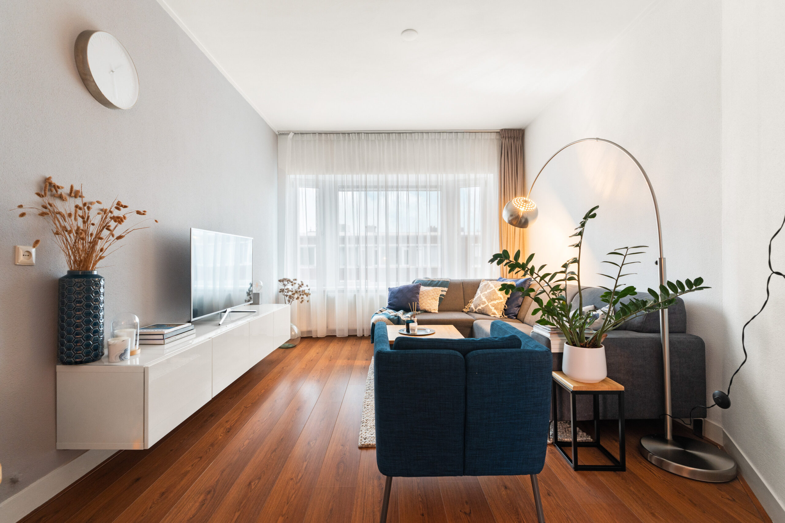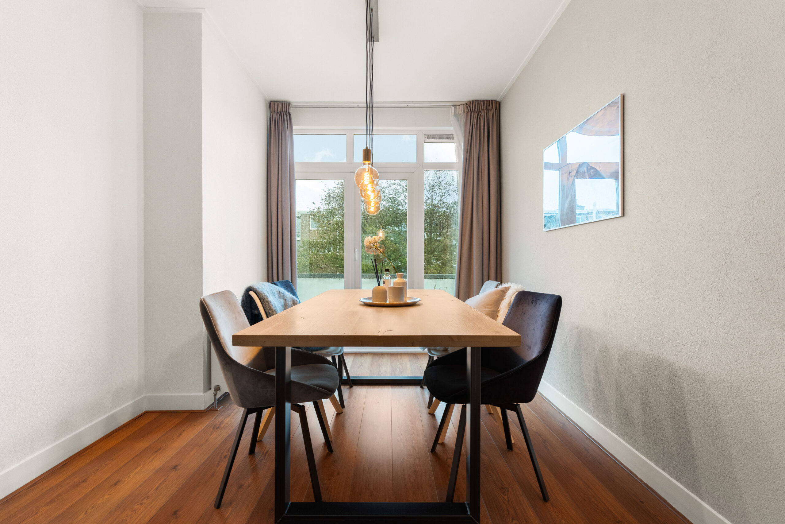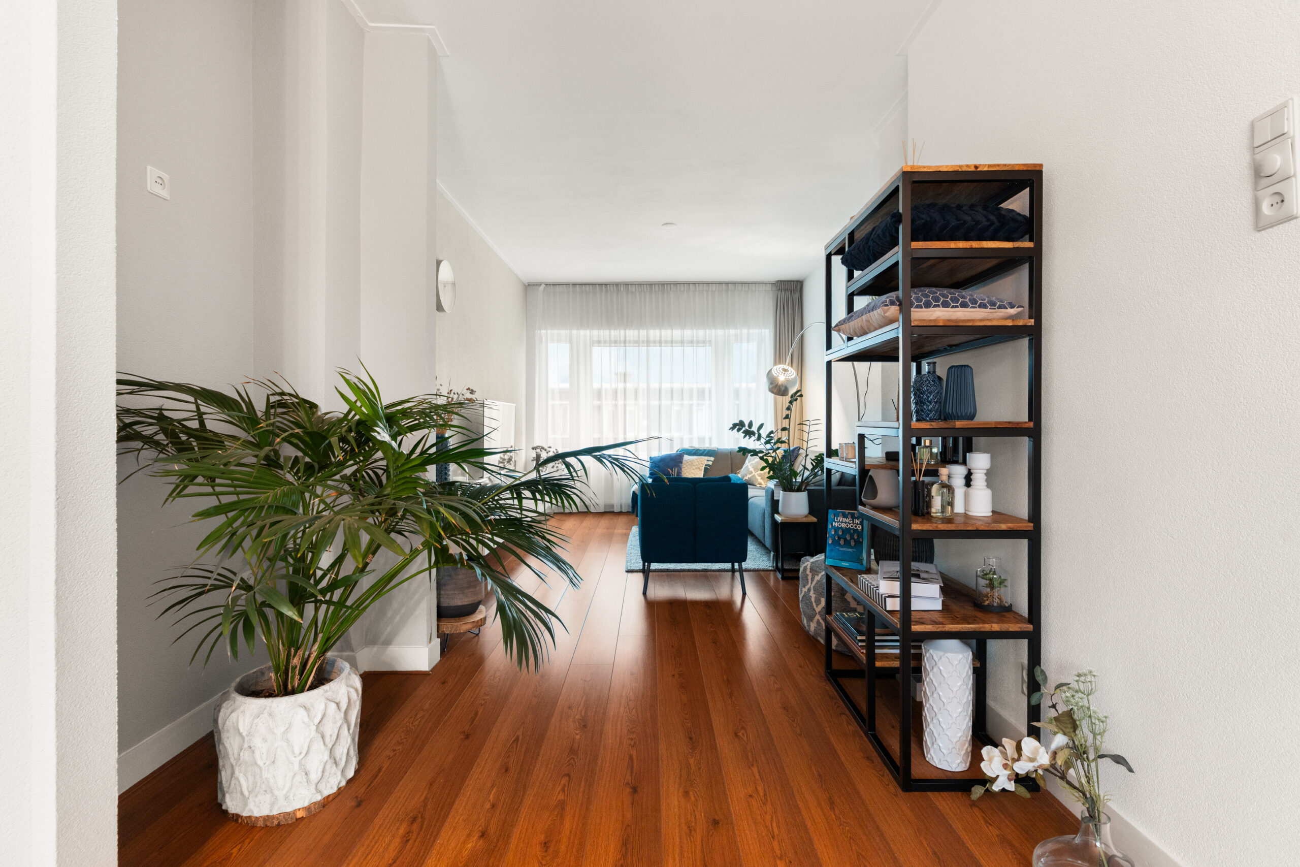 Via het portiek neem je de trap en bereik je de woning op de tweede verdieping. Bij binnenkomst kom je in de hal met direct toegang tot de ruime woon- en eetkamer. Deze doorzonkamer strekt zich uit over de volledige lengte van de woning, waardoor er dankzij de grote raampartijen aan zowel de voor- als achterzijde een prachtige lichtinval is.