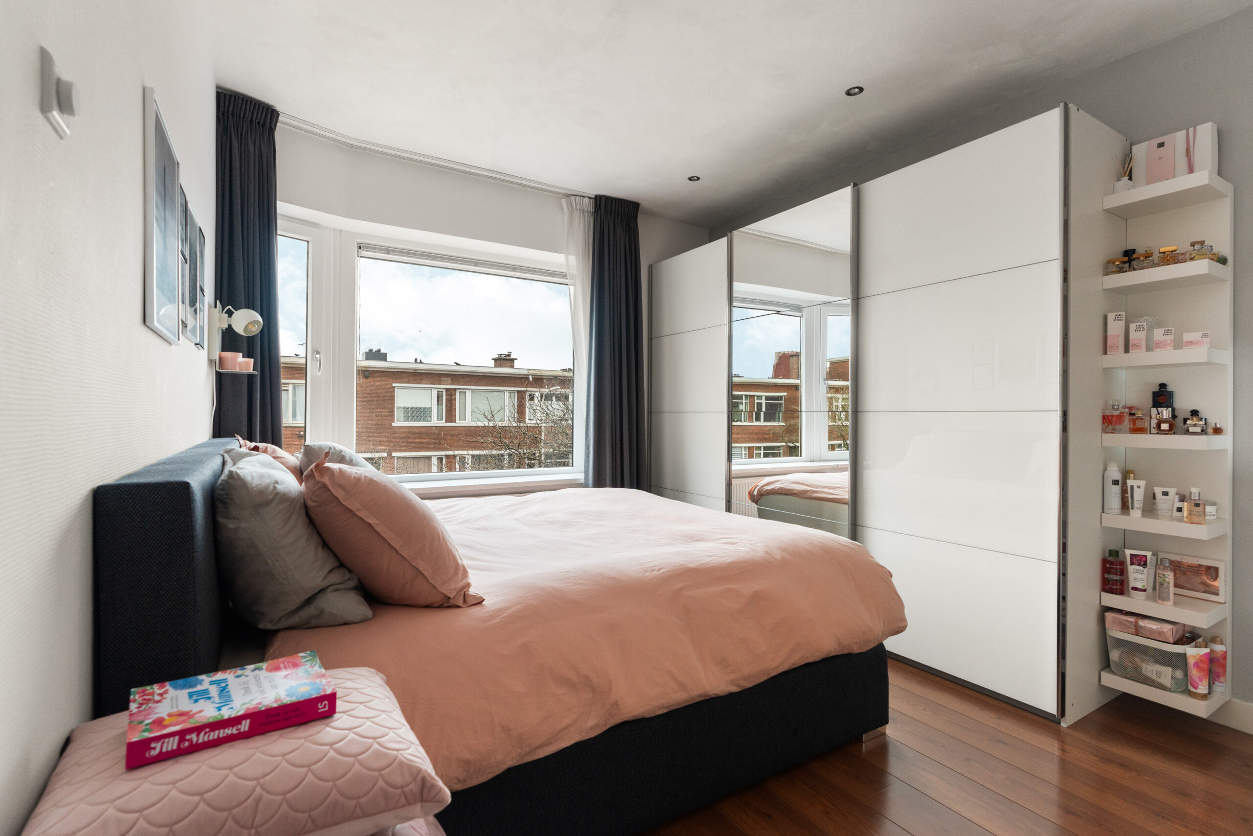 Grenzend aan de keuken ligt de eerste slaapkamer, een prettig ingedeelde ruimte van goed formaat. Zowel vanuit de woonkamer als de keuken én deze slaapkamer is er toegang tot het zonnige balkon, gelegen op het zuidoosten – een fijne plek om van de zon te genieten.