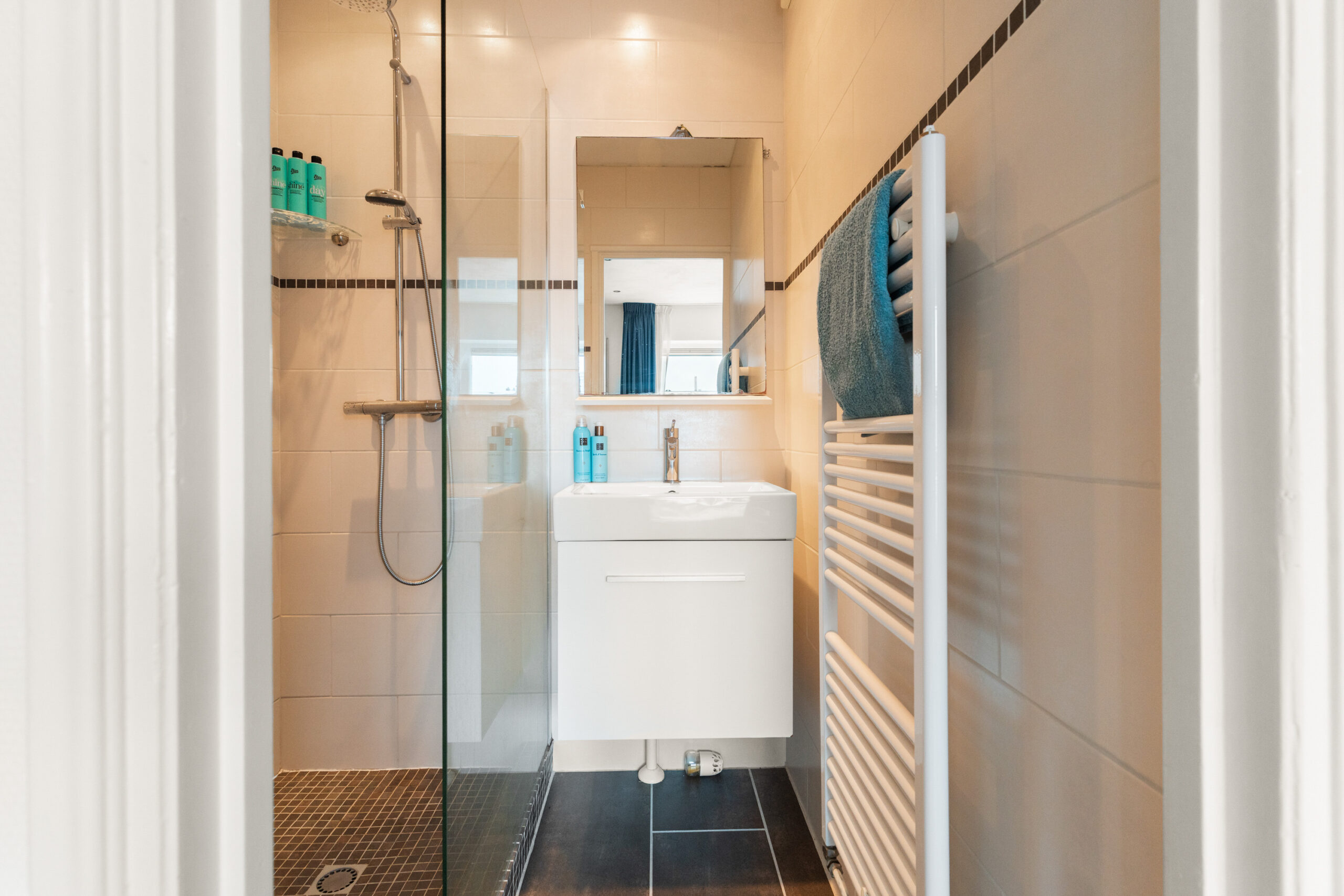 Aan de voorzijde van de woning bevindt zich de tweede, ruimste slaapkamer. Vanuit deze kamer is en-suite de badkamer bereikbaar, voorzien van een inloopdouche en wastafel(meubel). Tevens is er een separaat toilet aanwezig, bereikbaar via de hal.