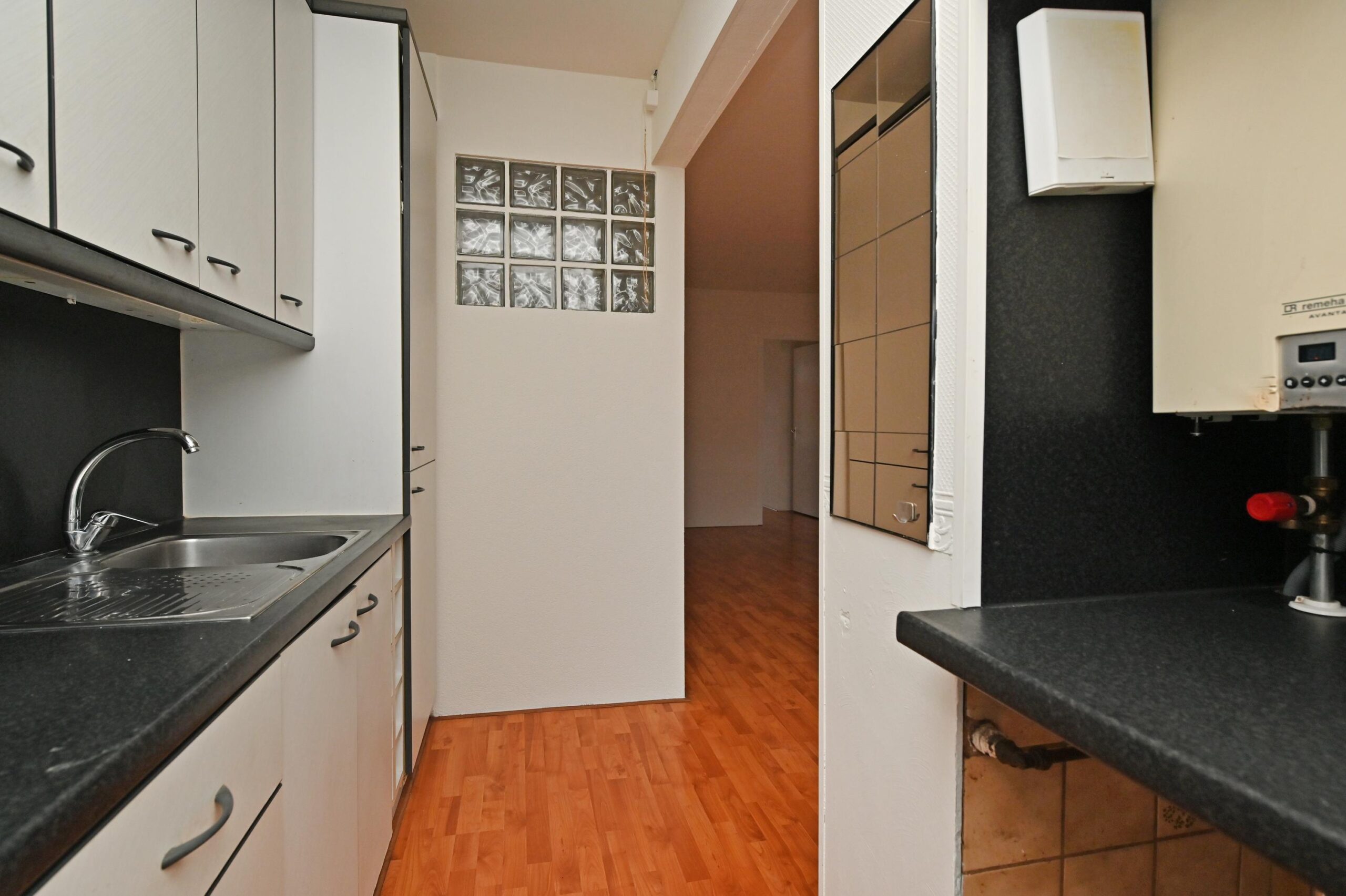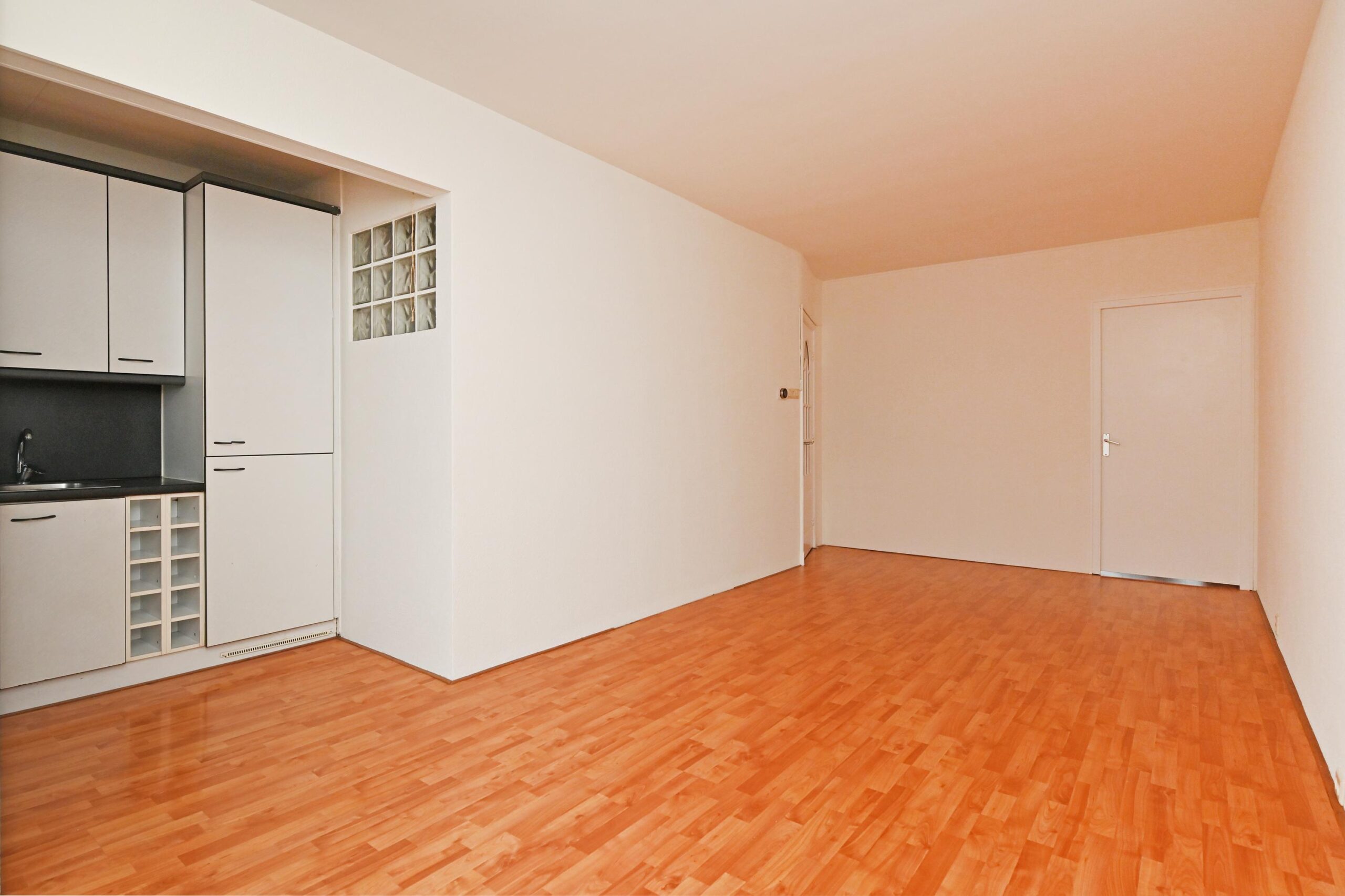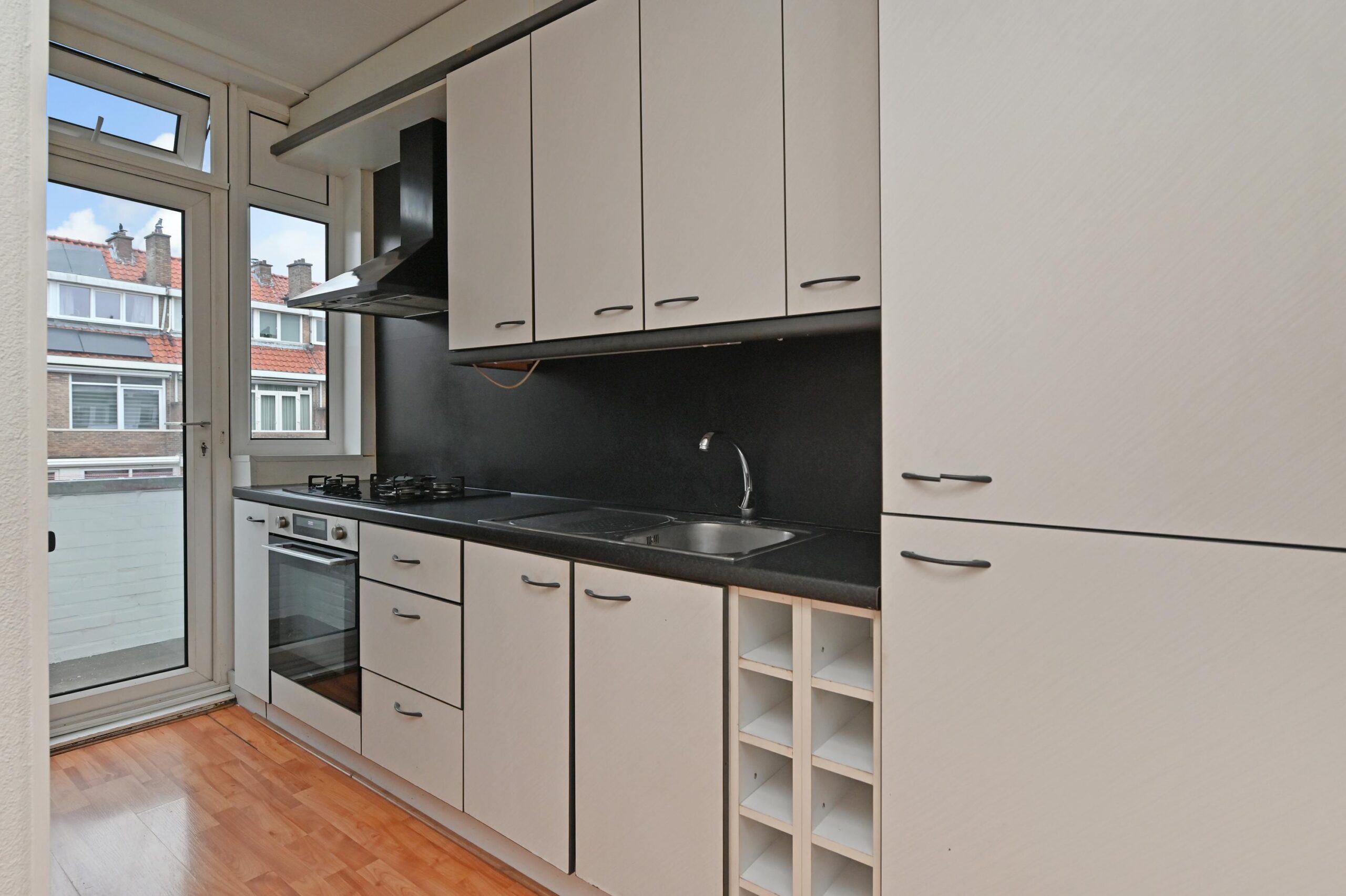 Aan de achterzijde van de woning bevindt zich de halfopen keuken, praktisch ingericht met een inbouwoven en koelkast. Er is daarnaast ruimte voor een vriezer en aansluitingen voor een wasmachine en/of vaatwasser. Vanuit de keuken is er direct toegang tot het balkon, dat op het noordoosten is gelegen en een prettige plek biedt om te ontspannen of te genieten van de buitenlucht.
