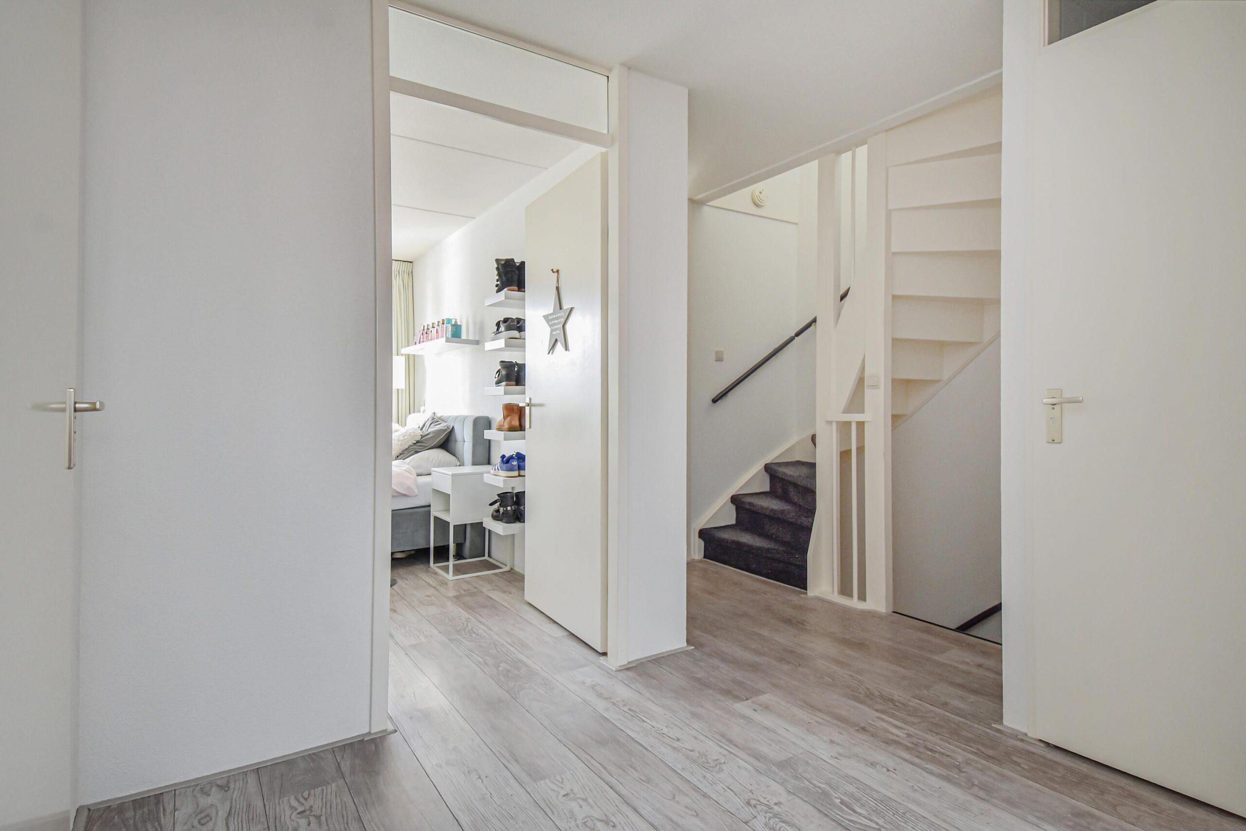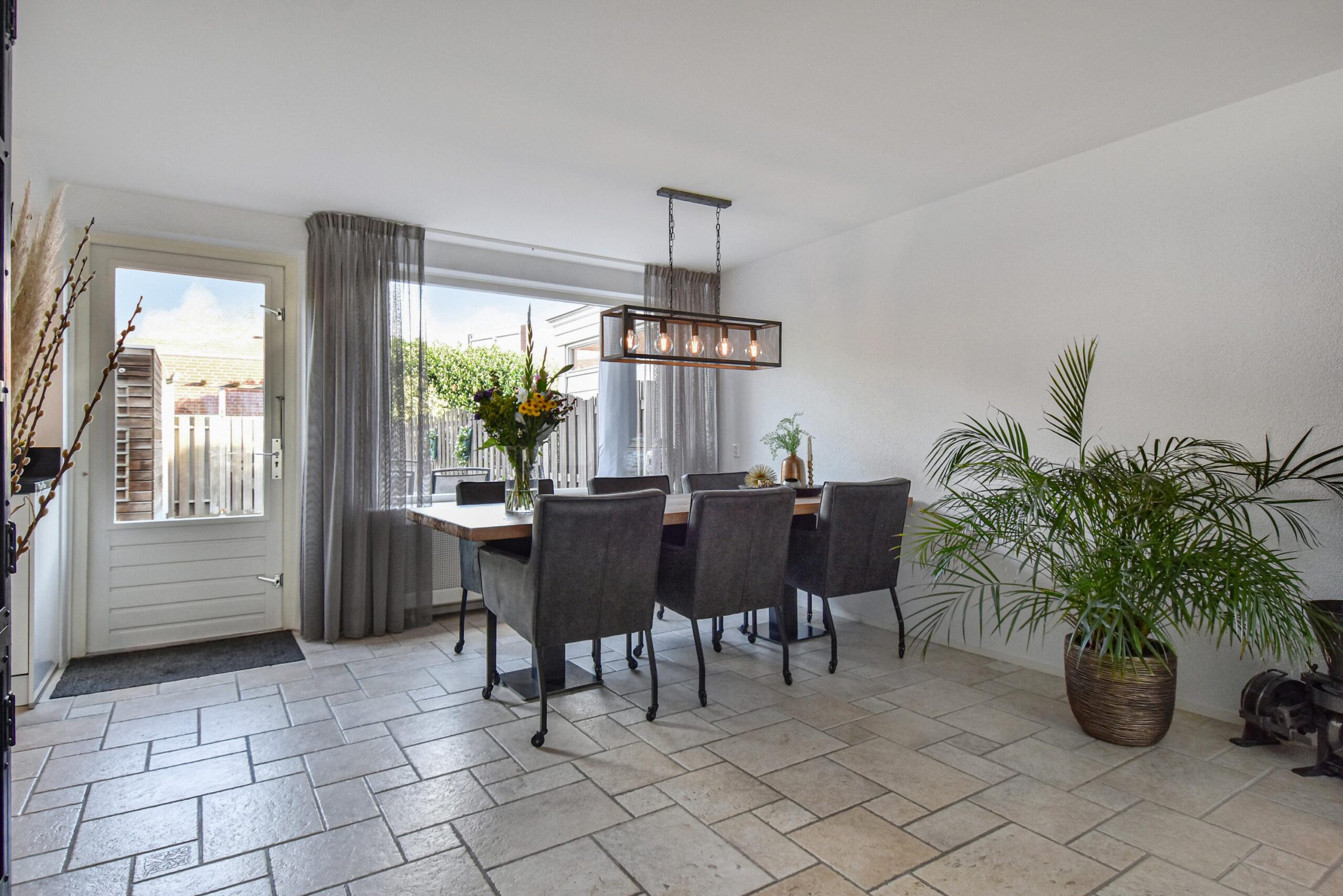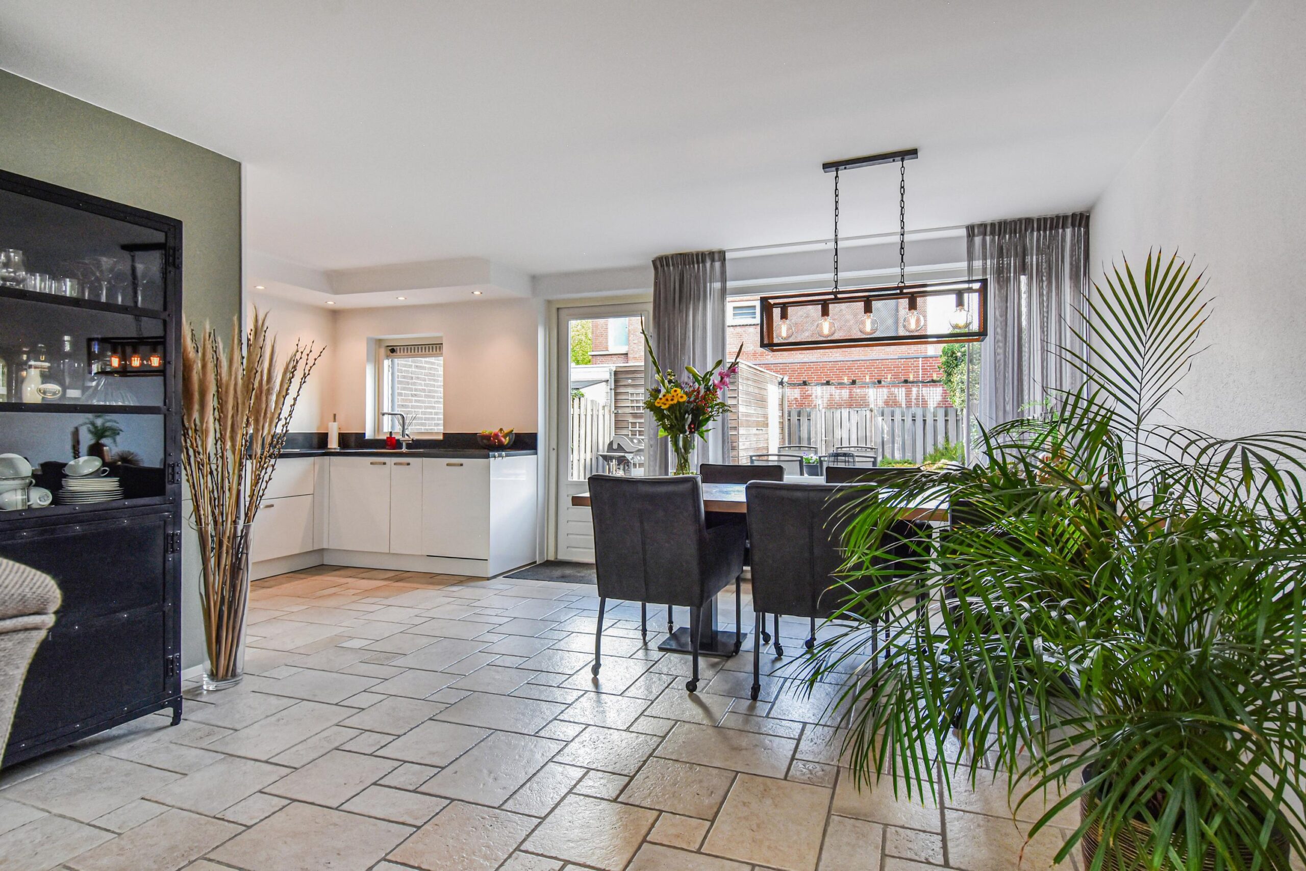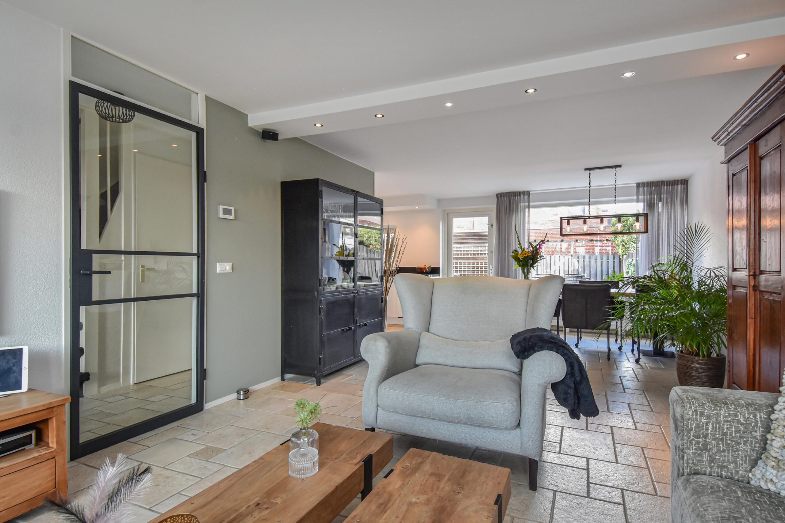 Via de verzorgde voortuin kom je binnen in de hal met meterkast, trapkast en een modern toilet met fonteintje. De lichte woonkamer is ruim opgezet en voorzien van een openslaande deur naar de achtertuin, wat zorgt voor een prettige verbinding tussen binnen en buiten. De open keuken aan de achterzijde is uitgerust met diverse inbouwapparatuur, waaronder een inductiekookplaat, koelkast, combi-oven/magnetron, close-in boiler en een vaatwasser.