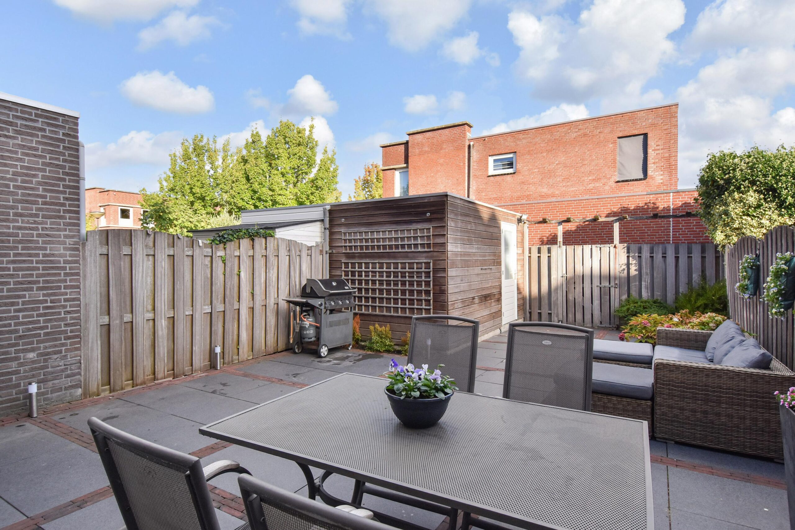 De achtertuin ligt op het noordwesten, ideaal om in de middag en avond van de zon te genieten. Achterin de tuin bevindt zich een vrijstaande berging met elektra en een handige achterom.