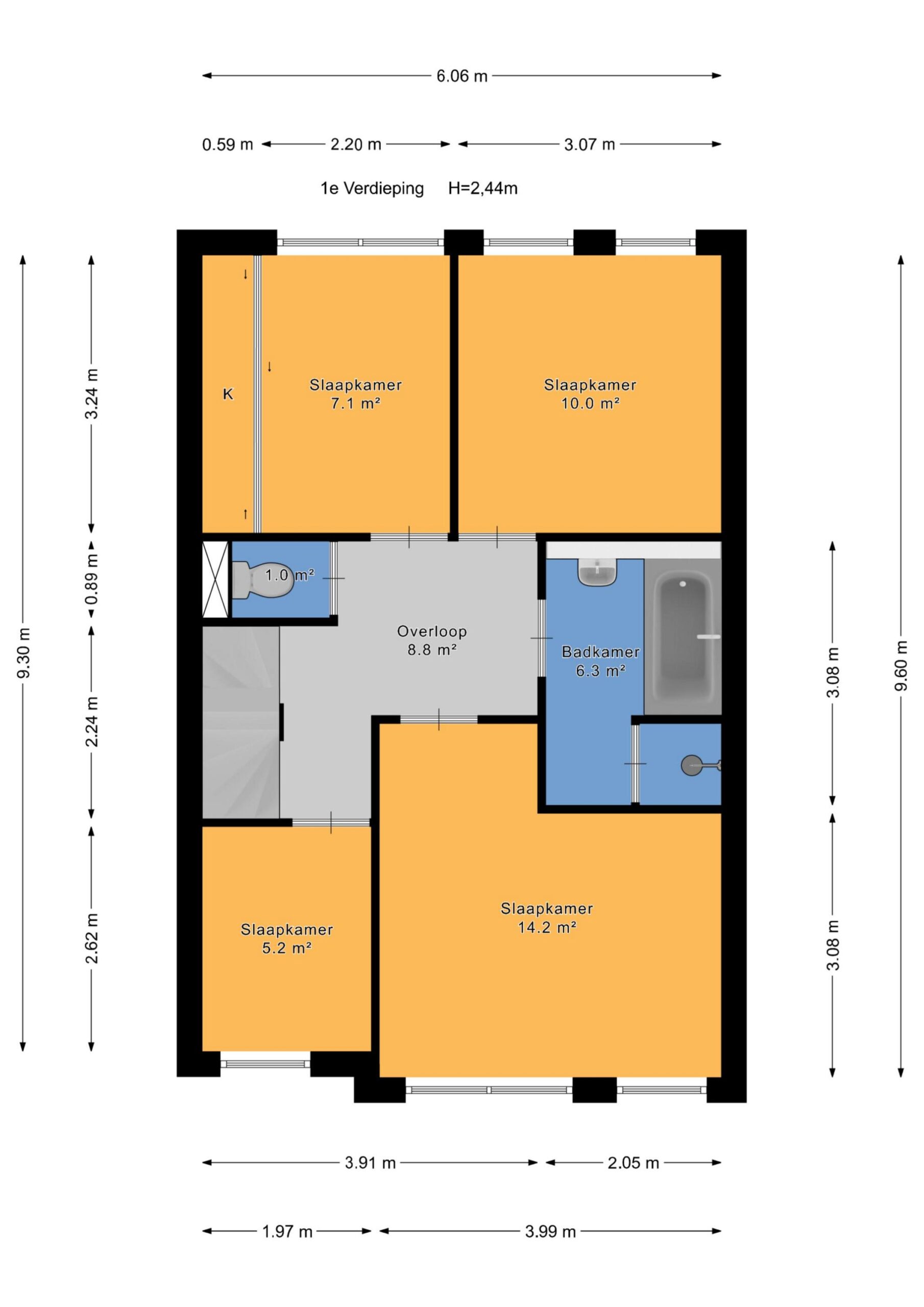 Op de overloop is een apart tweede toilet. Aan de voorzijde ligt een zijslaapkamer, ideaal als werk- of studeerkamer, en daarnaast een royale slaapkamer met airconditioning. De badkamer is voorzien van een whirlpool bubbelbad, aparte douchecabine, wastafelmeubel en handdoekradiator. Aan de achterzijde bevinden zich nog twee slaapkamers, alle met prettige lichtinval.