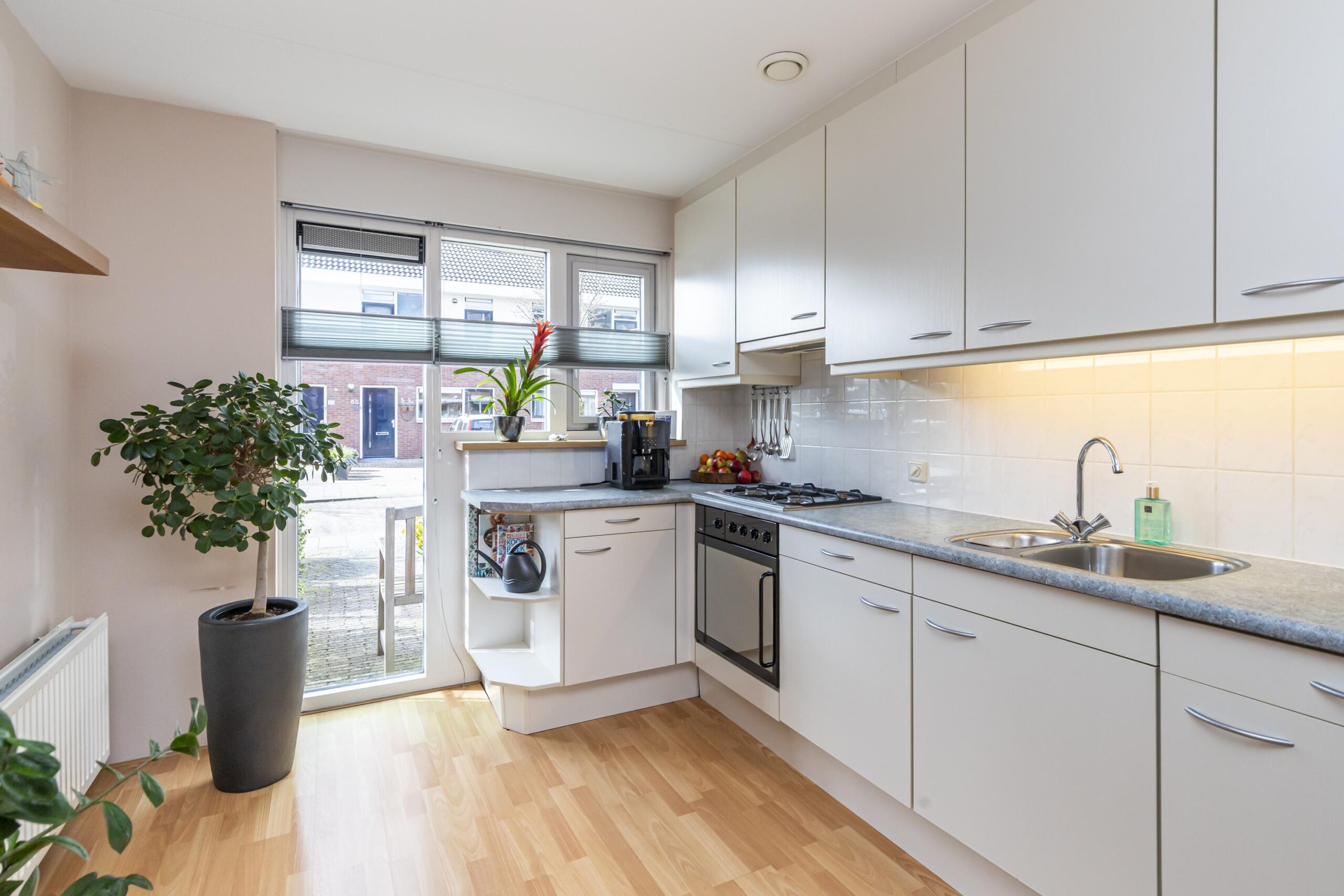 Entree in de hal met modern toilet met fonteintje, meterkast en trapopgang. Lichte, tuingerichte woonkamer met trapkast, laminaatvloer en openslaande deuren naar de 10 meter diepe achtertuin op het noordoosten met berging en achterom. De keuken bevindt zich aan de voorzijde van de woning en is voorzien van gaskookplaat, afzuigkap, vaatwasser en een oven.