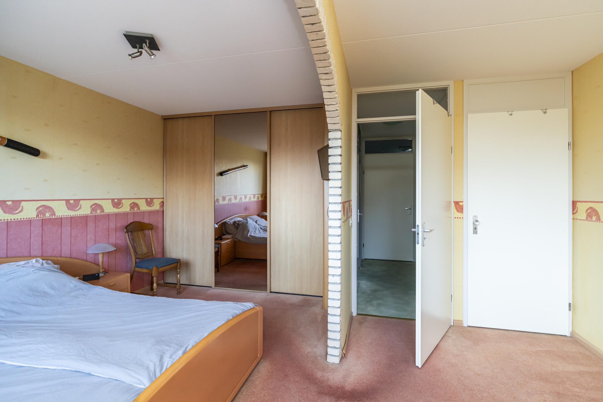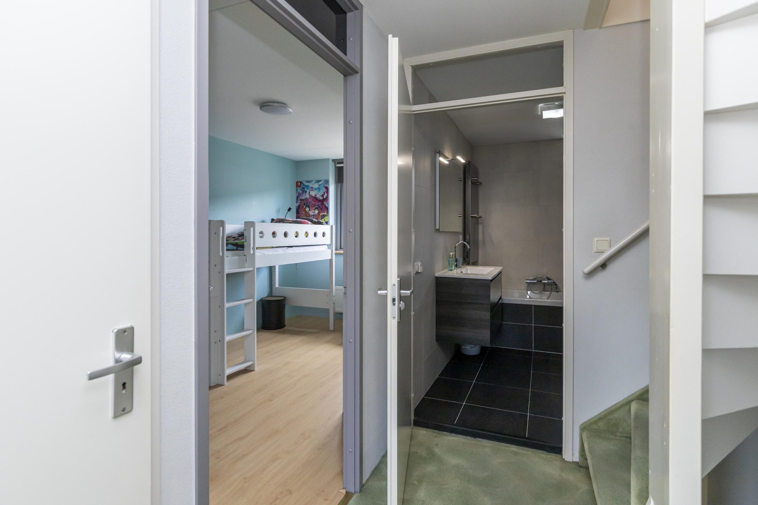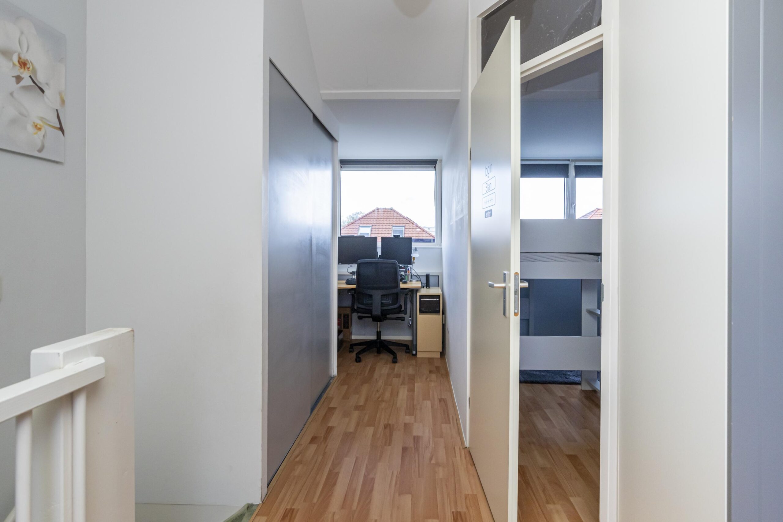 Overloop met toegang tot alle ruimtes. Op deze verdieping treft u een zeer grote slaapkamer aan de achterzijde die eenvoudig op te delen is in twee slaapkamers. Aan de voorzijde van de woning nog een ruime slaapkamer en de badkamer met douchecabine, ligbad, vrij hangend toilet en wastafelmeubel.