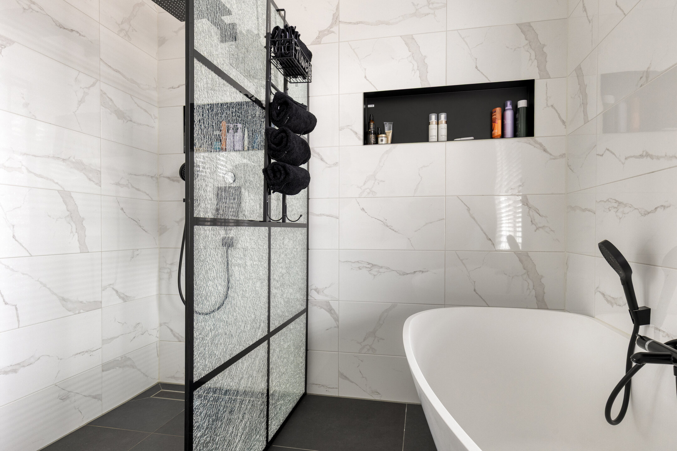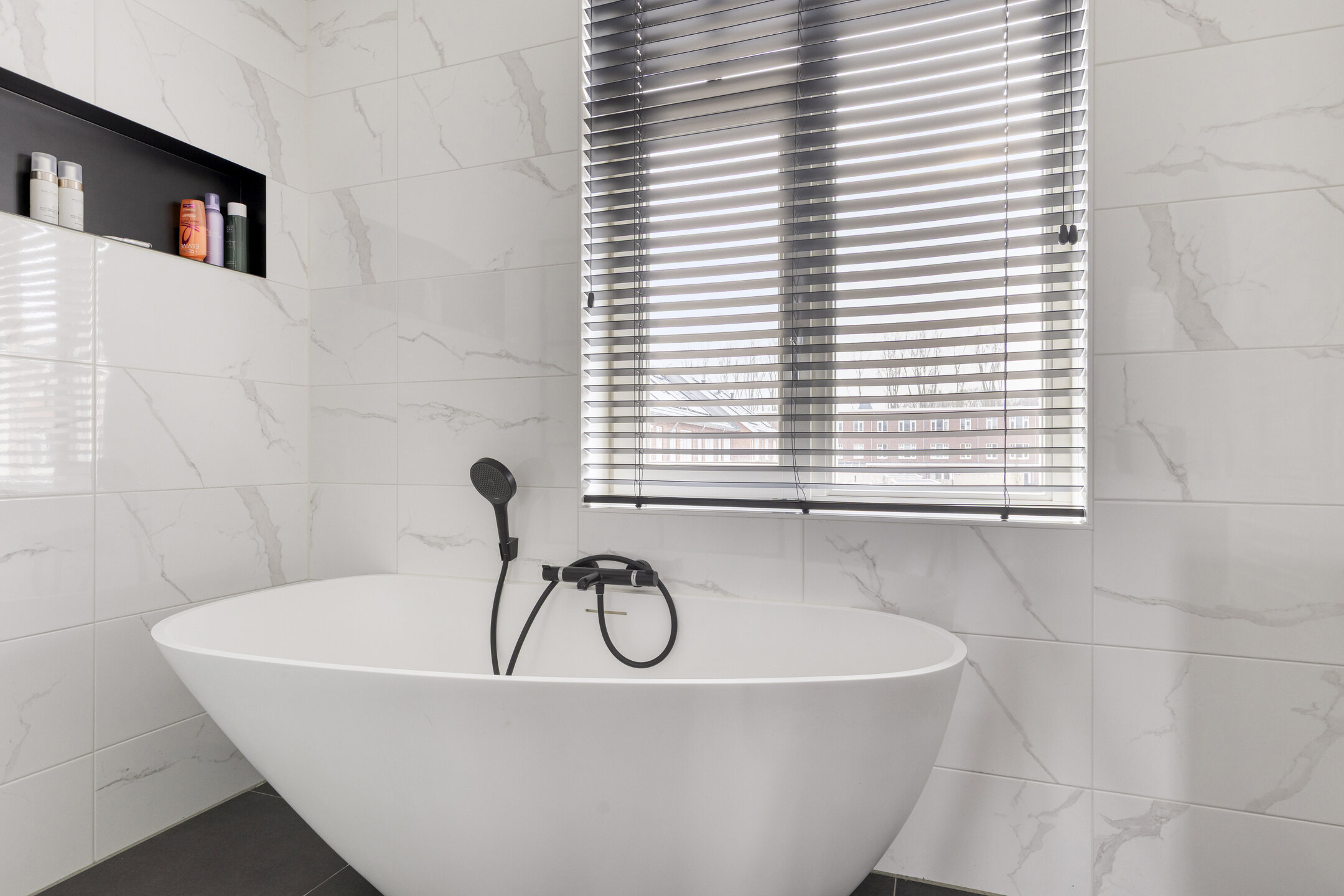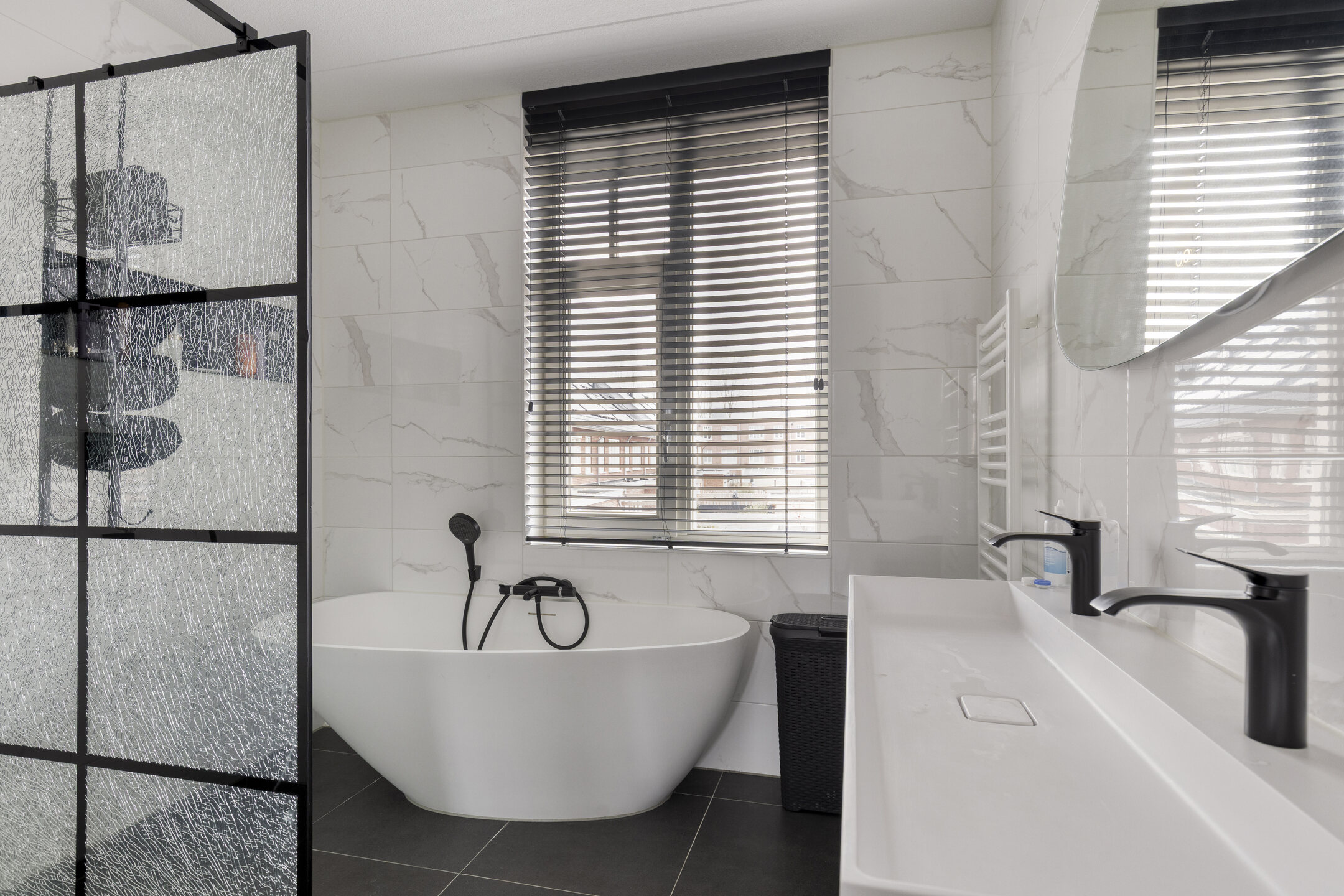 - Badkamervoorzieningen Ligbad, dubbele wastafel, inloopdouche, vloerverwarming