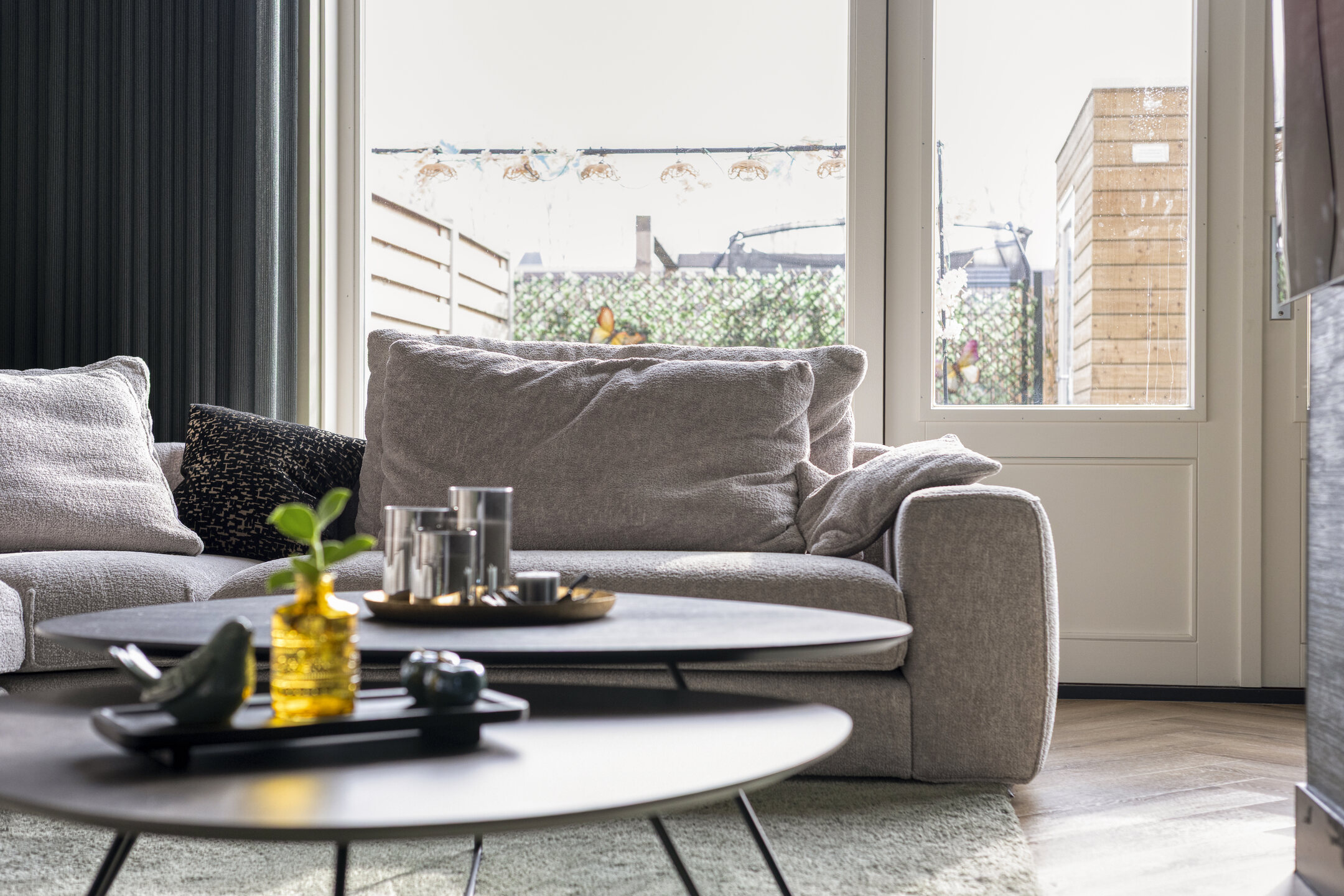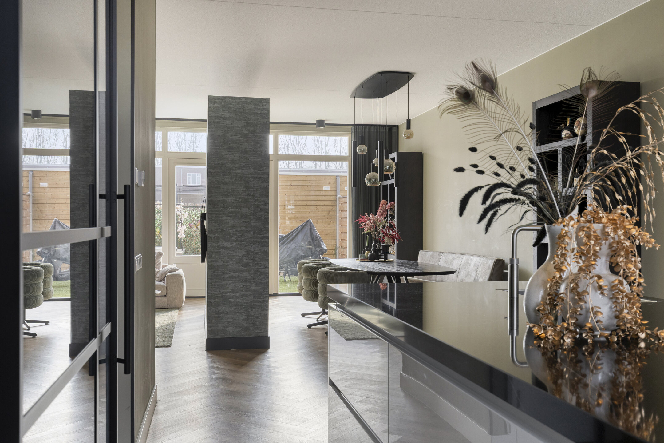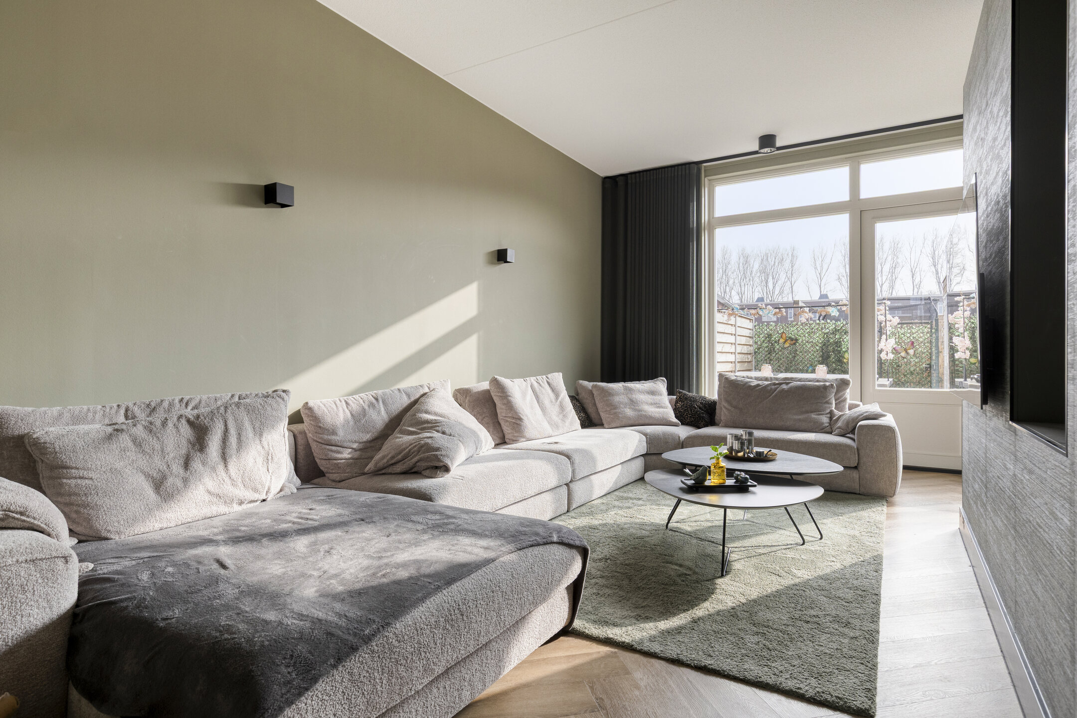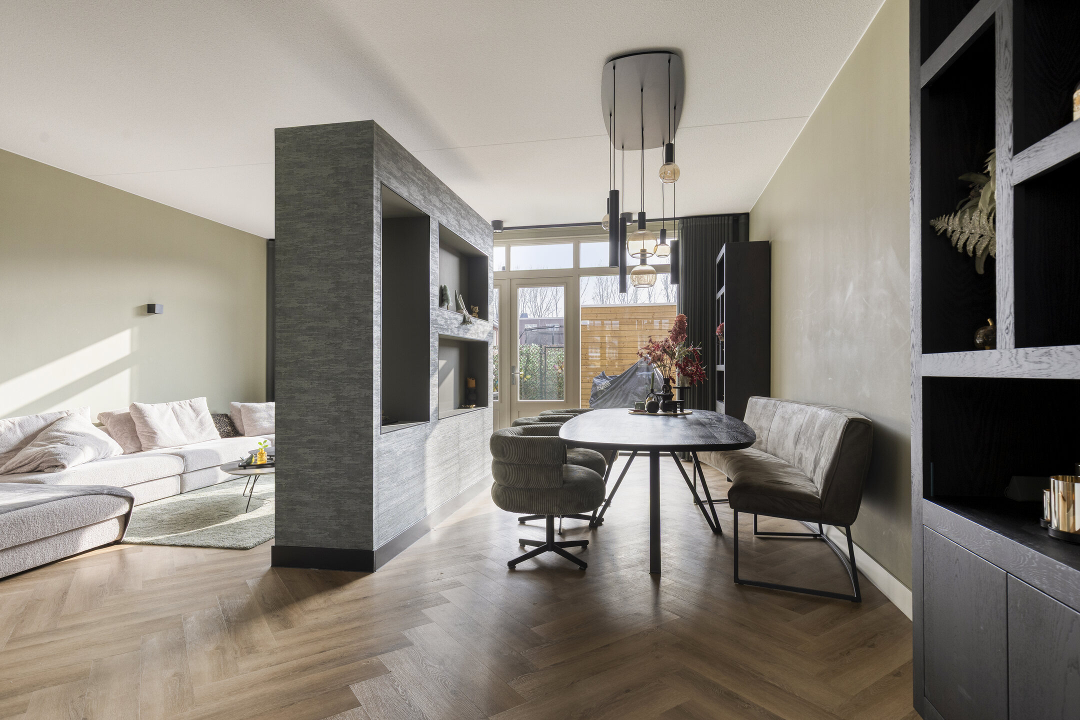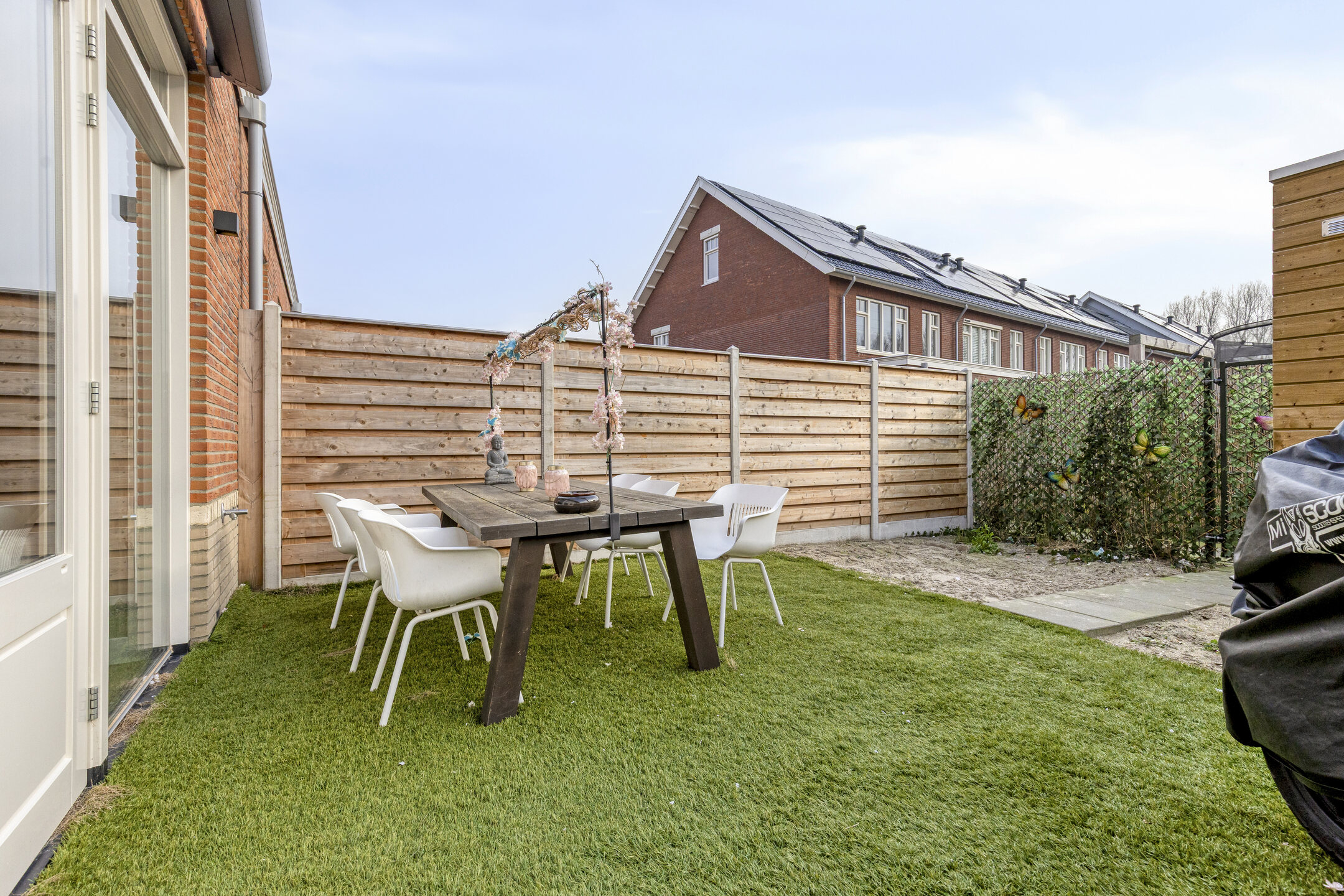 Aan de achterzijde van de woning bevinden zich de woonkamer en eetkamer. Deze ruimtes worden op een speelse manier van elkaar gescheiden door een gedeeltelijke muur, waardoor er een natuurlijke indeling ontstaat zonder het open karakter te verliezen. De grote raampartijen zorgen voor veel lichtinval en geven direct toegang tot de achtertuin. De tuin ligt gunstig op het zuiden, zodat u hier vrijwel de hele dag van de zon kunt genieten. Achterin staat een berging en via de achterom bereikt u het parkeerterrein met uw eigen parkeerplaats.